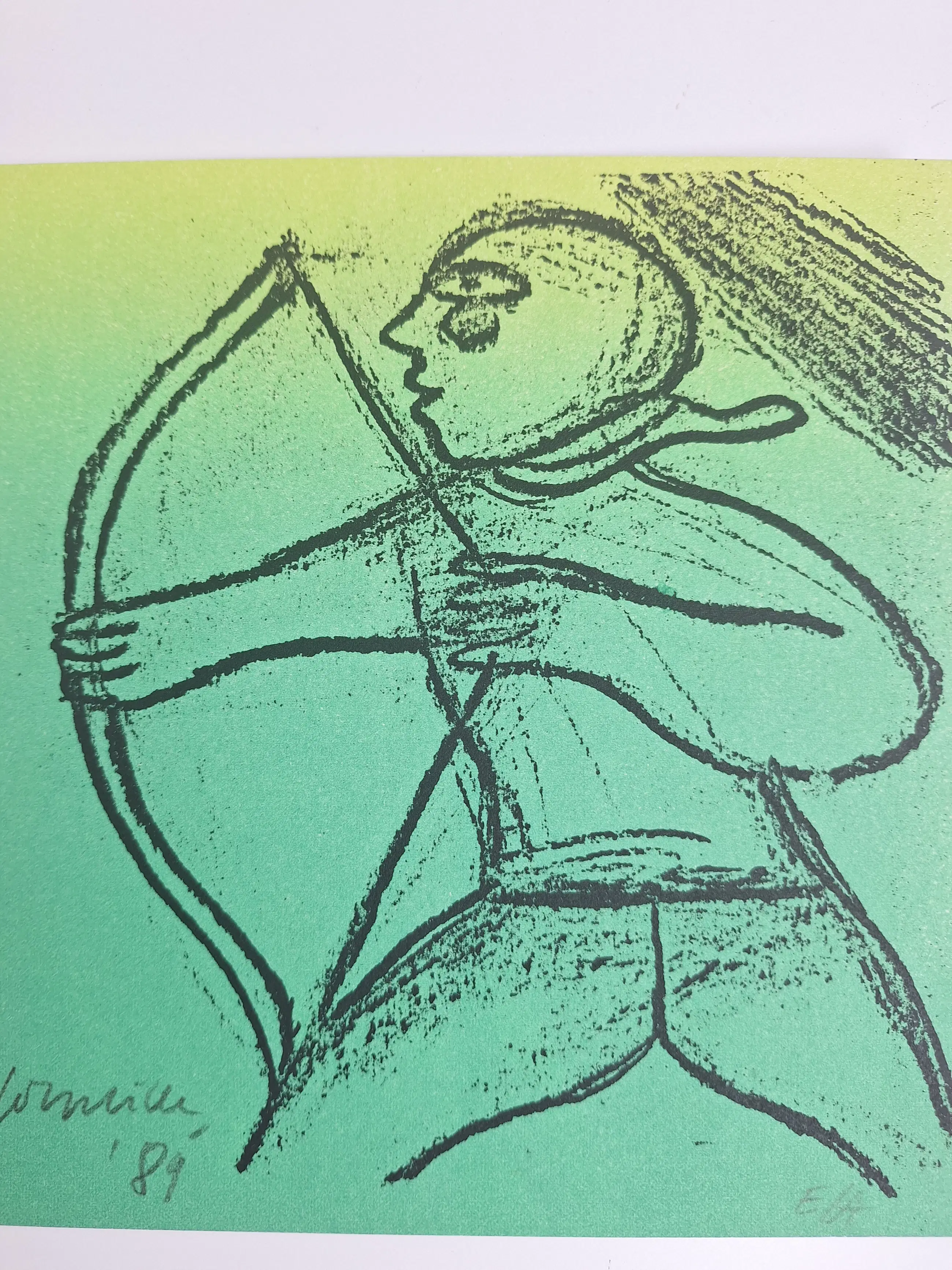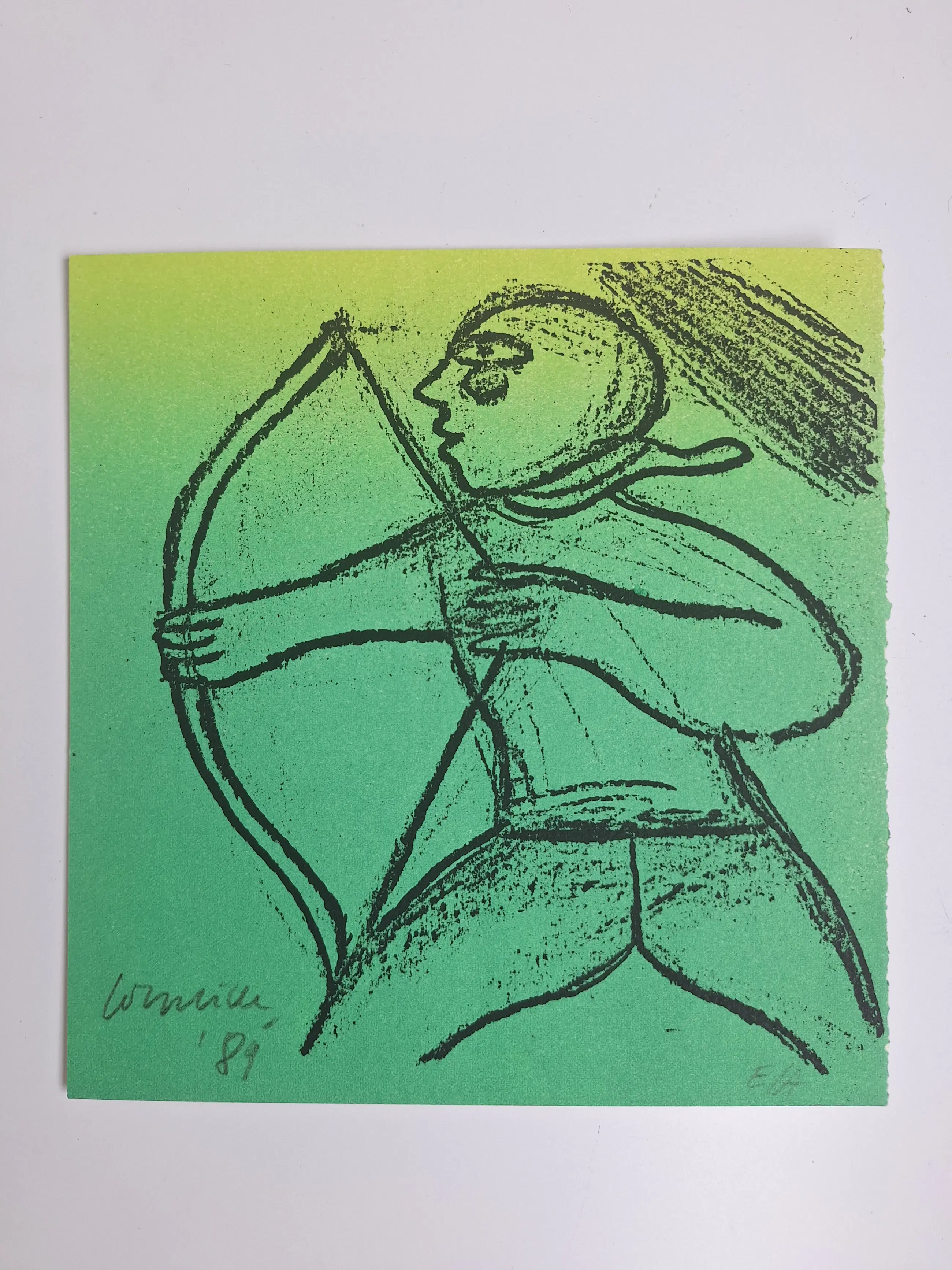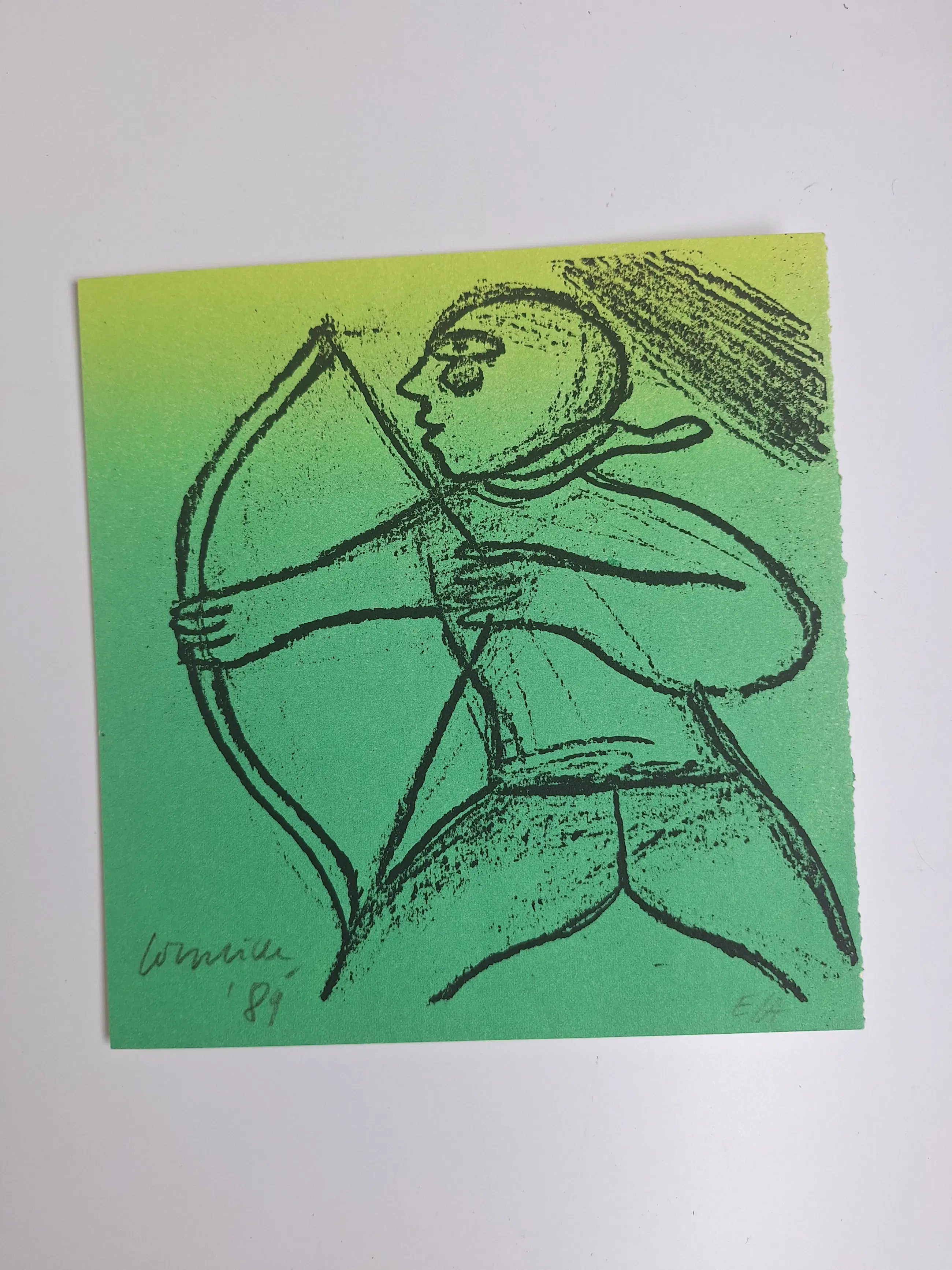Prachtige zeefdruk van kunstenaar Corneille. Het betreft het stuk boogschutter uit de sterrenbeelden serie uit 1989. Het stuk is handgesigneerd en E.A. (proefdruk van de kunstenaar zelf.) 20 x 19,5 cm In goede staat
