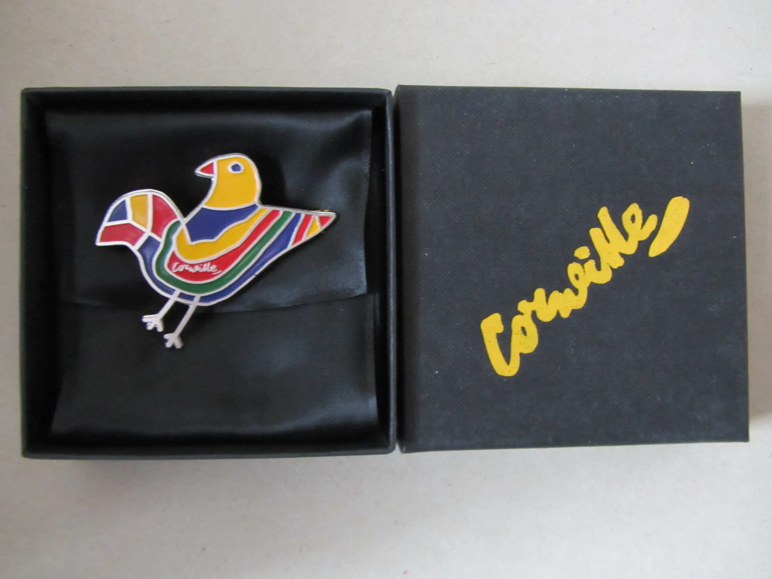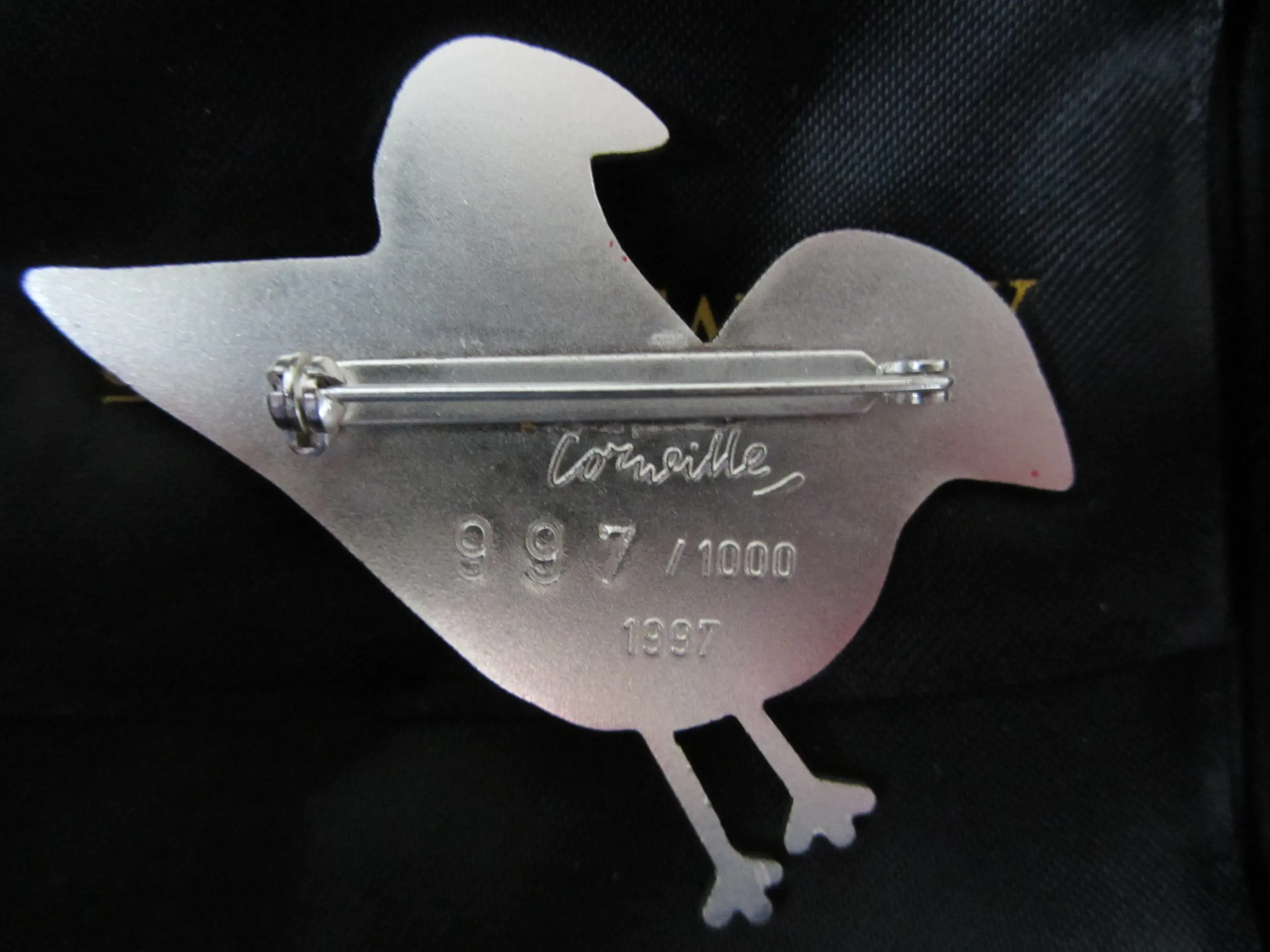 Broche Corneille uit 1997, met oplagenummer 997/1000, uitgegeven door Jaski Art Gallery. Op zowel de voor als achterkant drukgesigneerd. In orginele doos.