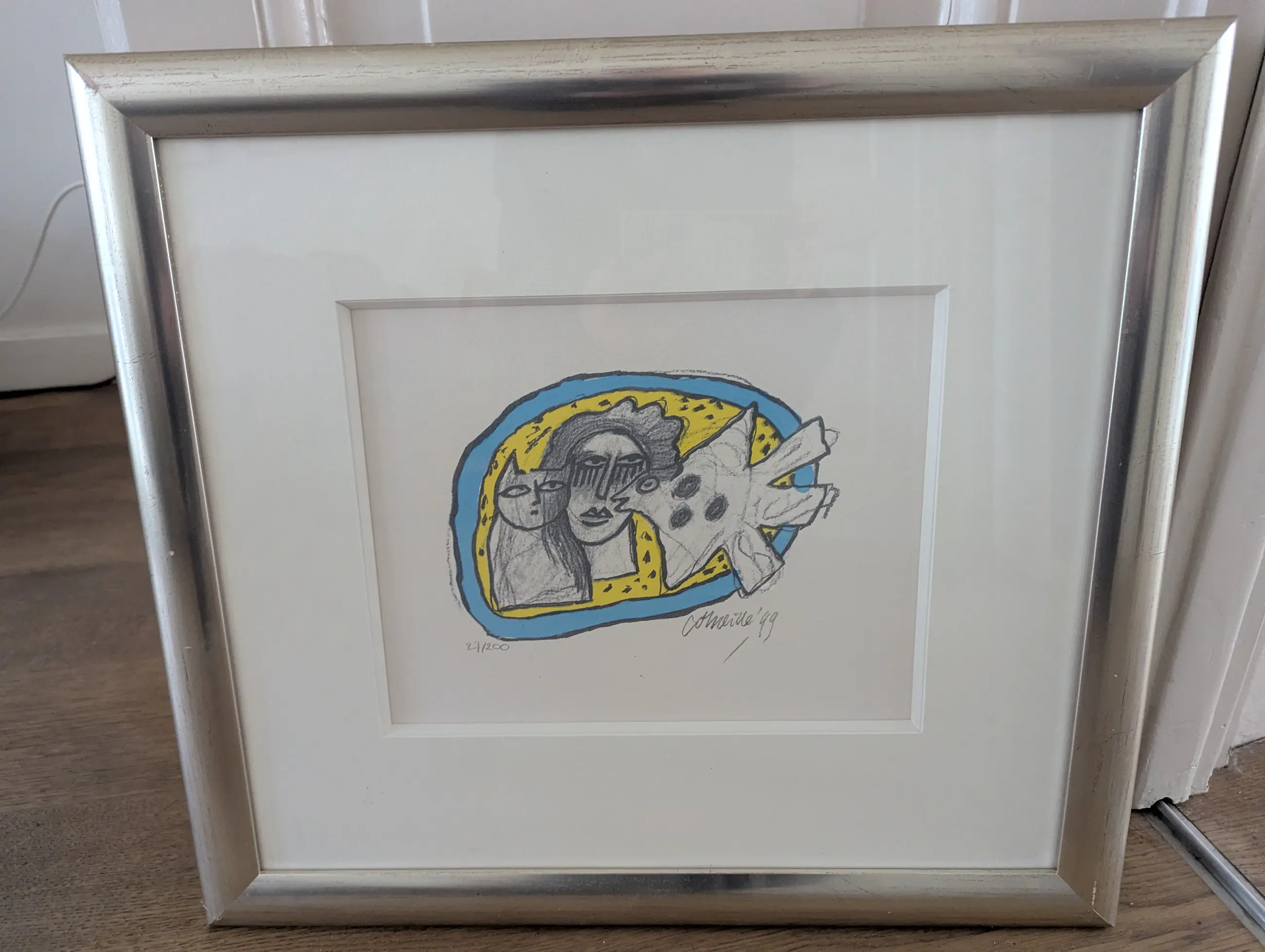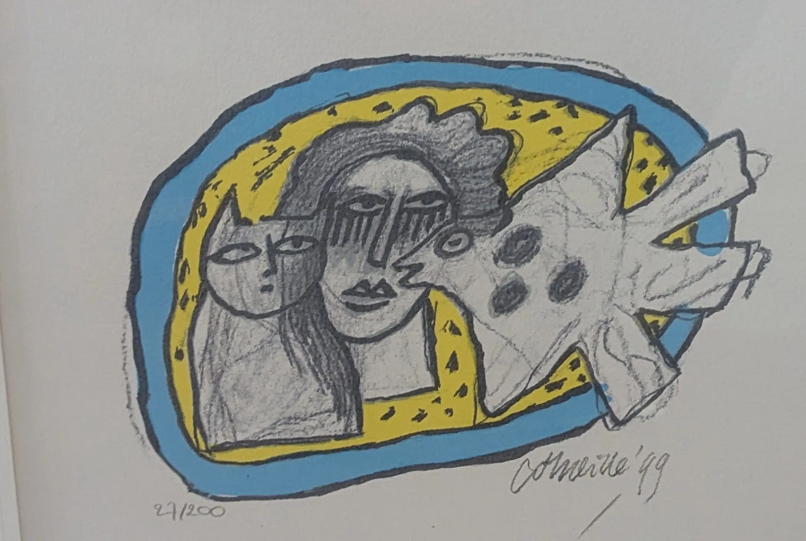Dit is een originele kleurenlitho van de Nederlandse Cobra-kunstenaar Guillaume Corneille (Guillaume Cornelis van Beverloo). Het kunstwerk heet onder andere 'Vrouw, kat en vogel in geel blauw' of 'Woman, Cat and Bird'.
