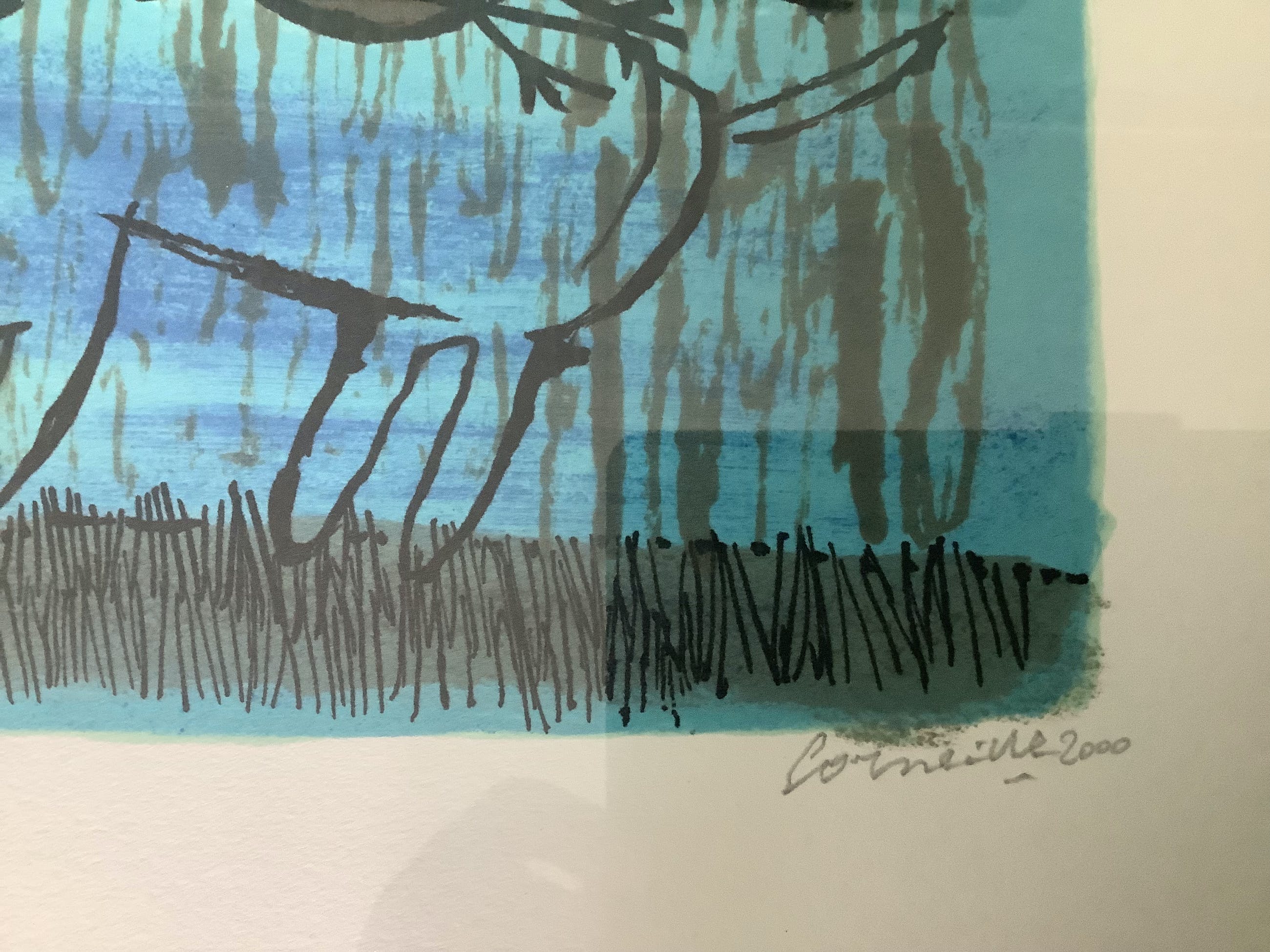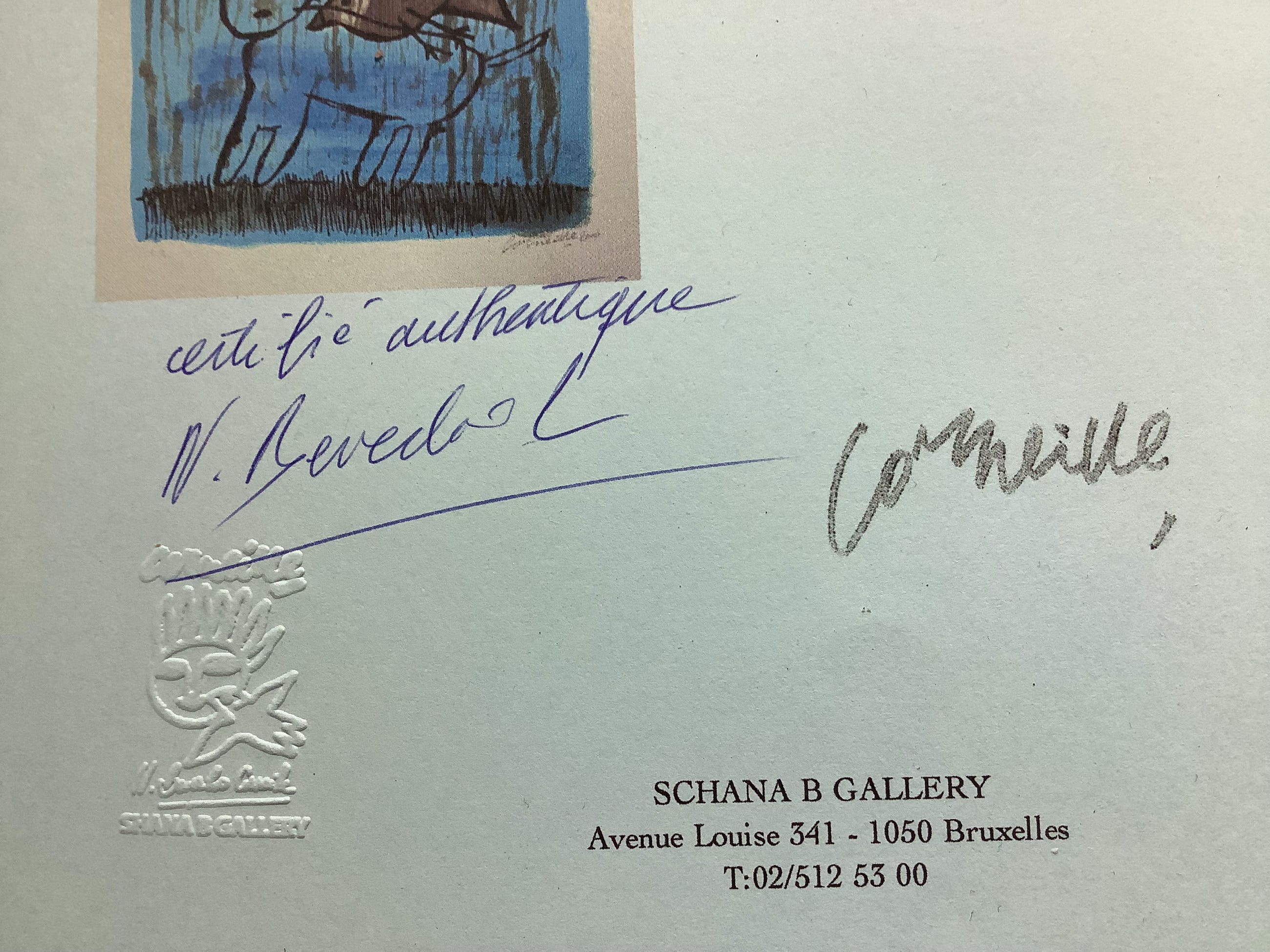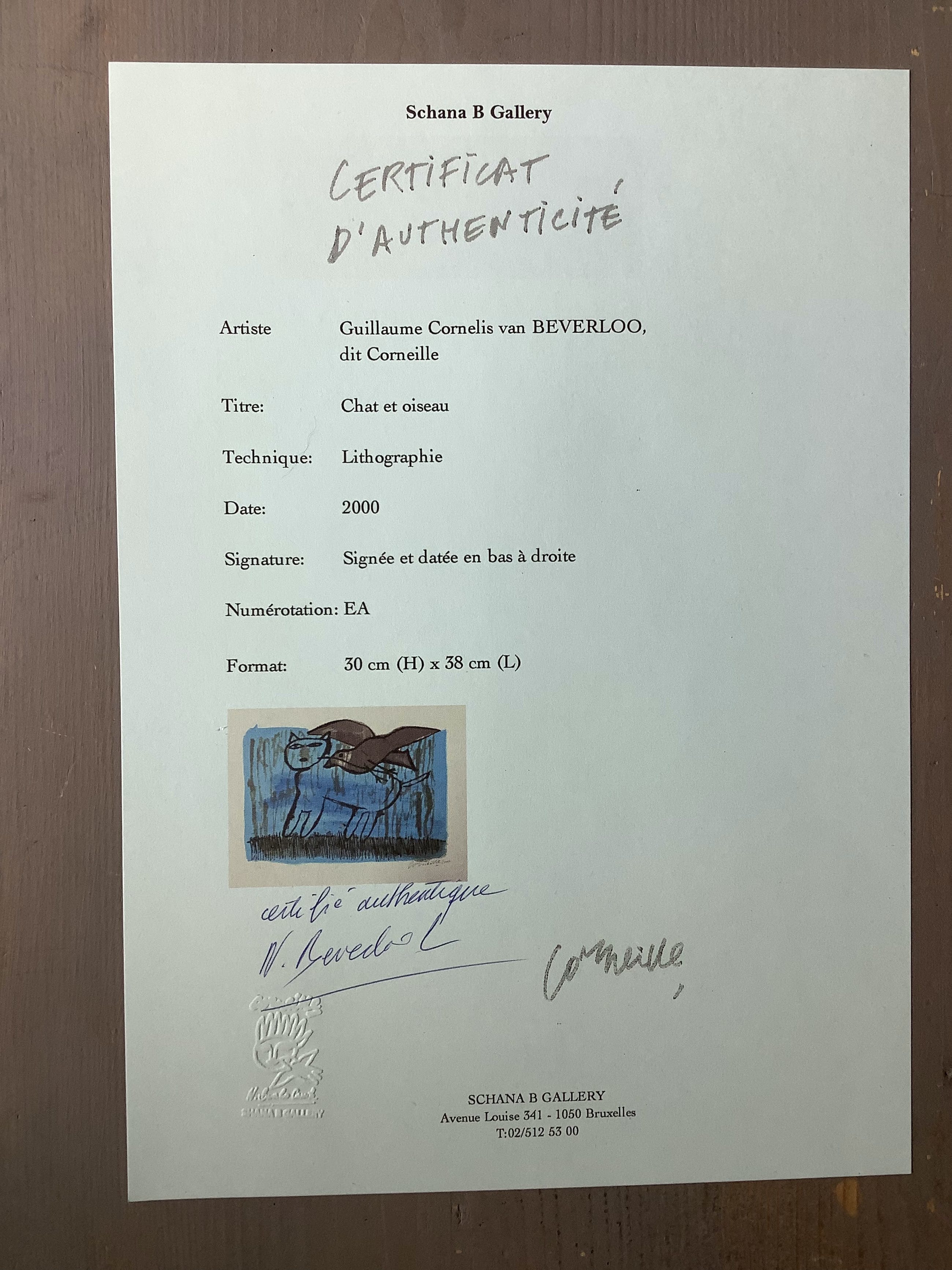 Aangeboden in zilverkleurig aluminium lijst met lichte gebruikersschade. 3 cm breed en 1,7 cm hoog. Certificaat van echtheid bijgeleverd getekend door de weduwe van Corneille.