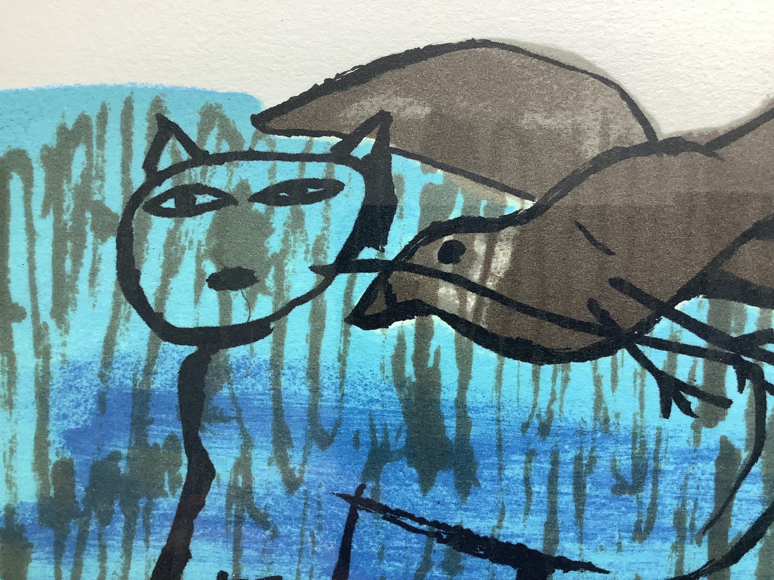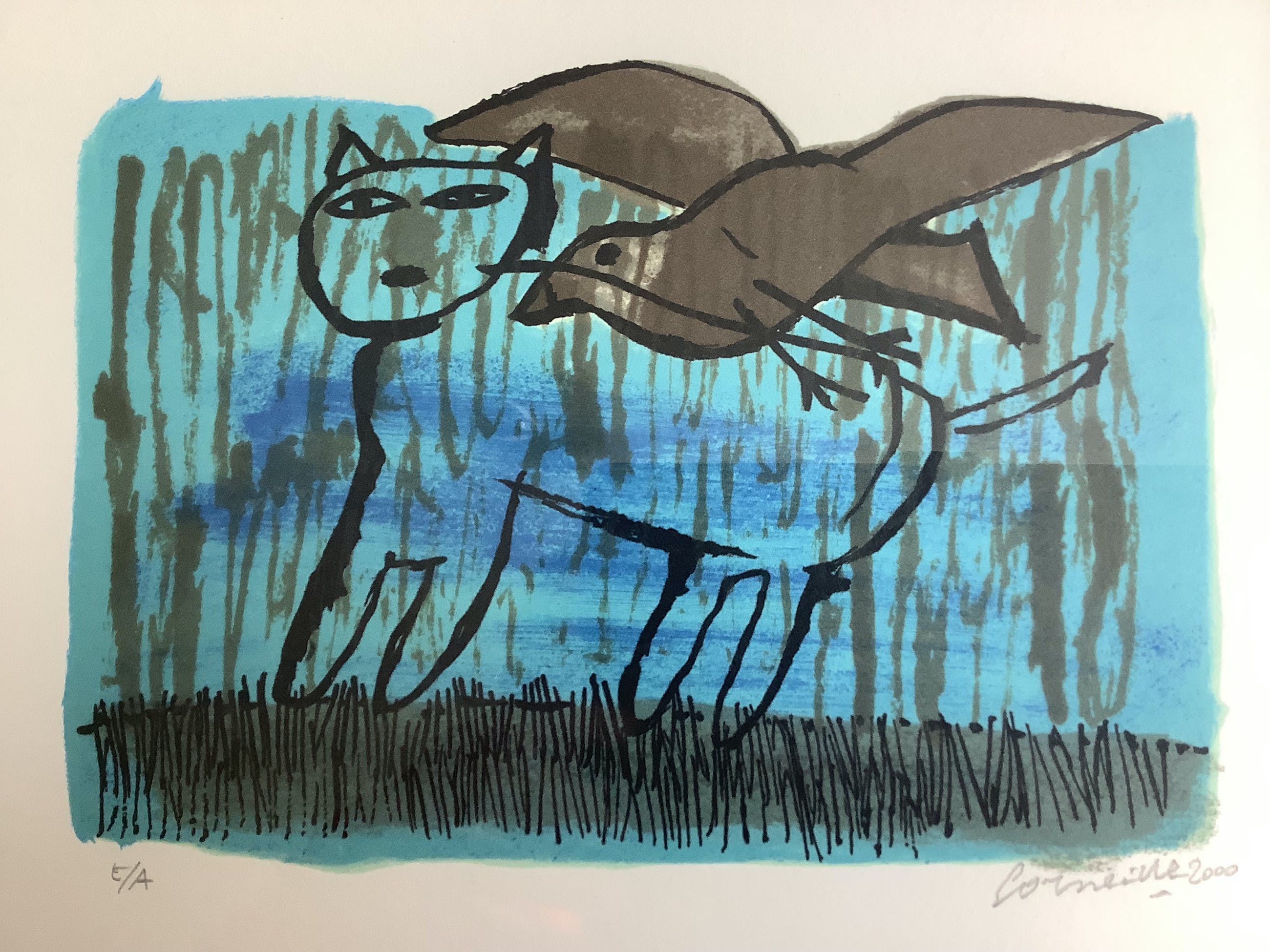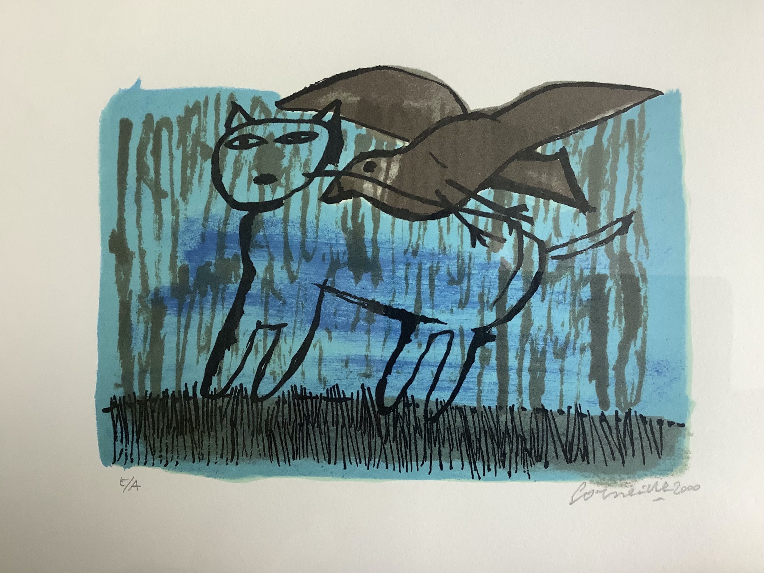 Aangeboden in zilverkleurig aluminium lijst met lichte gebruikersschade. 3 cm breed en 1,7 cm hoog. Certificaat van echtheid bijgeleverd getekend door de weduwe van Corneille.