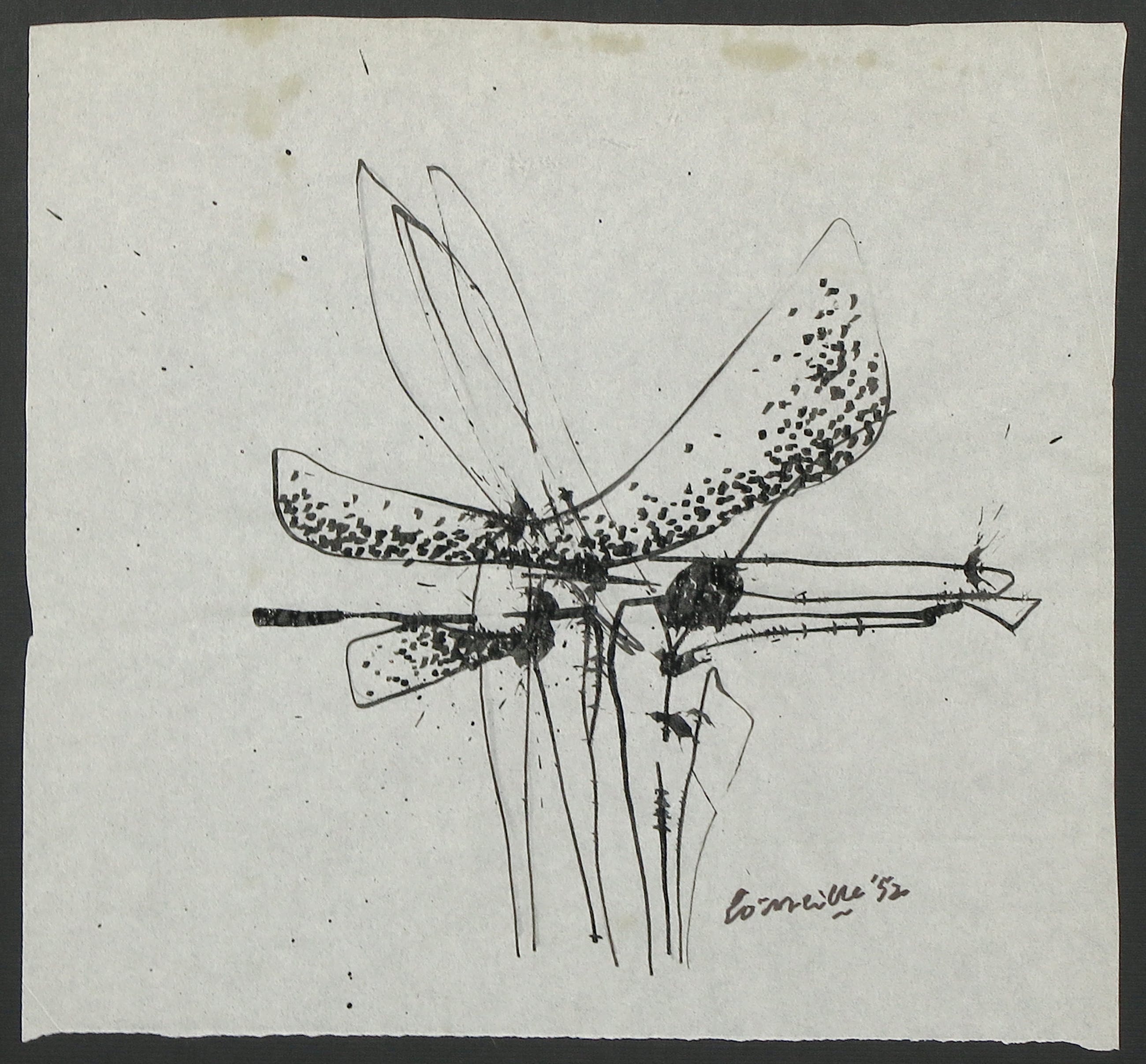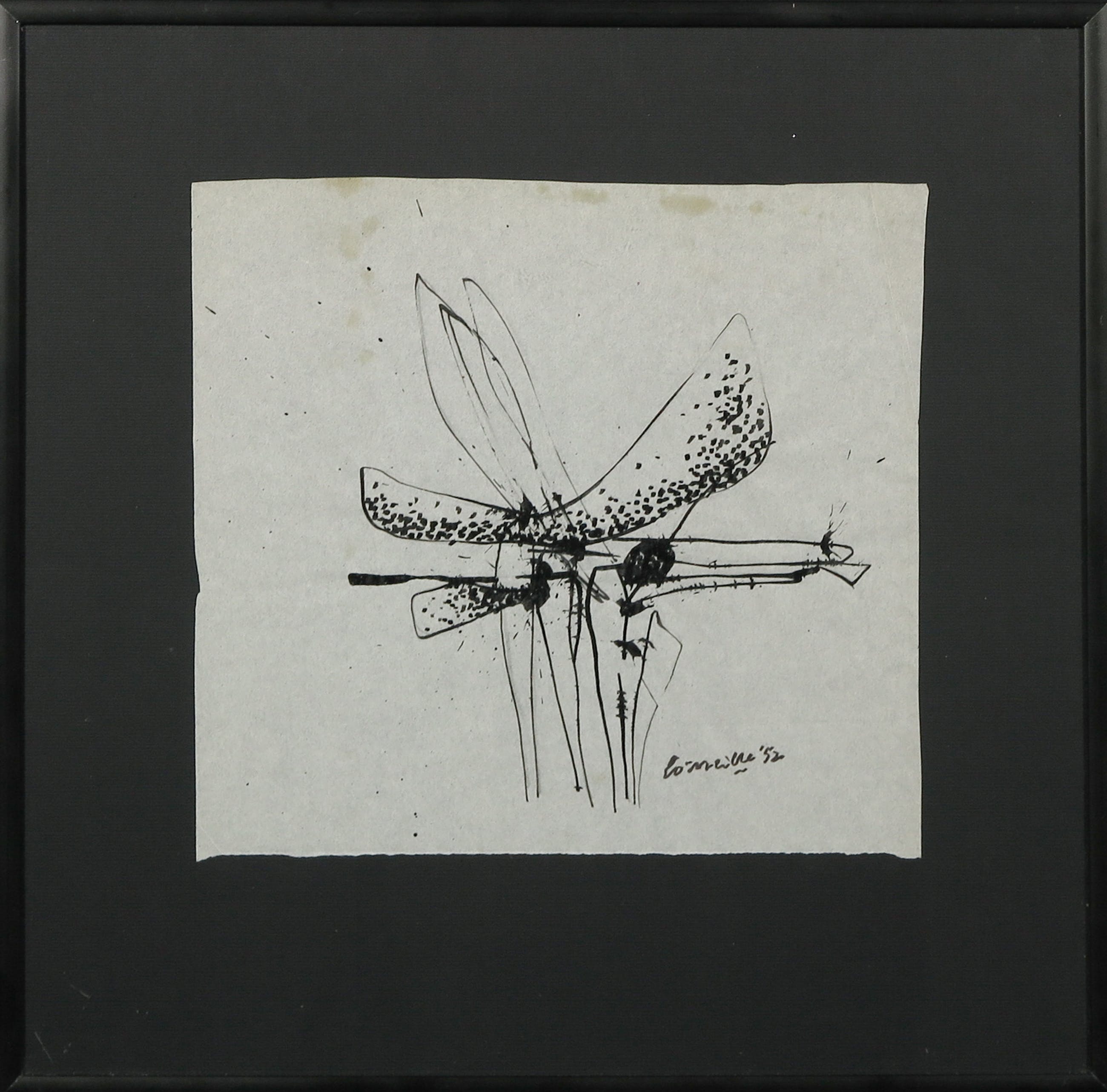 Vroege inkttekening uit 1952 van Corneille. Bij het werk zit een fotocertificaat.