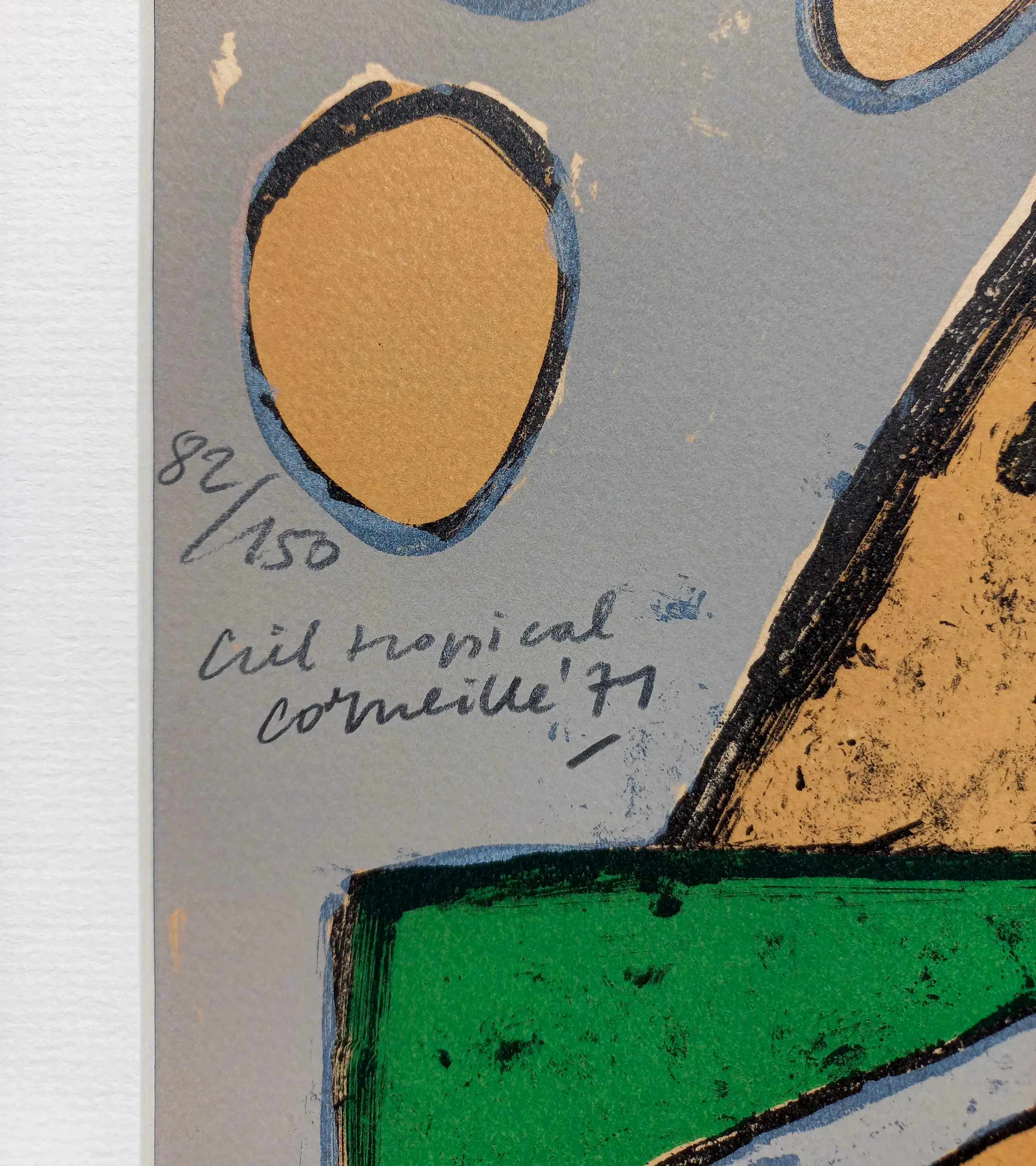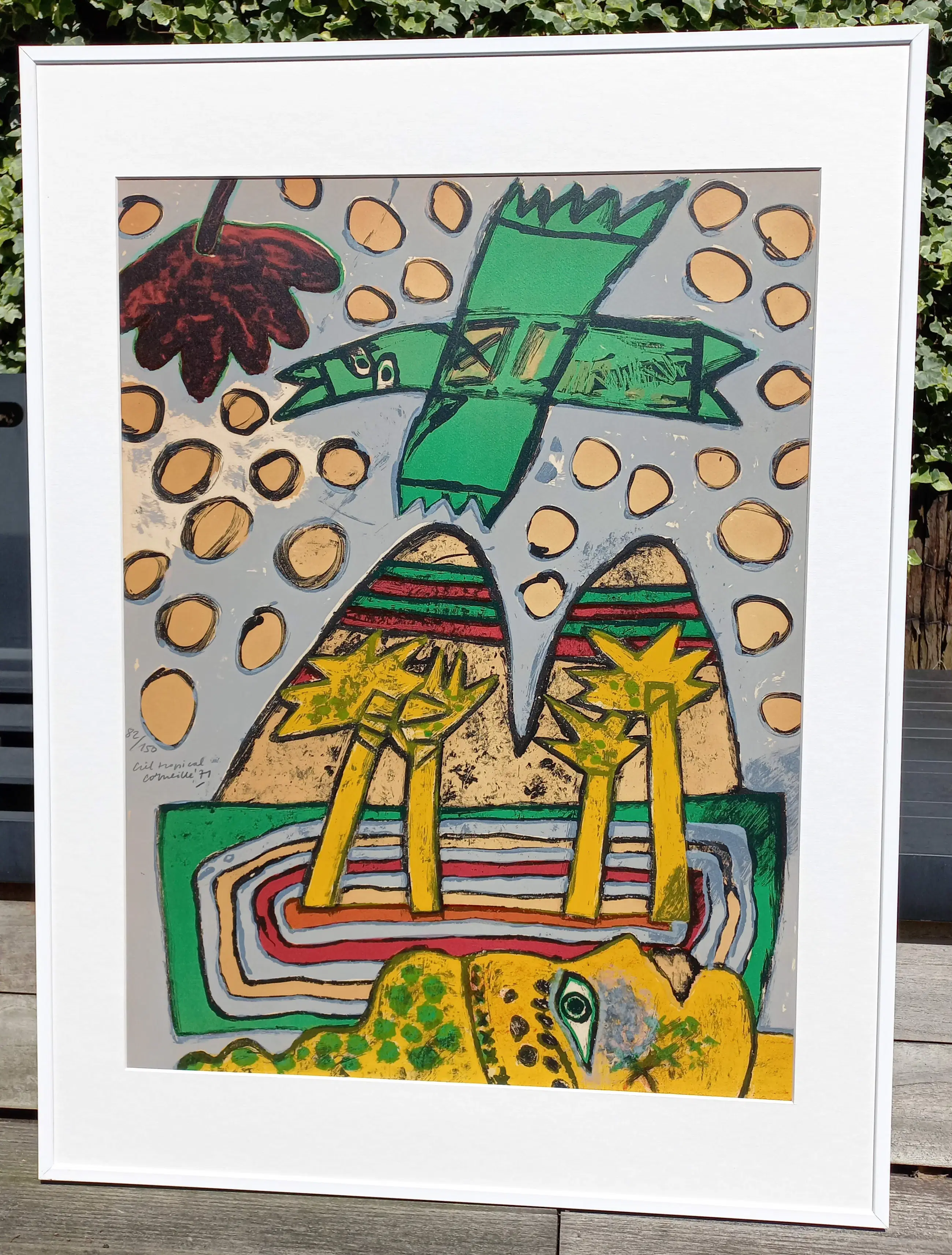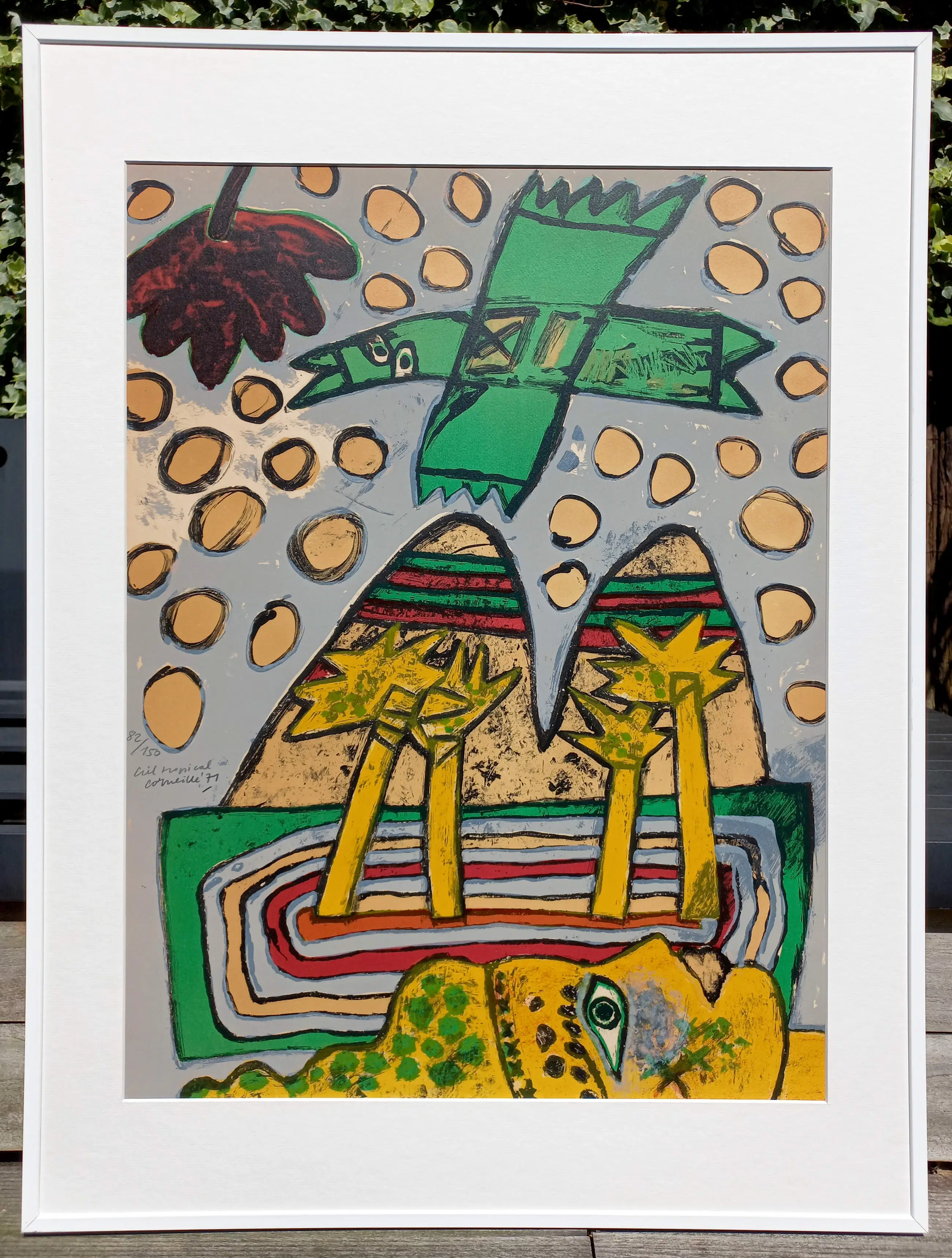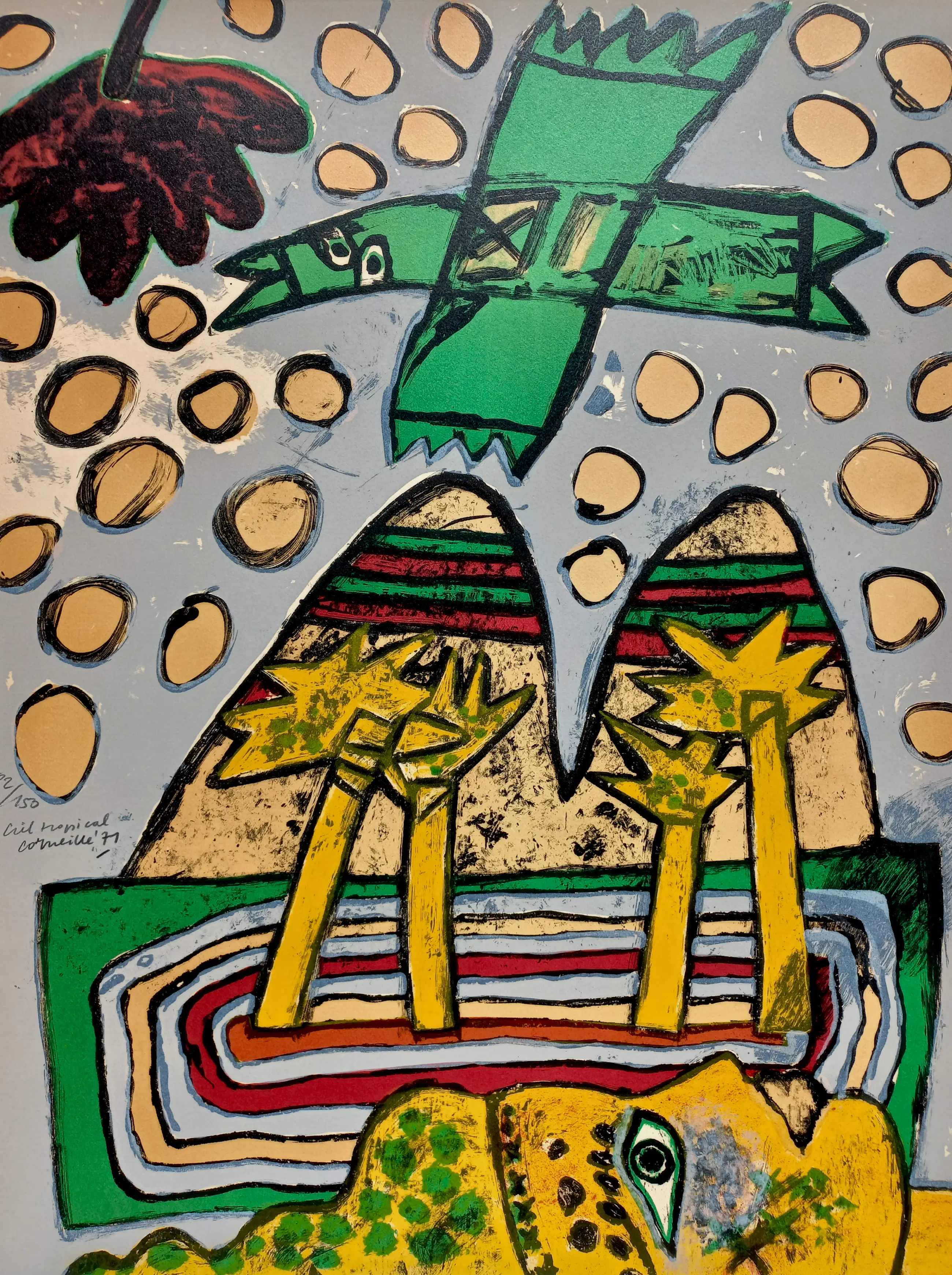 Mooie, karakteristieke compositie van Corneille uit 1971. Litho op geschept papier, met potlood gesigneerd, gedateerd (‘71), getiteld en genummerd (82/150). In nette metalen lijst, zonder glas maar met smetteloos, zuurvrij passe-partout. In goede conditie. Literatuur: Donkersloot 250.