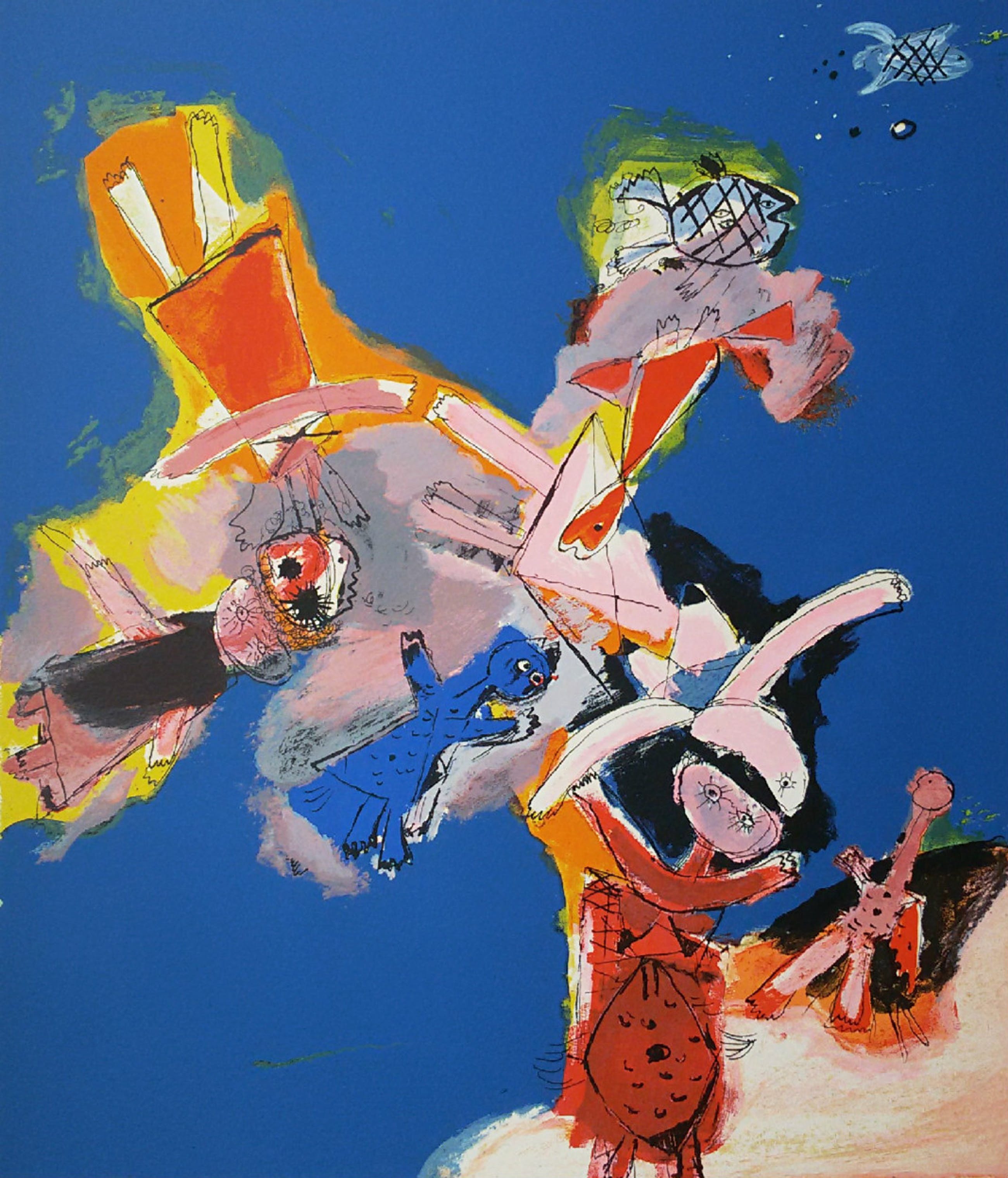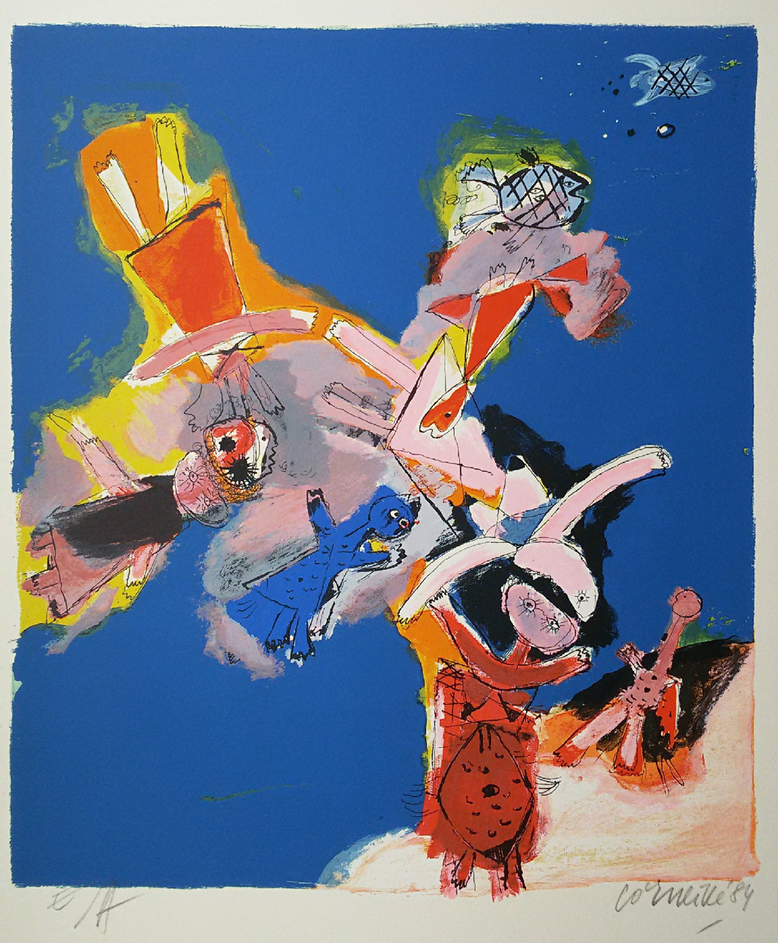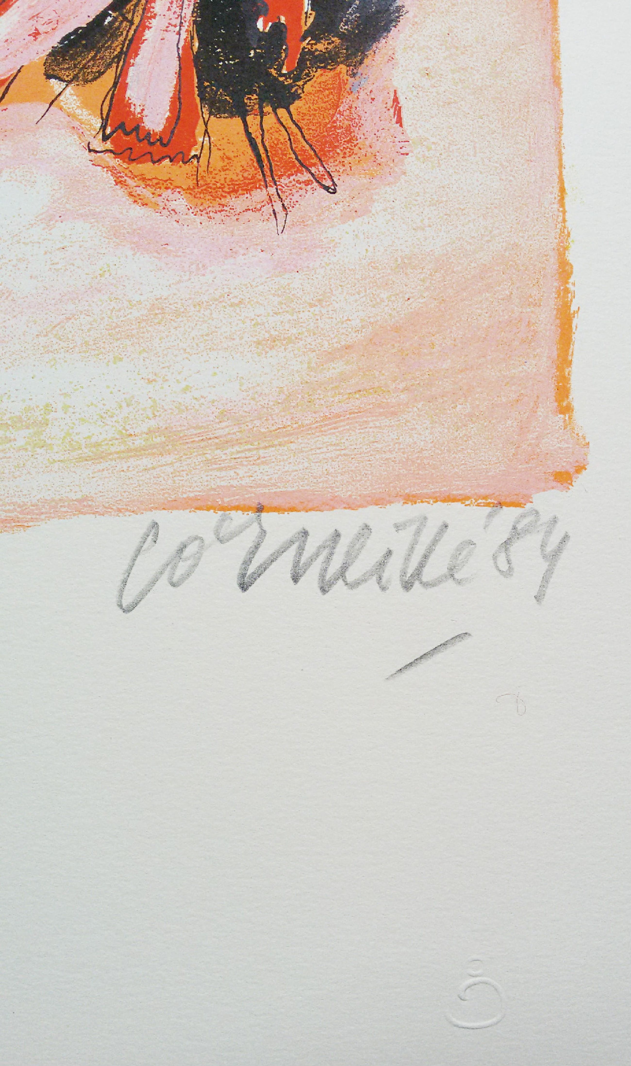 Schitterend werk van Corneille uit 1984, waarin hij teruggrijpt op composities uit zijn vroege CoBrA periode (1948-1949). Zeefdruk op Arches papier, met potlood gesigneerd en gedateerd, een E.A. exemplaar. In mint conditie, blad heeft altijd in een map gelegen.
