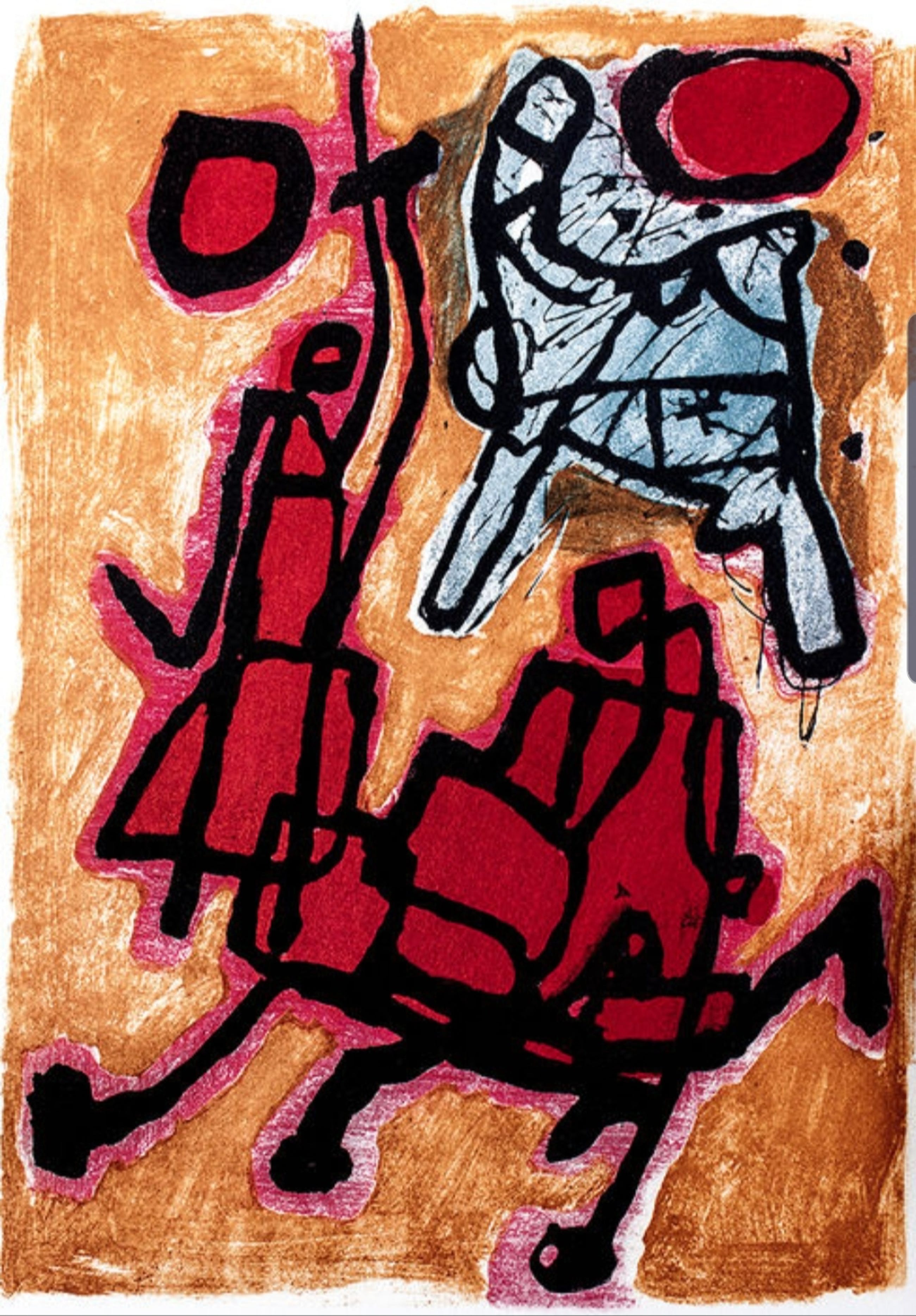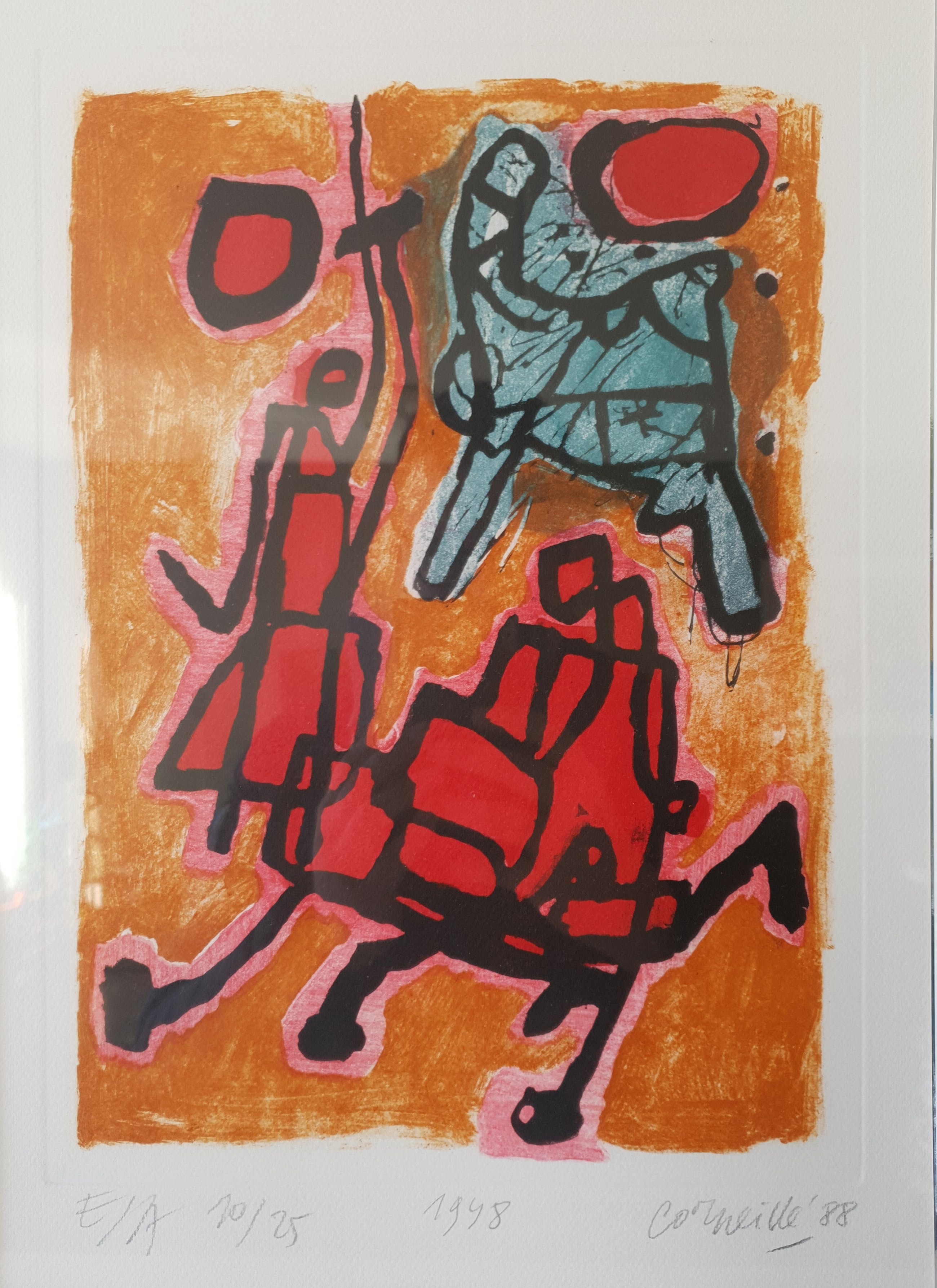 Een prachtige ets/aquatint uit 1988, gemaakt 40 jaar na de oprichting van de Cobra groep in 1948. Uitgegeven door Galleria San Carlo Milano en Galleria Pallazzo Vecchio Firenze op speciaal voor Corneille vervaardigd handgeschept papier met de signatuur van Corneille als watermerk.