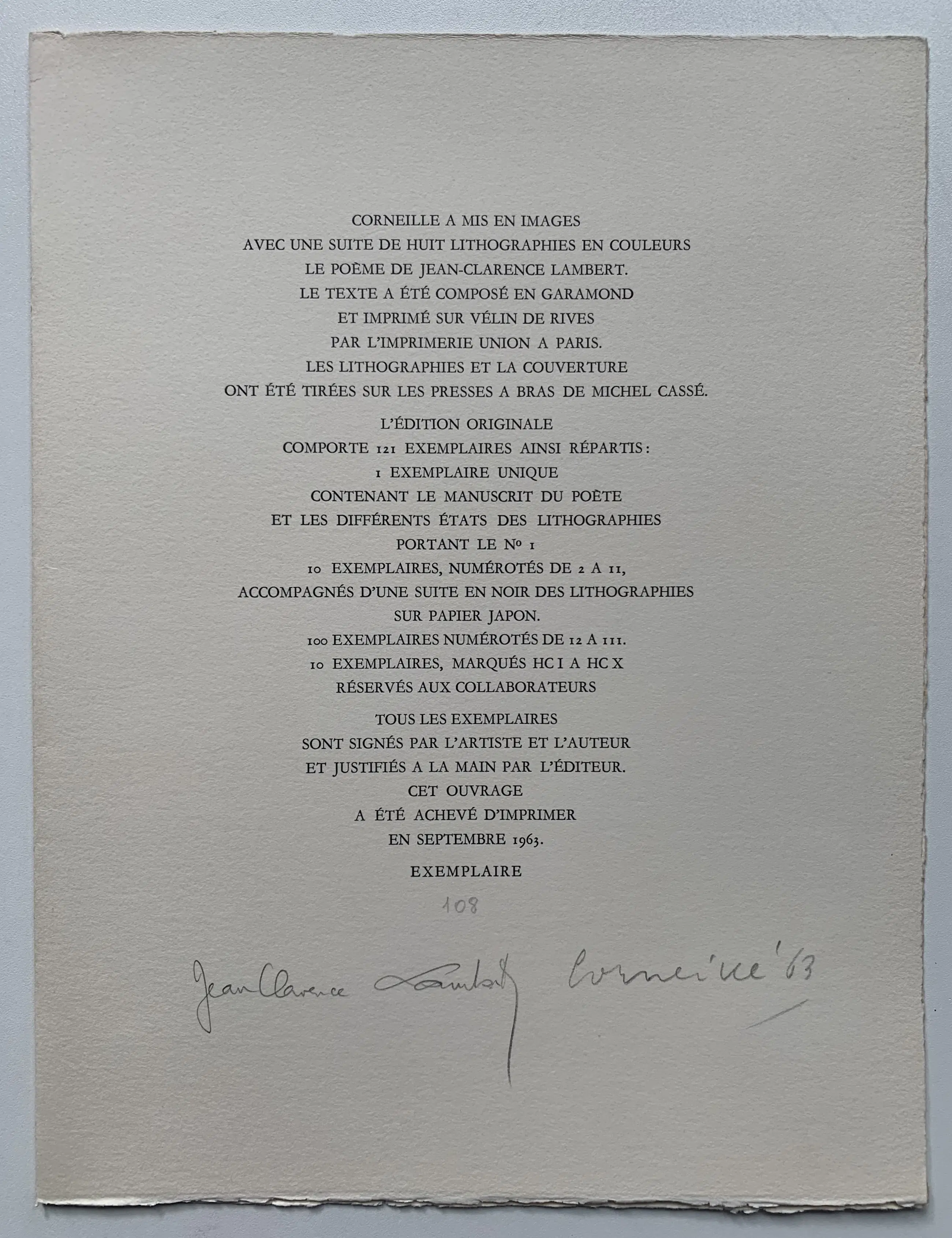 Alle litho's hebben een tekst op hetzelfde blad staan, zoals bij de eerste twee werken te zien is. De gehele portfolio staat uitgebreid beschreven in de 'Donkersloot' pagina 128 t/m 132. Het geheel is in 1963 uitgegeven door Michel Cassé in Parijs. De totale oplage is 121 exemplaren. Nummers 12 t/m 111 zijn de nummers van de reguliere uitgave. Dit betref exemplaar nummer 108, zoals te lezen is in de colofon, die ook nog gesigneerd is door Jean Clarence Lambert en Corneille.