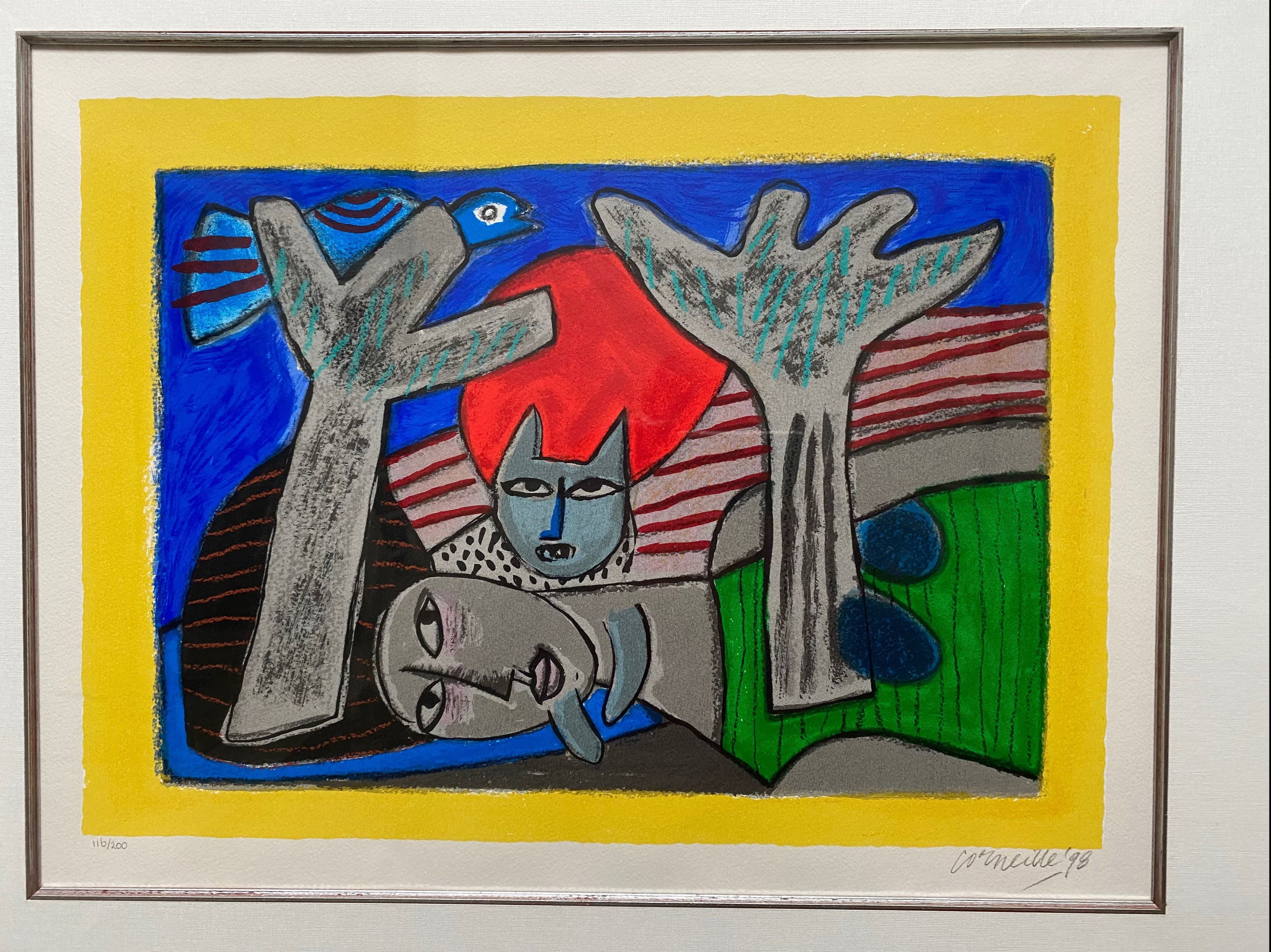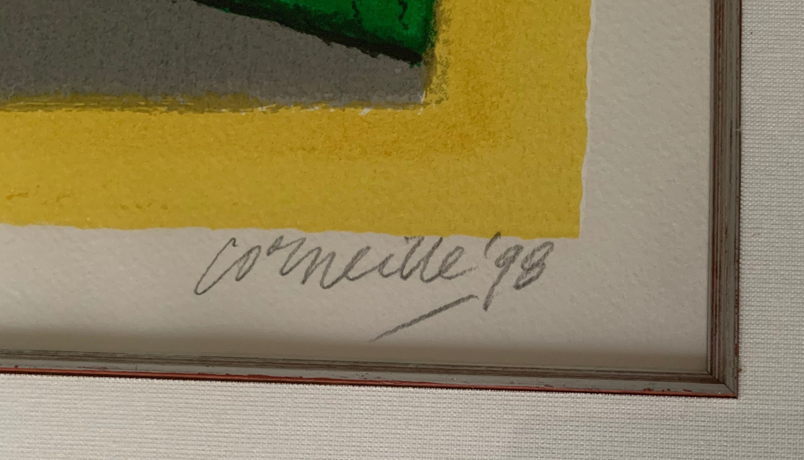 Schitterende zeefdruk van Corneille, mede oprichter van Cobra. Kenmerkend onderwerp in de figuratieve stijl van Corneille. Het werk is begin negentiger jaren aangeschaft bij een lijstenmaker en altijd in bezit geweest. Professioneel ingelijst.
