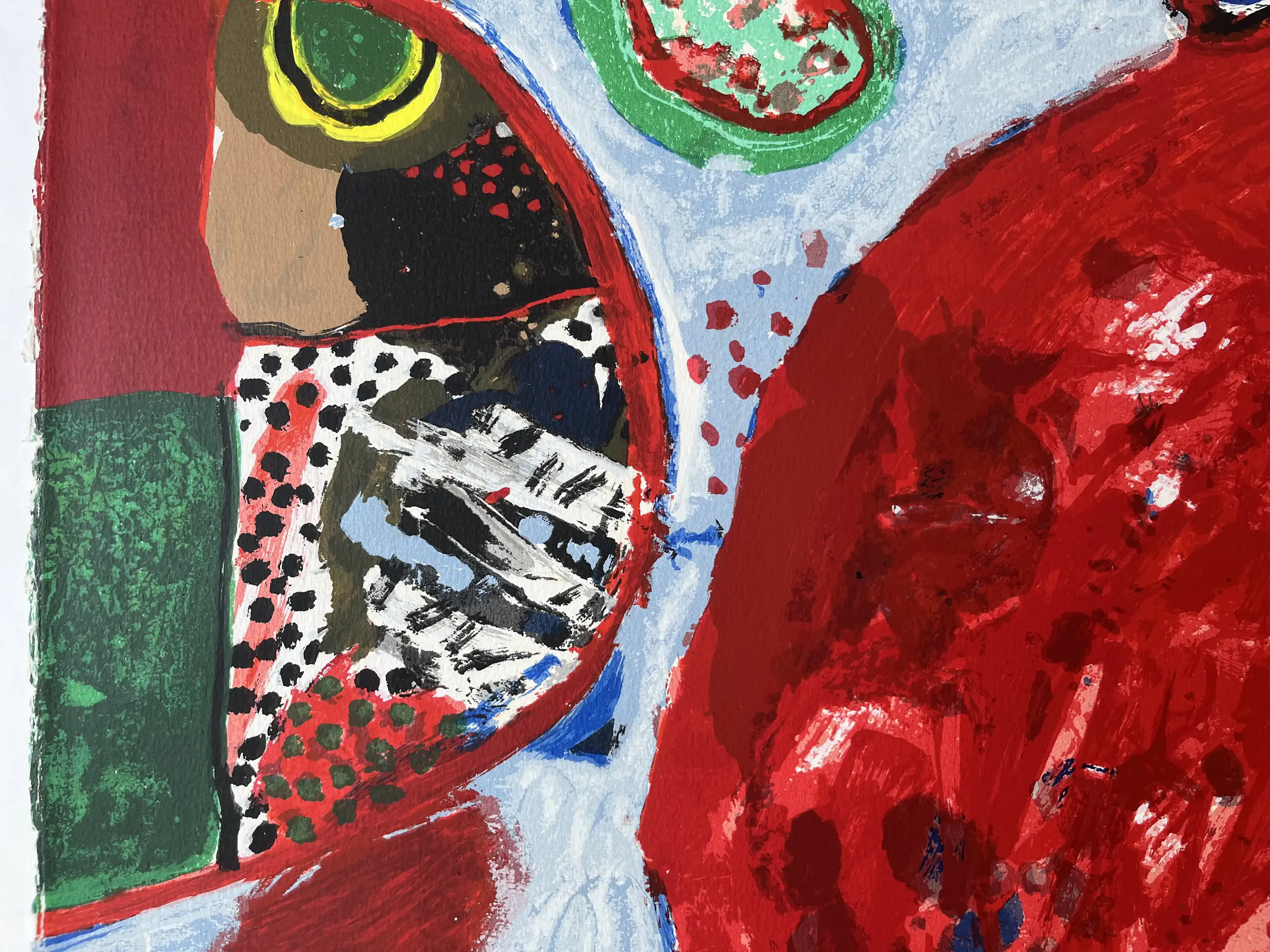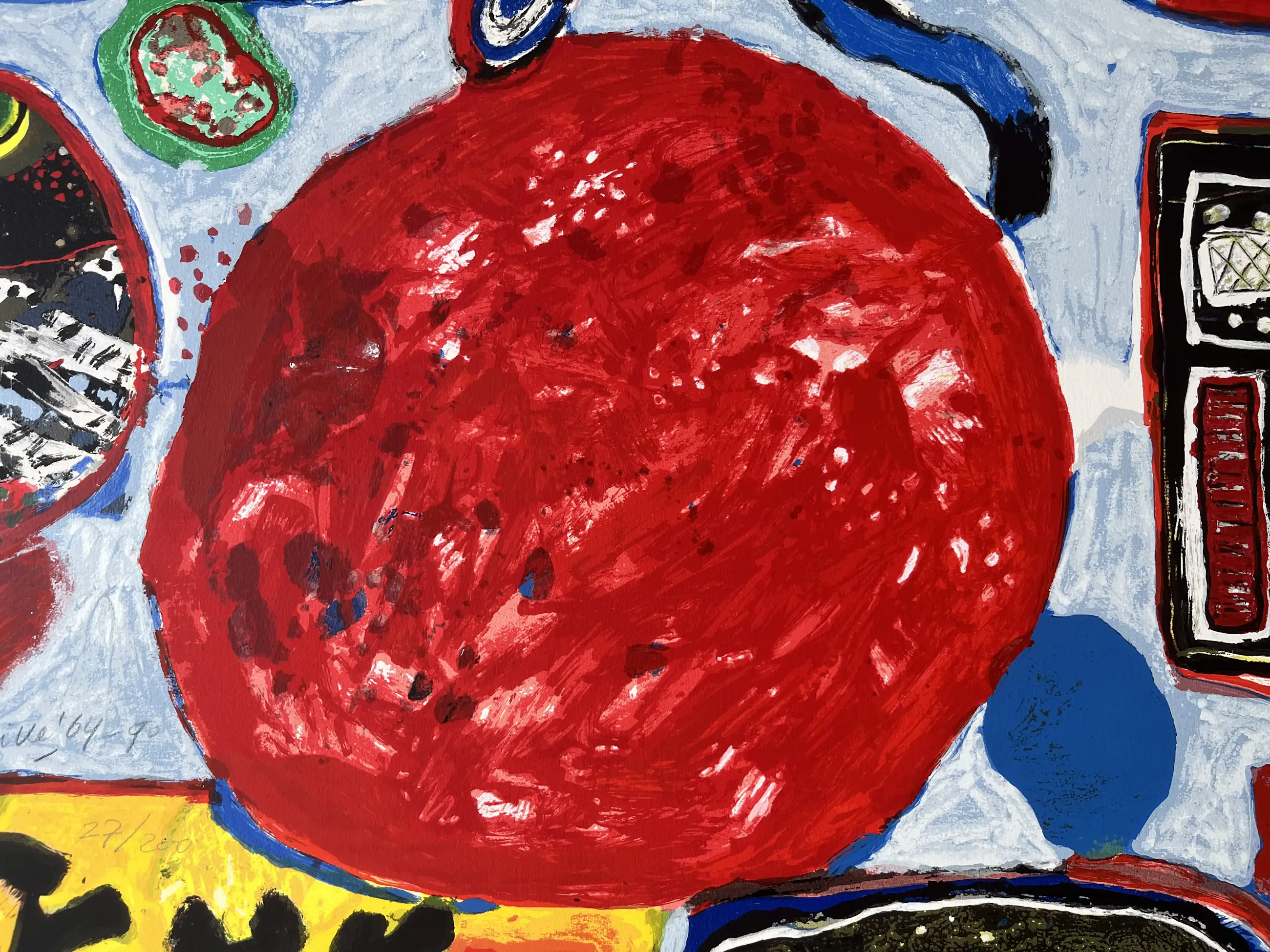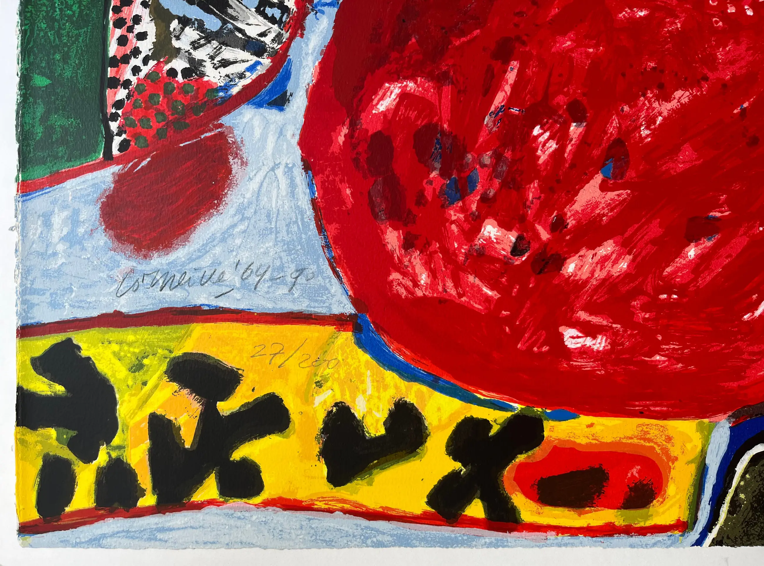 TEKST: Grote litho op handgeschept papier, geïnspireerd op een schilderij van Corneille uit 1964. Een kleurrijk werk van de vroege Corneille. Het toont een beeldentaal die typerend is voor de Corneille van de eerste helft van de jaren zestig. De litho is gemonteerd op passe-partoutkarton.
