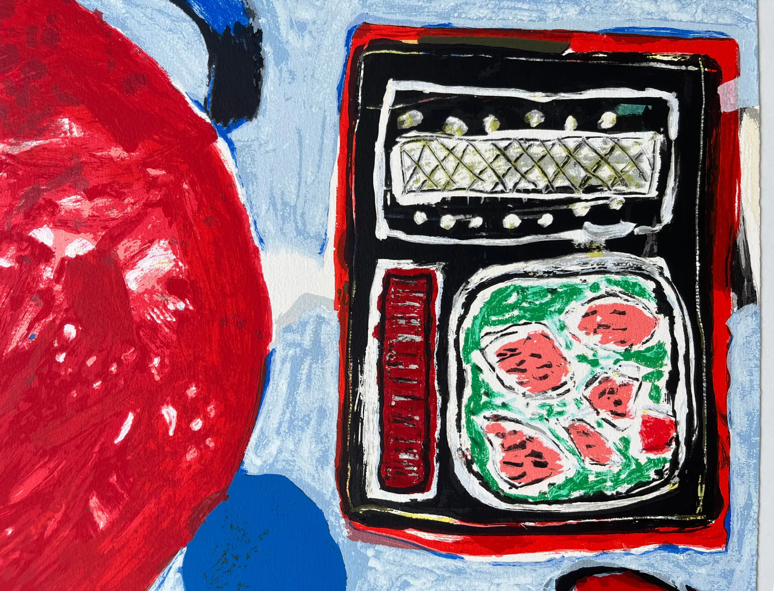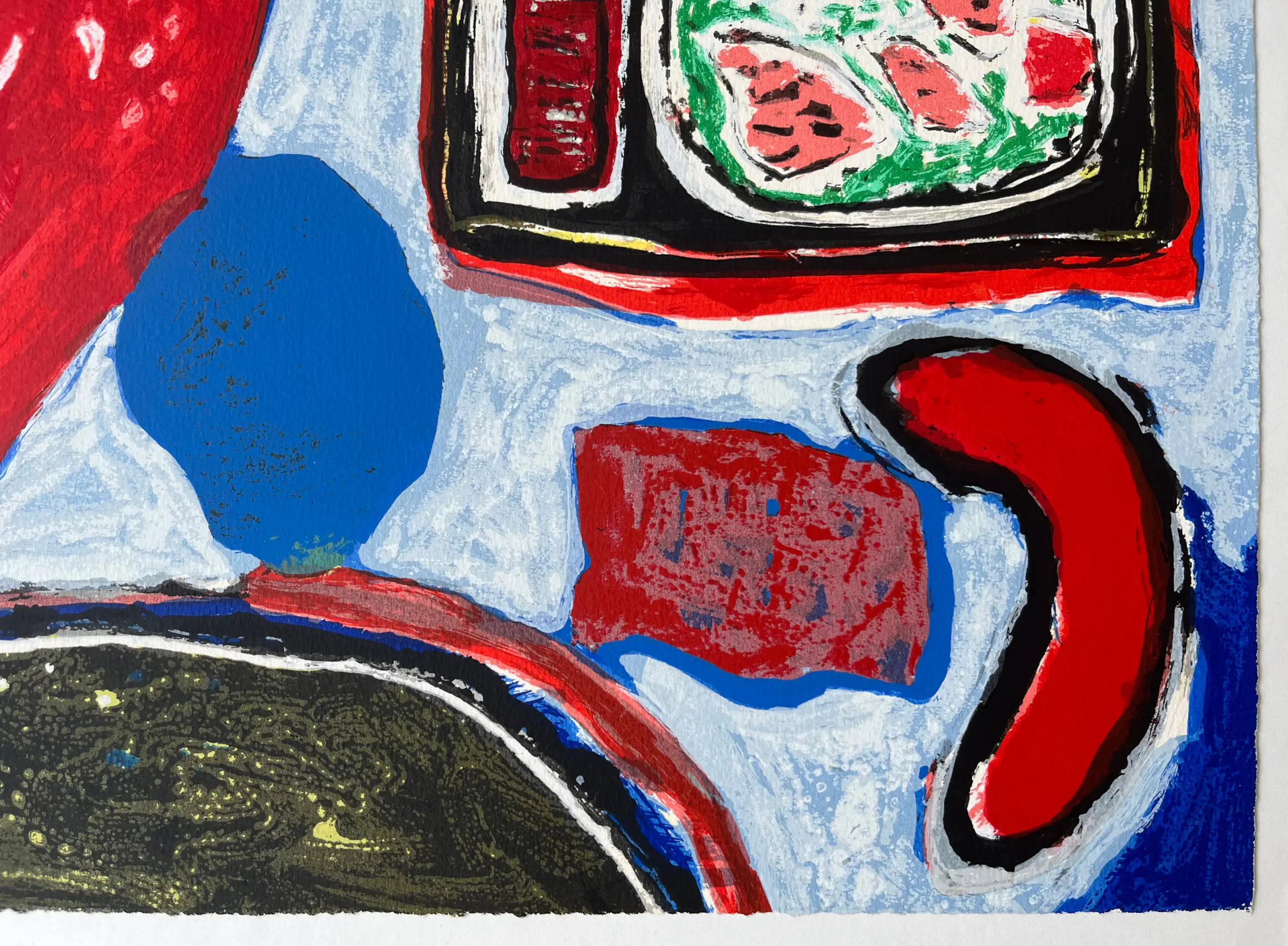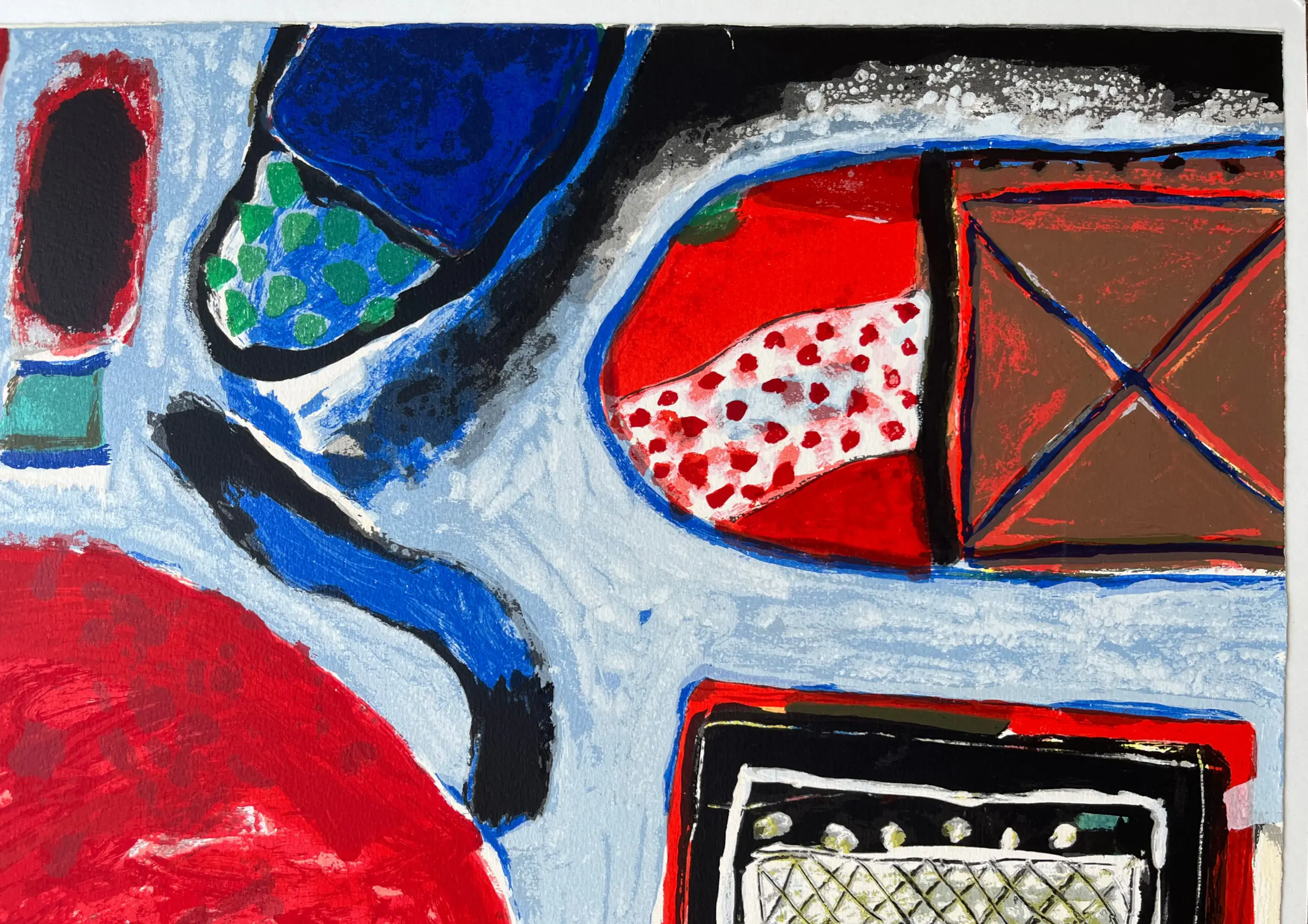 TEKST: Grote litho op handgeschept papier, geïnspireerd op een schilderij van Corneille uit 1964. Een kleurrijk werk van de vroege Corneille. Het toont een beeldentaal die typerend is voor de Corneille van de eerste helft van de jaren zestig. De litho is gemonteerd op passe-partoutkarton.