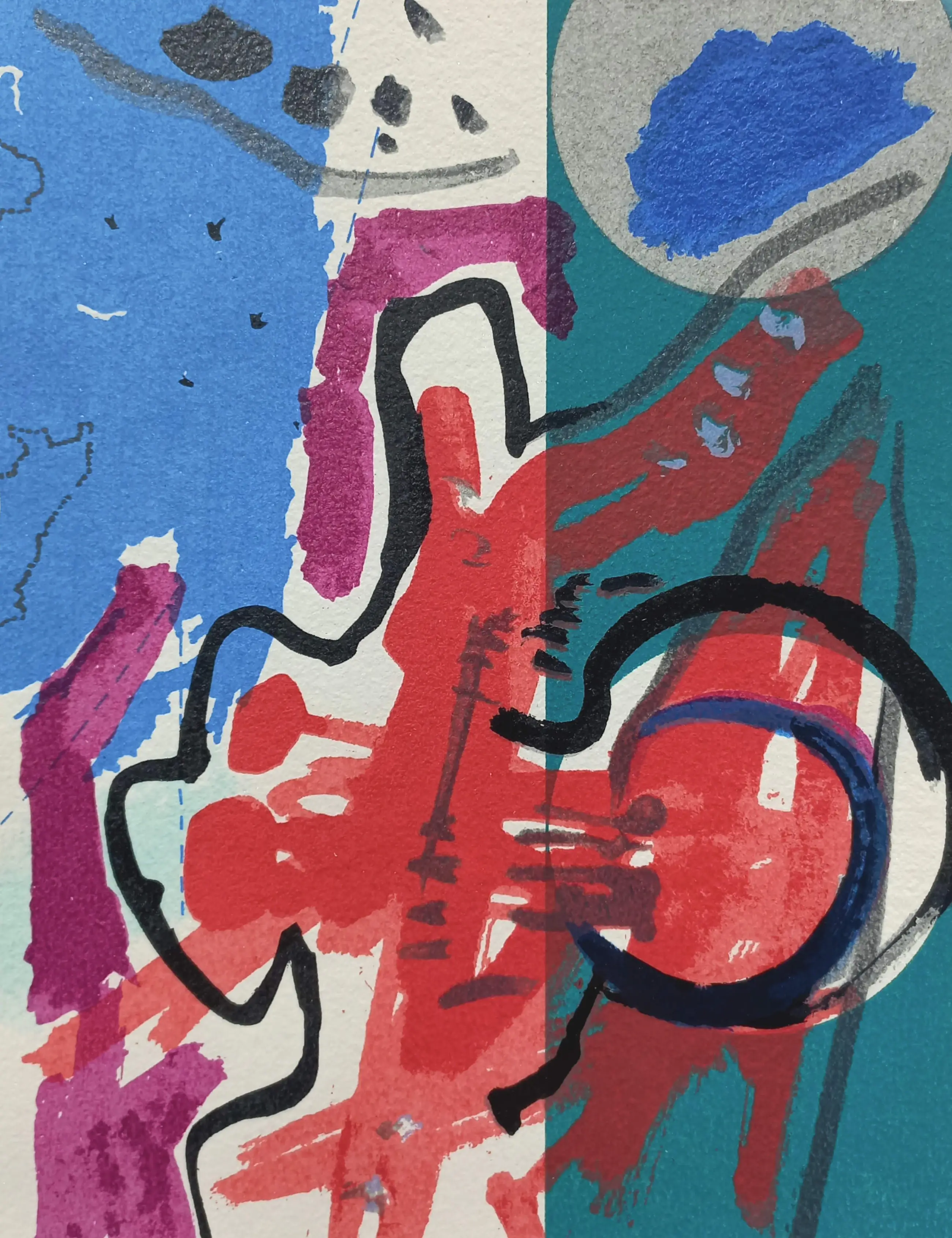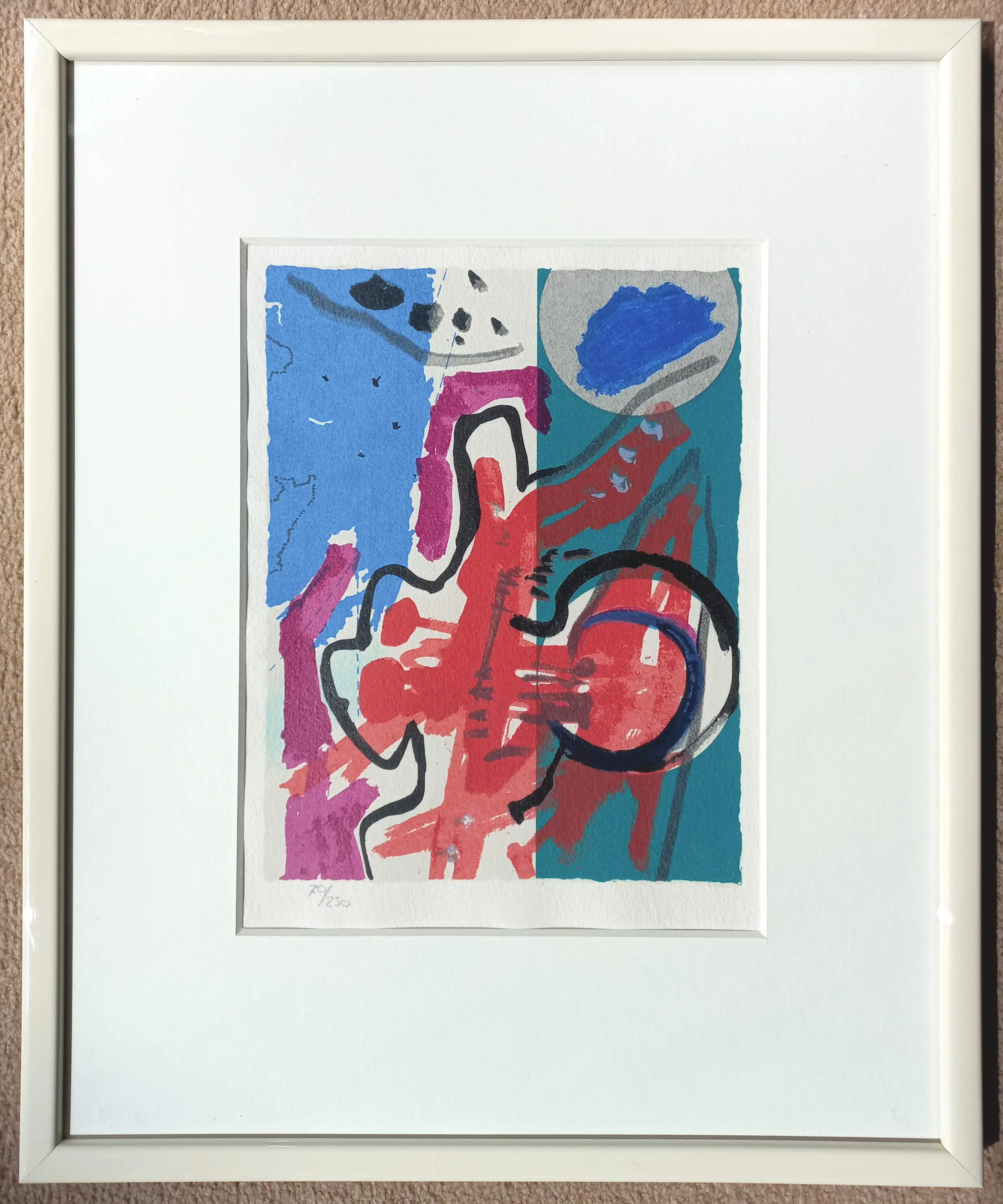 Mooie, kleurrijke compositie van Corneille uit de uitgave Een schedel vol stem (samen met Bert Schierbeek). Zeefdruk op geschept papier, met potlood genummerd (70/250). Mooi ingelijst, achter glas en met smetteloos, zuurvrij passe-partout. In uitstekende conditie.
