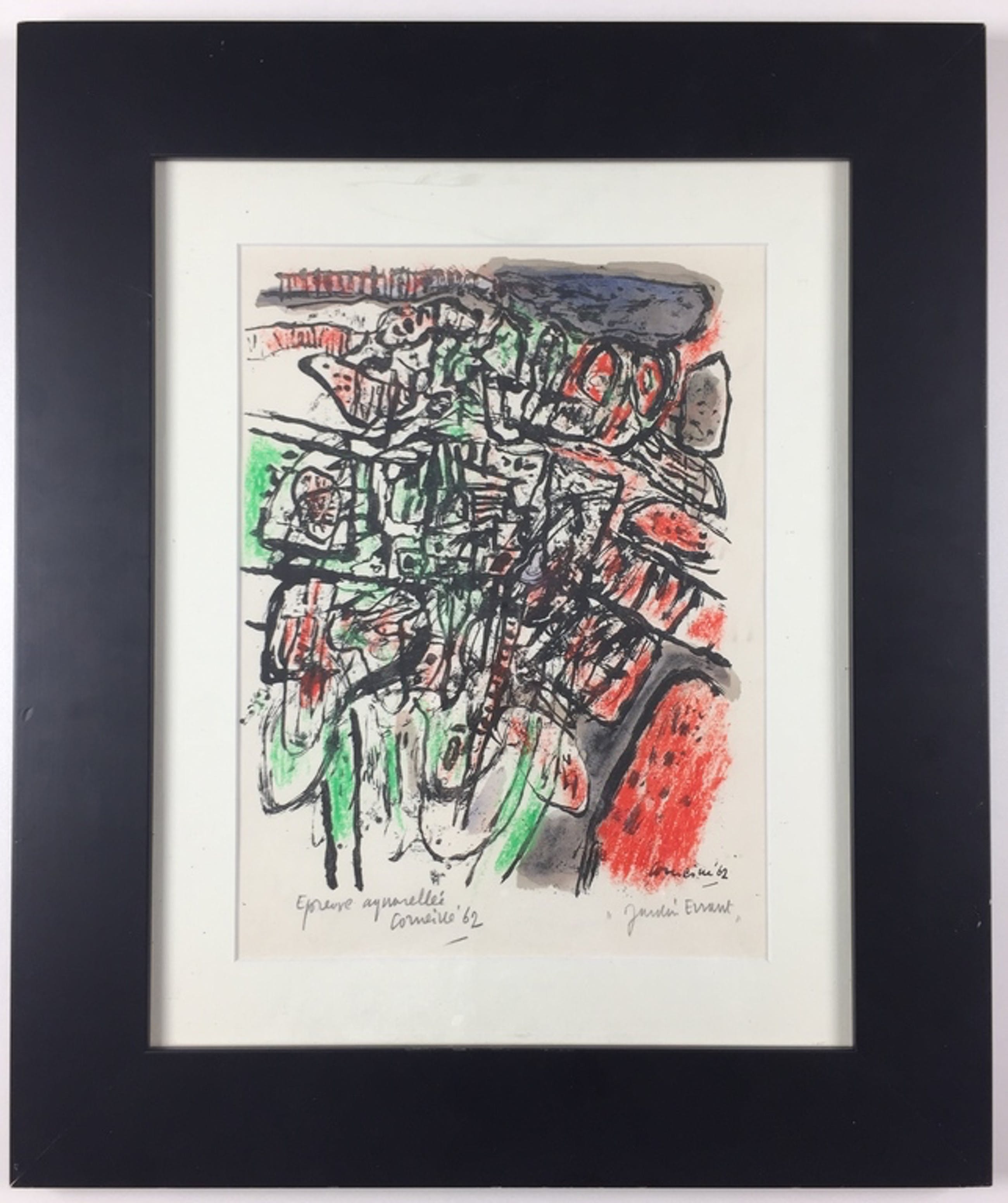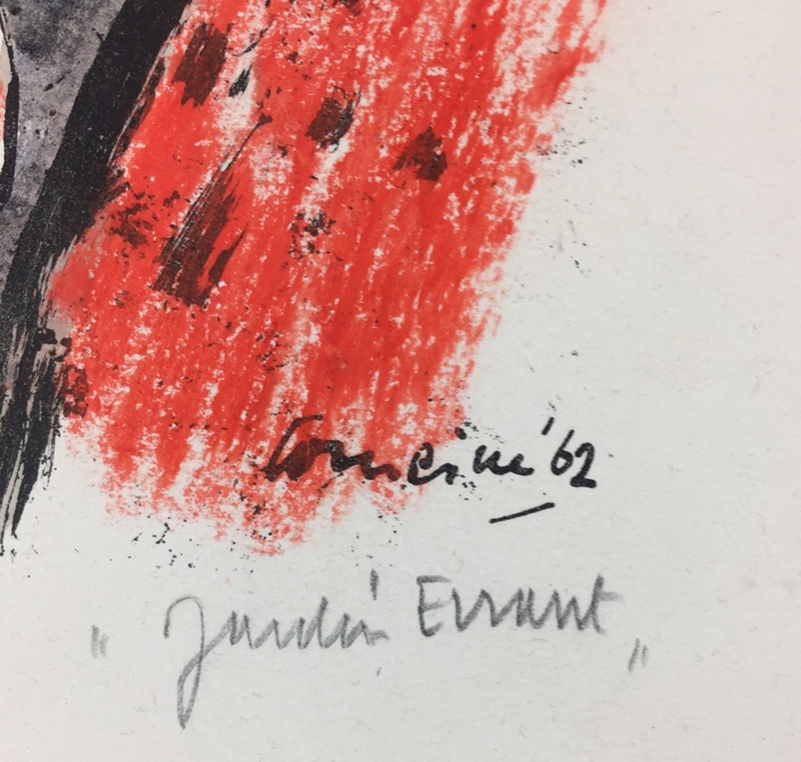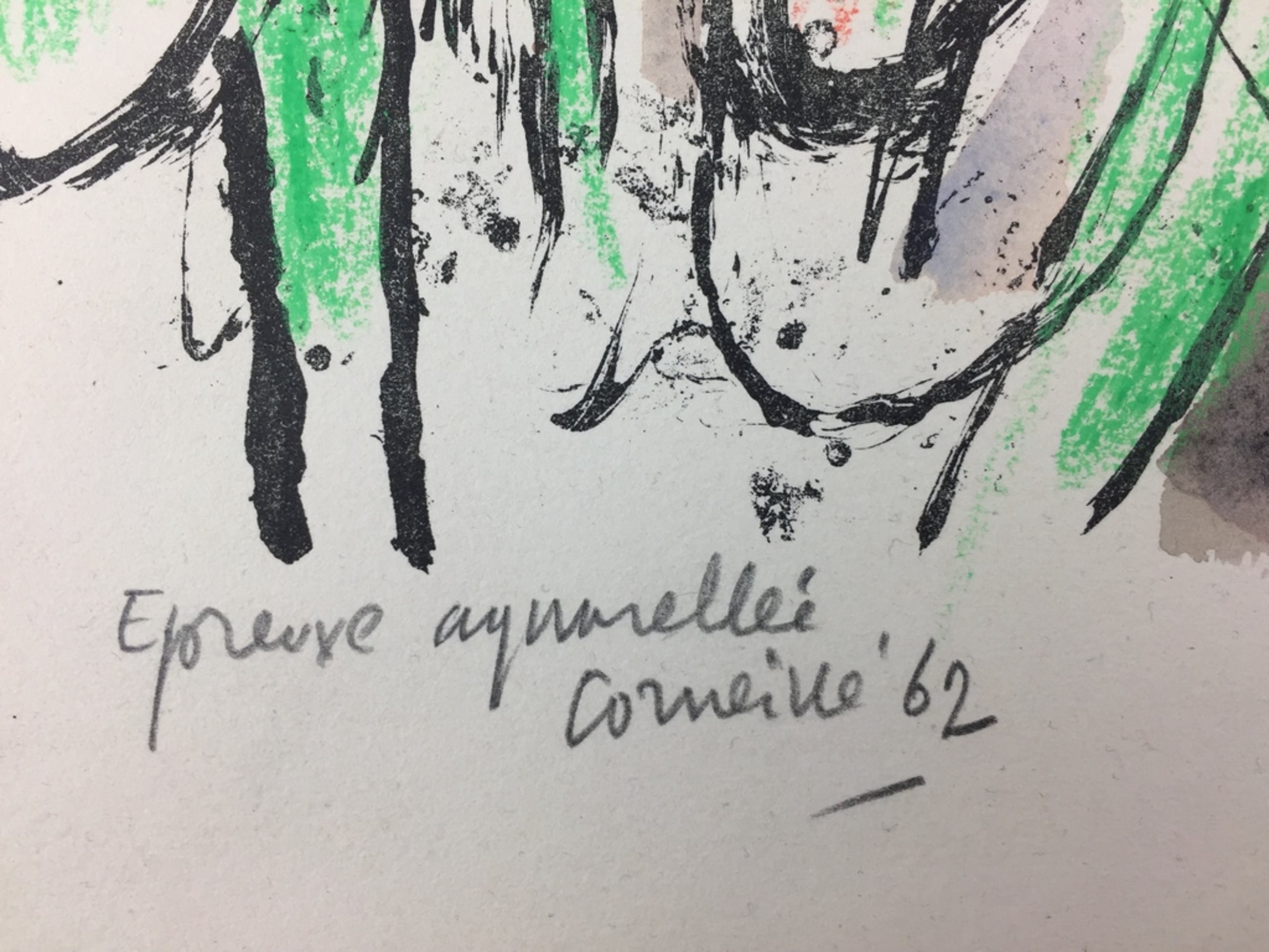 Topwerk uit de goede tijd van Corneille. Dit unieke en zeer zeldzame werk is een proefdruk voor een litho van Corneille uit 1963, getiteld 'Jardin Errant' (zie Donkersloot pag. 132). Het werk is met de hand ingekleurd met aquarel en krijt. Alle kleur in het werk is er met de hand opgezet. Het zwart is gedrukt. De uiteindelijke litho is iets anders van kleur.