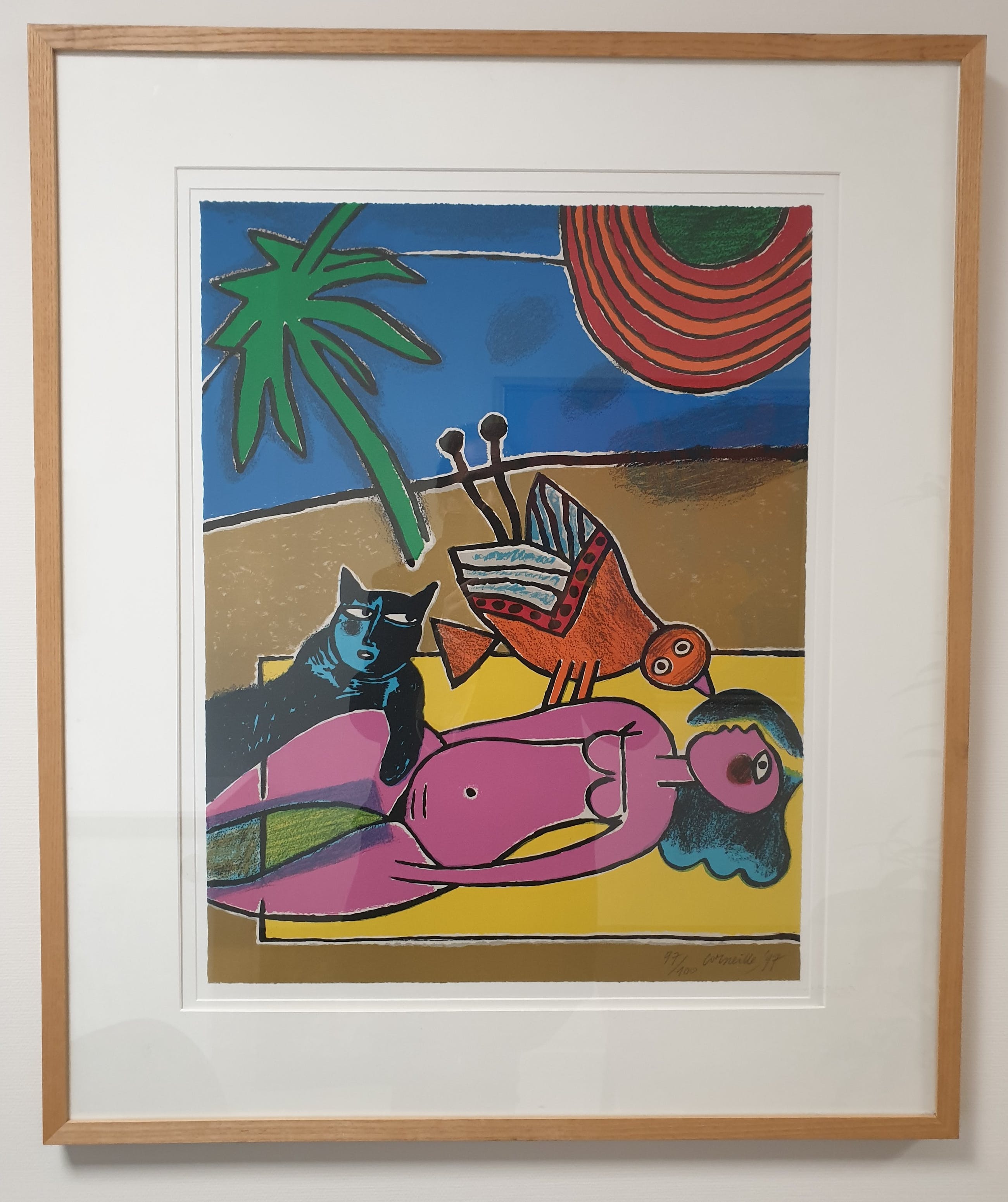 Kleurige litho uit 1997 van Corneille. Nummer 97/100. Het grote werk (100 x 80 cm) is ingelijst in een blankhouten lijst (met gebruikssporen) met een dubbel passe partout . De litho kan zonder glasplaat verzonden worden. Afhalen of brengen heeft de voorkeur i.v.m. kwetsbaarheid.
