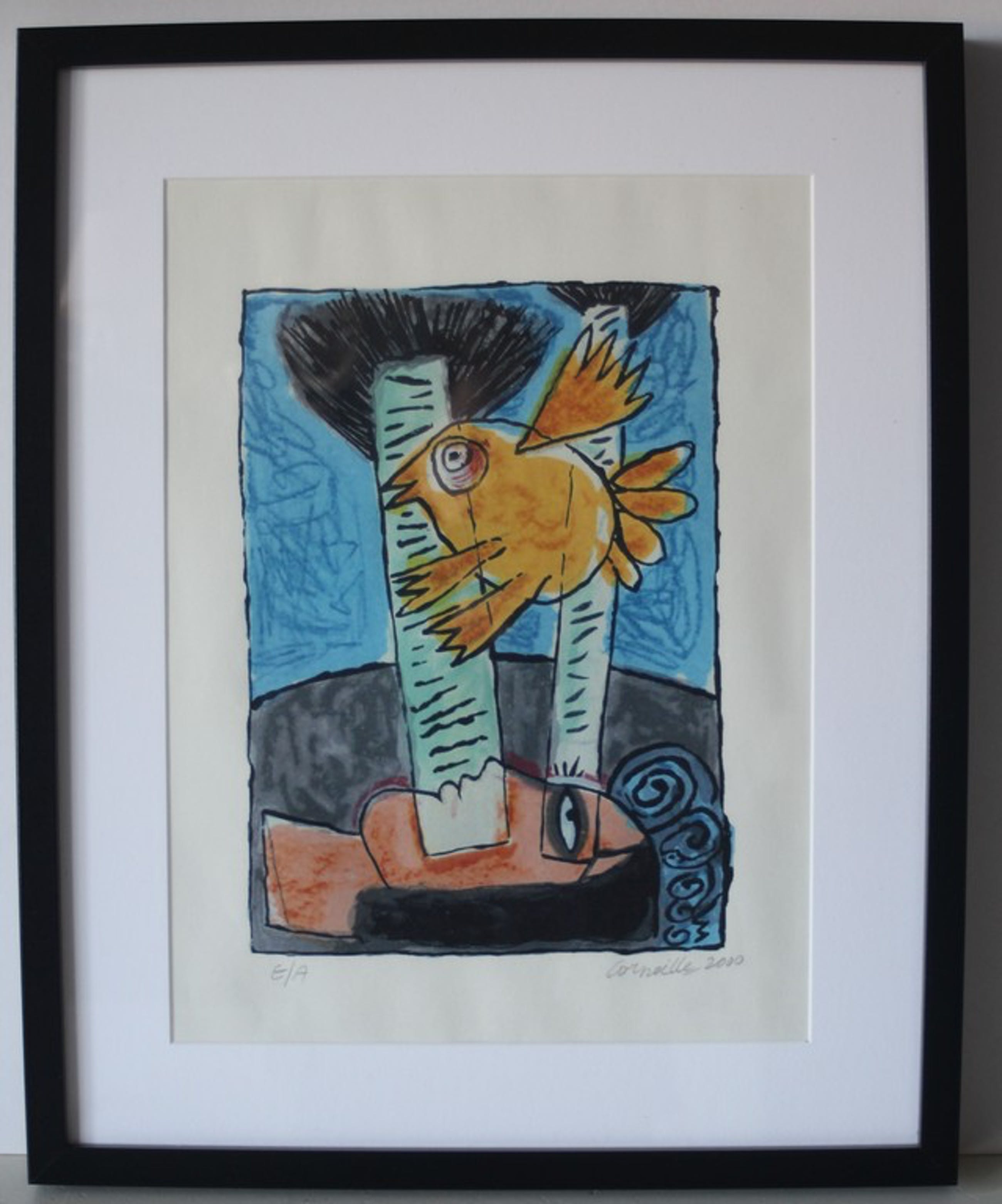 Mooi ingelijst werk van Corneille met heldere kleuren. Nummer: E.A. Jaar: 2000. Titel: " Femme et Oiseaux "