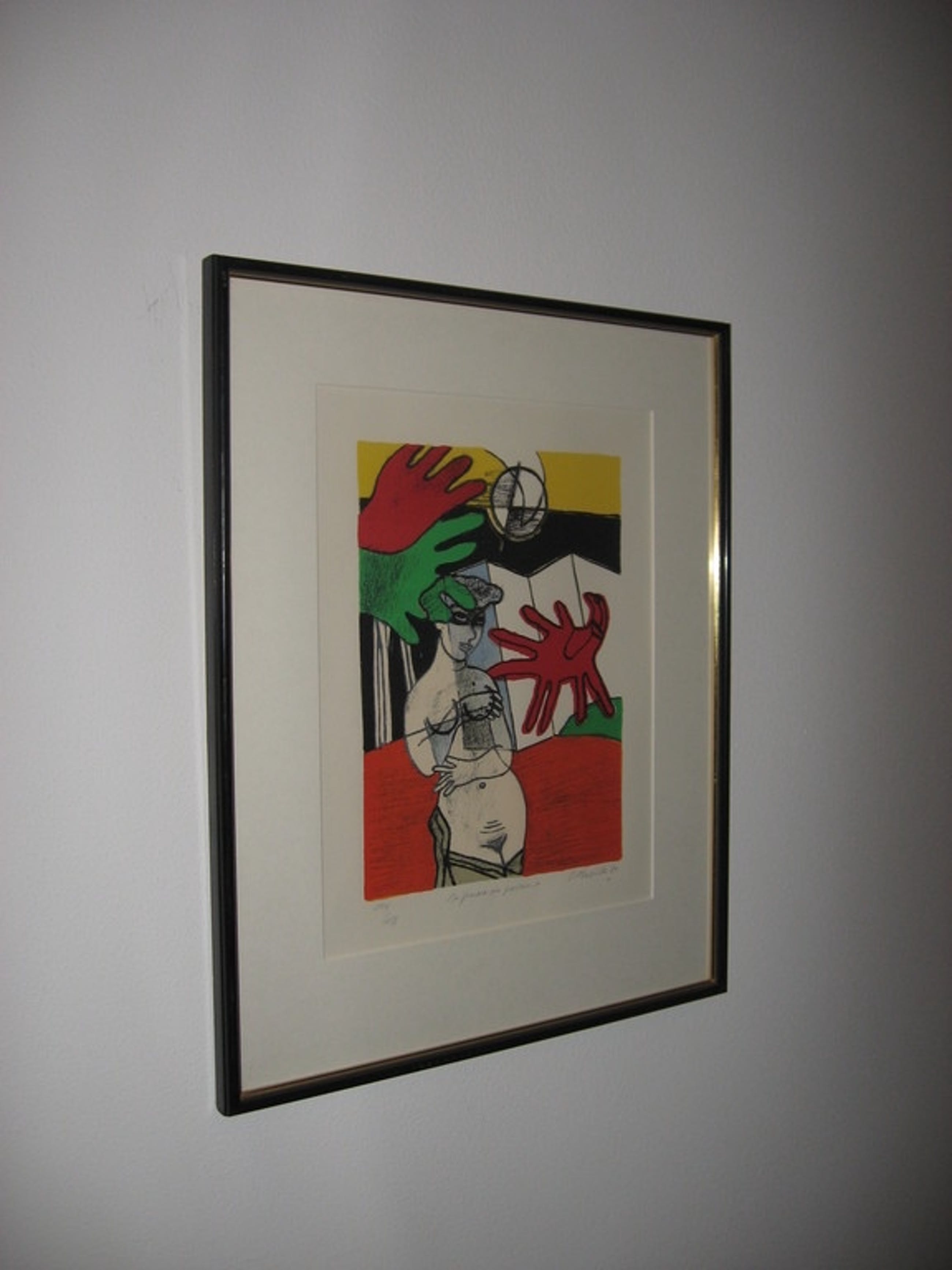 Kleurenlitho van Corneille uit 1984. Tijdens zijn reis door Japan maakte Corneille een viertal litho's, waaronder deze: La femme au paravent. Ingelijst in een zwarte houten lijst (gouden binnenrand) met passe-partout.