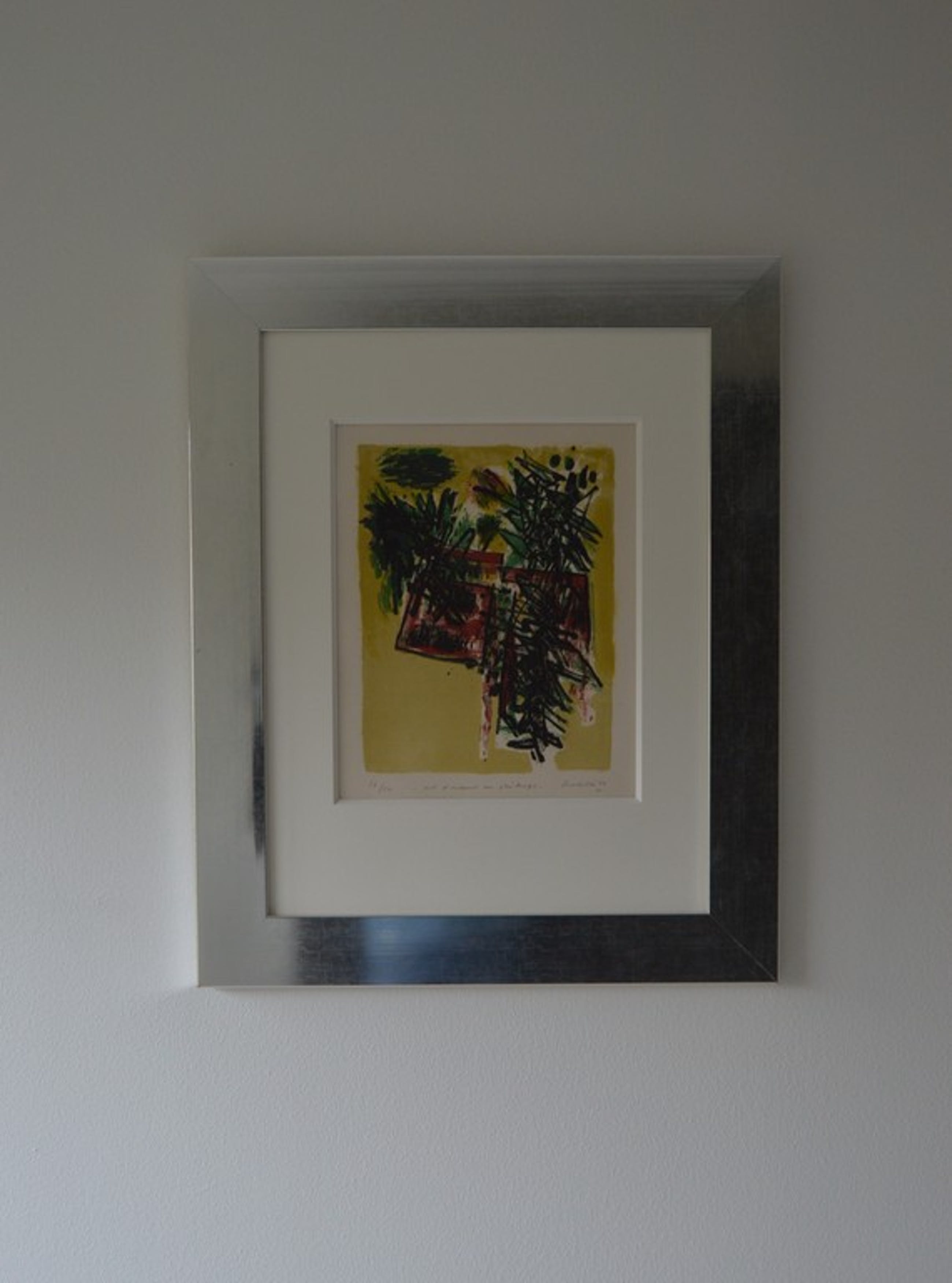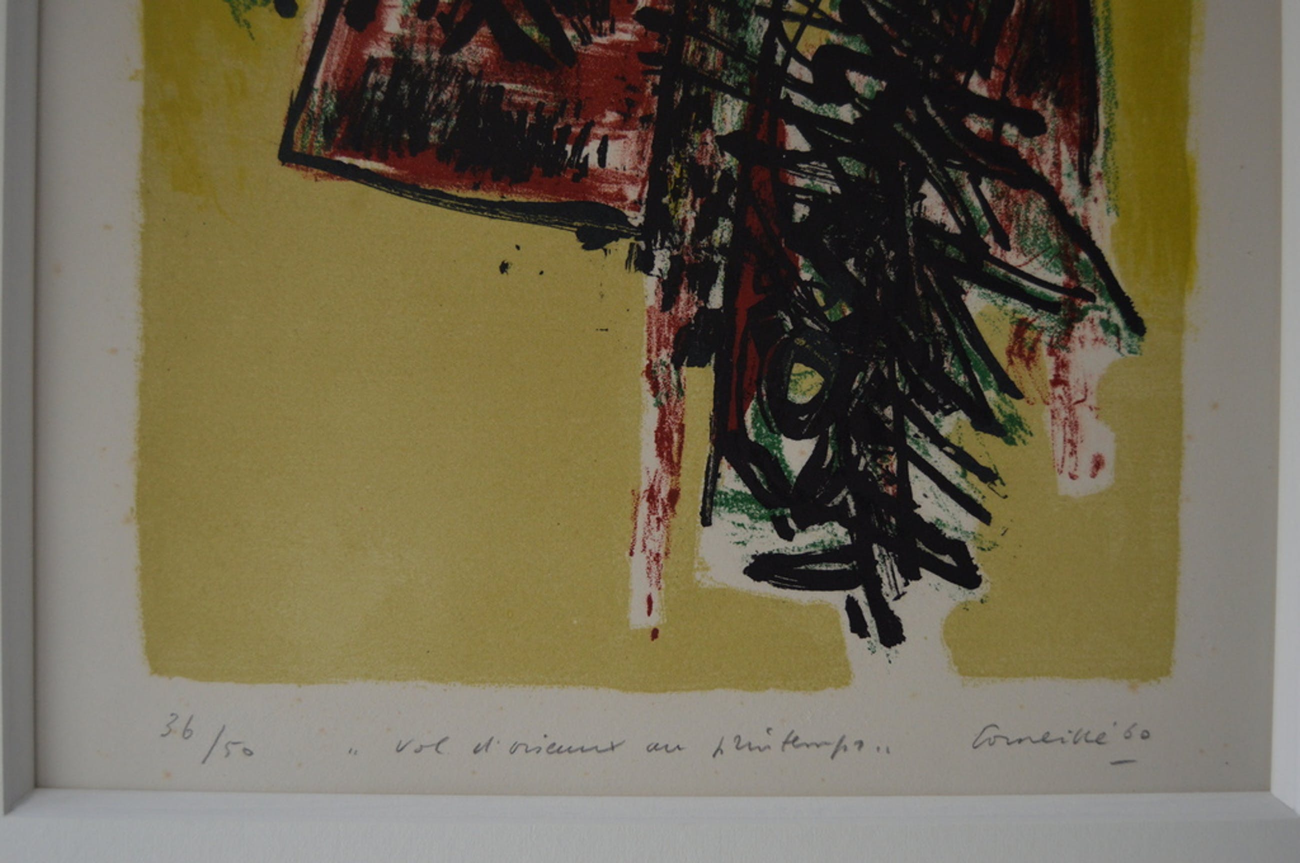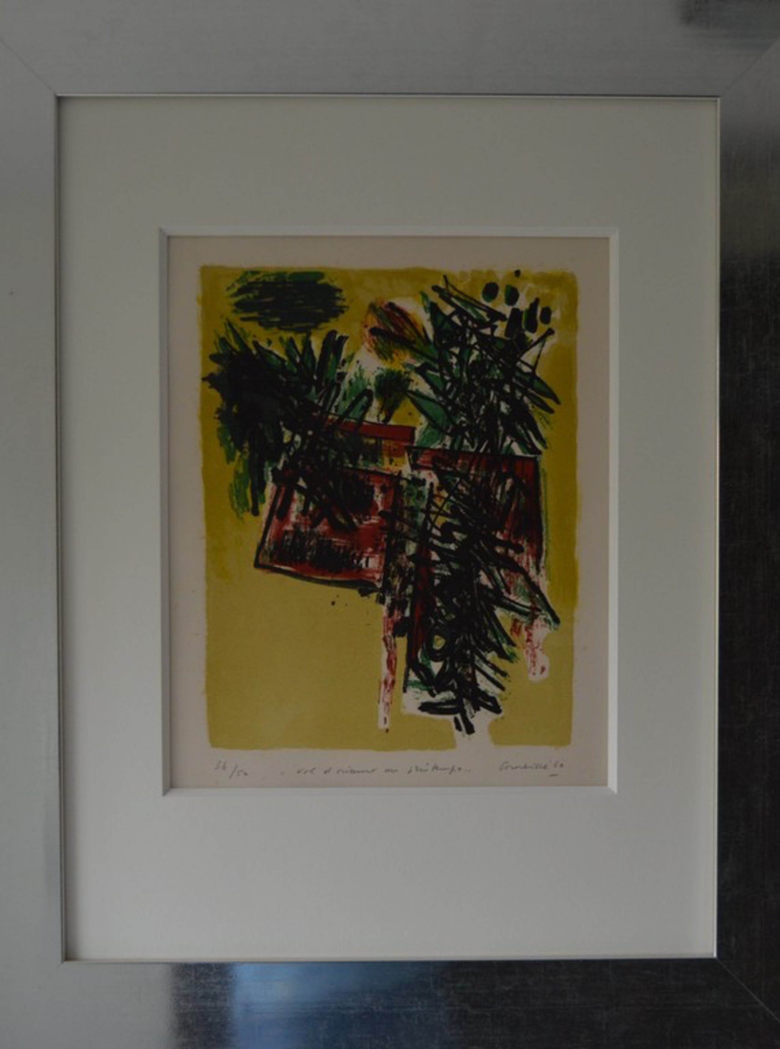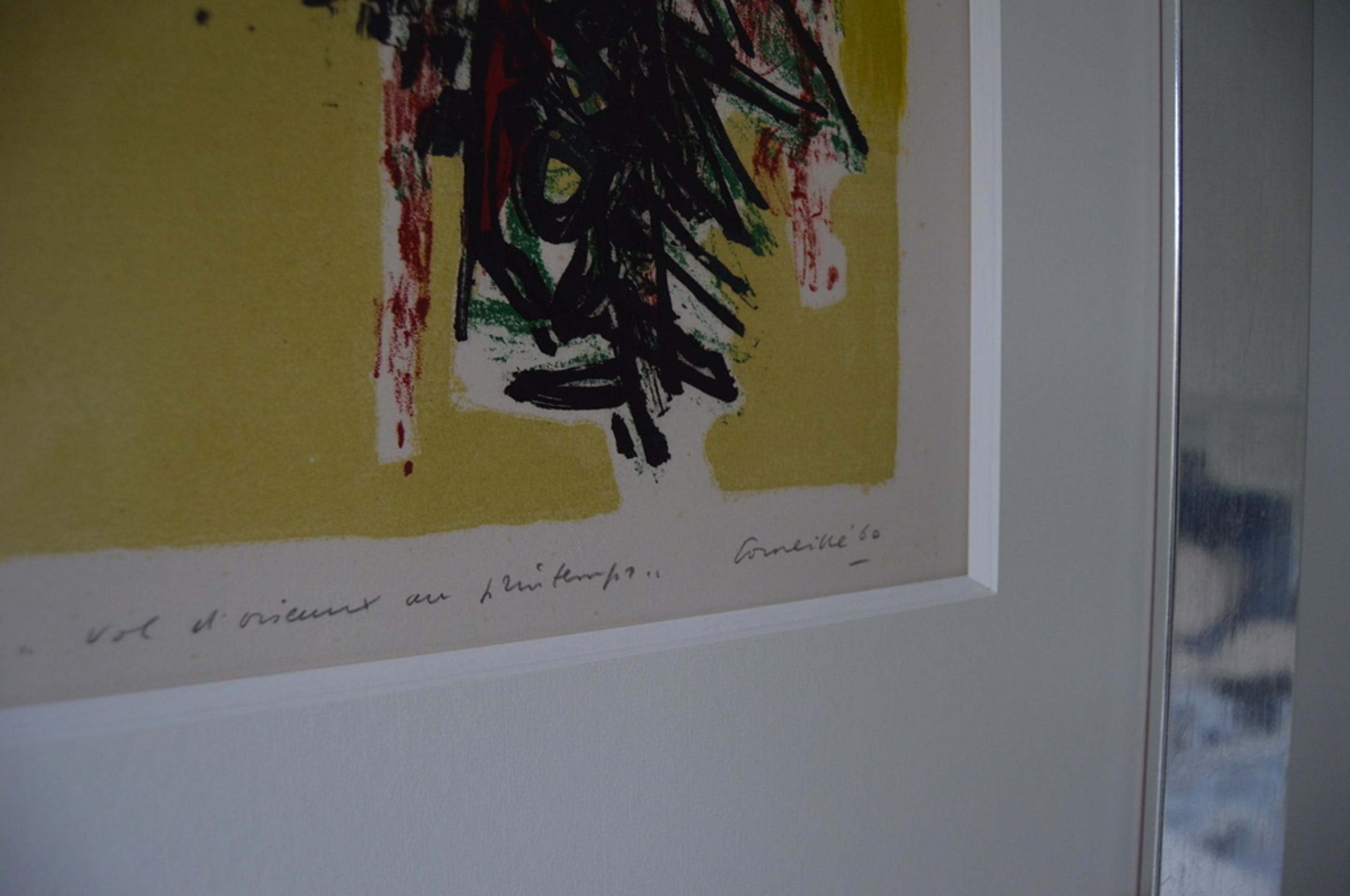 Prachtige en zeldzame kleurenlitho van Corneille uit 1960. Ingelijst in een zilveren houten lijst met passe-partout.