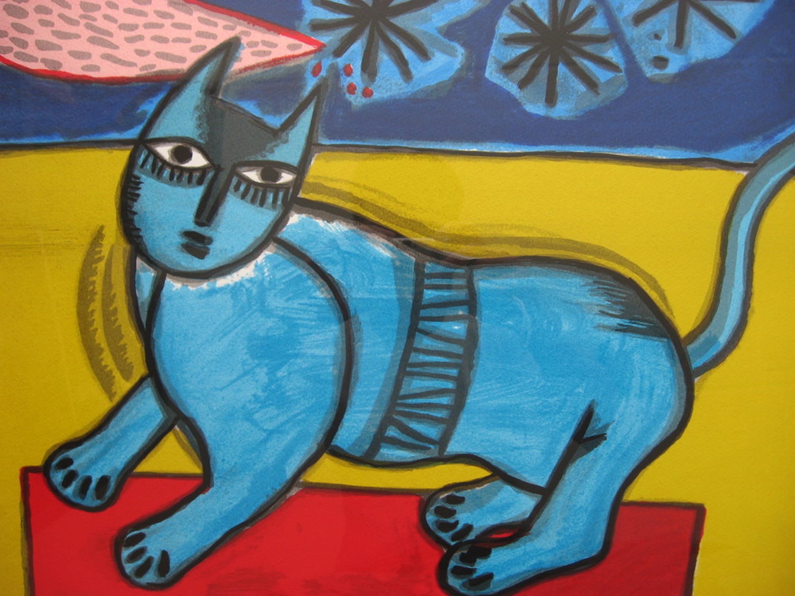 Kleurenzeefdruk van Corneille uit 1996. Ingelijst in een blauwe aluminium lijst met passe-partout.