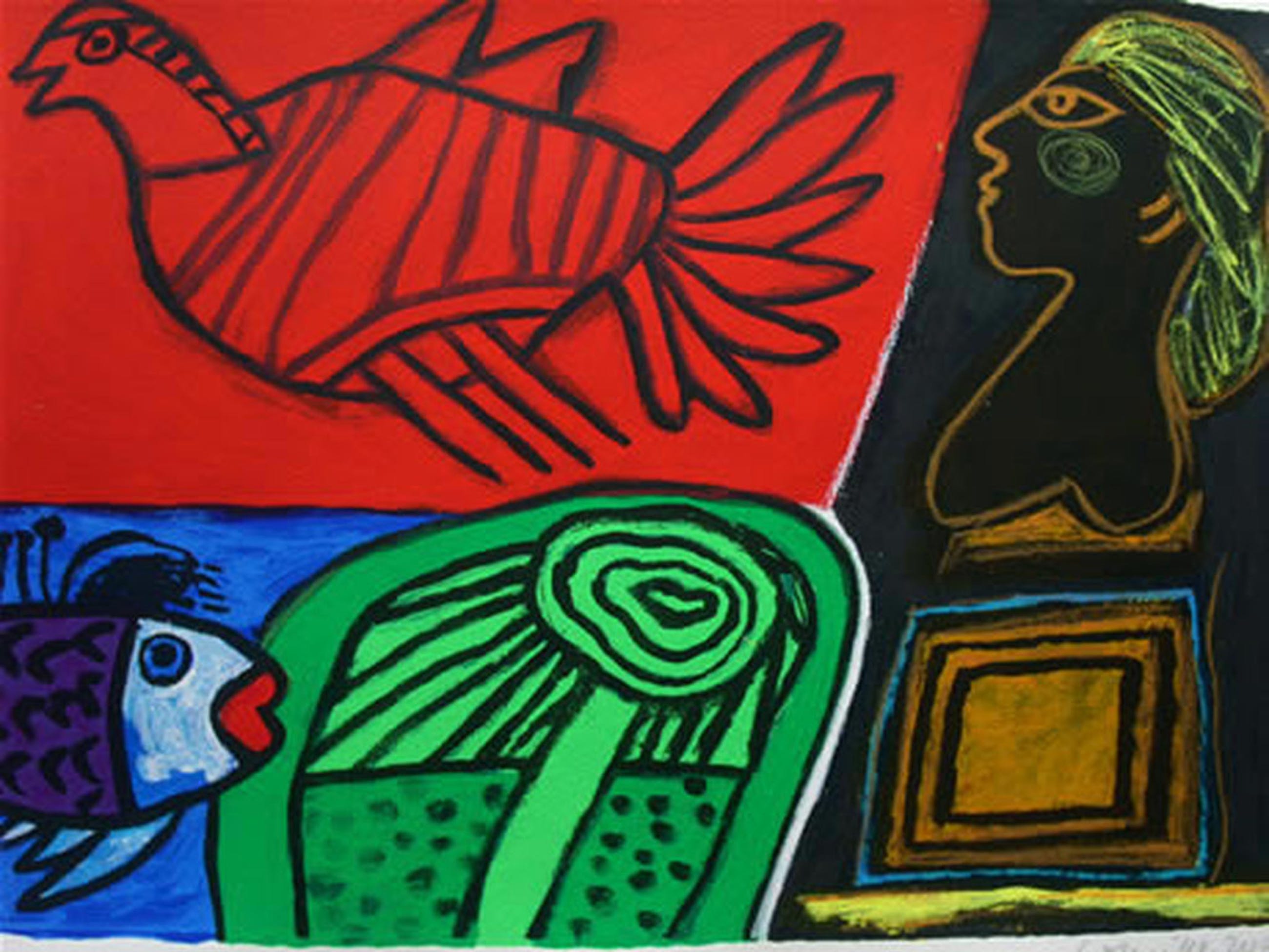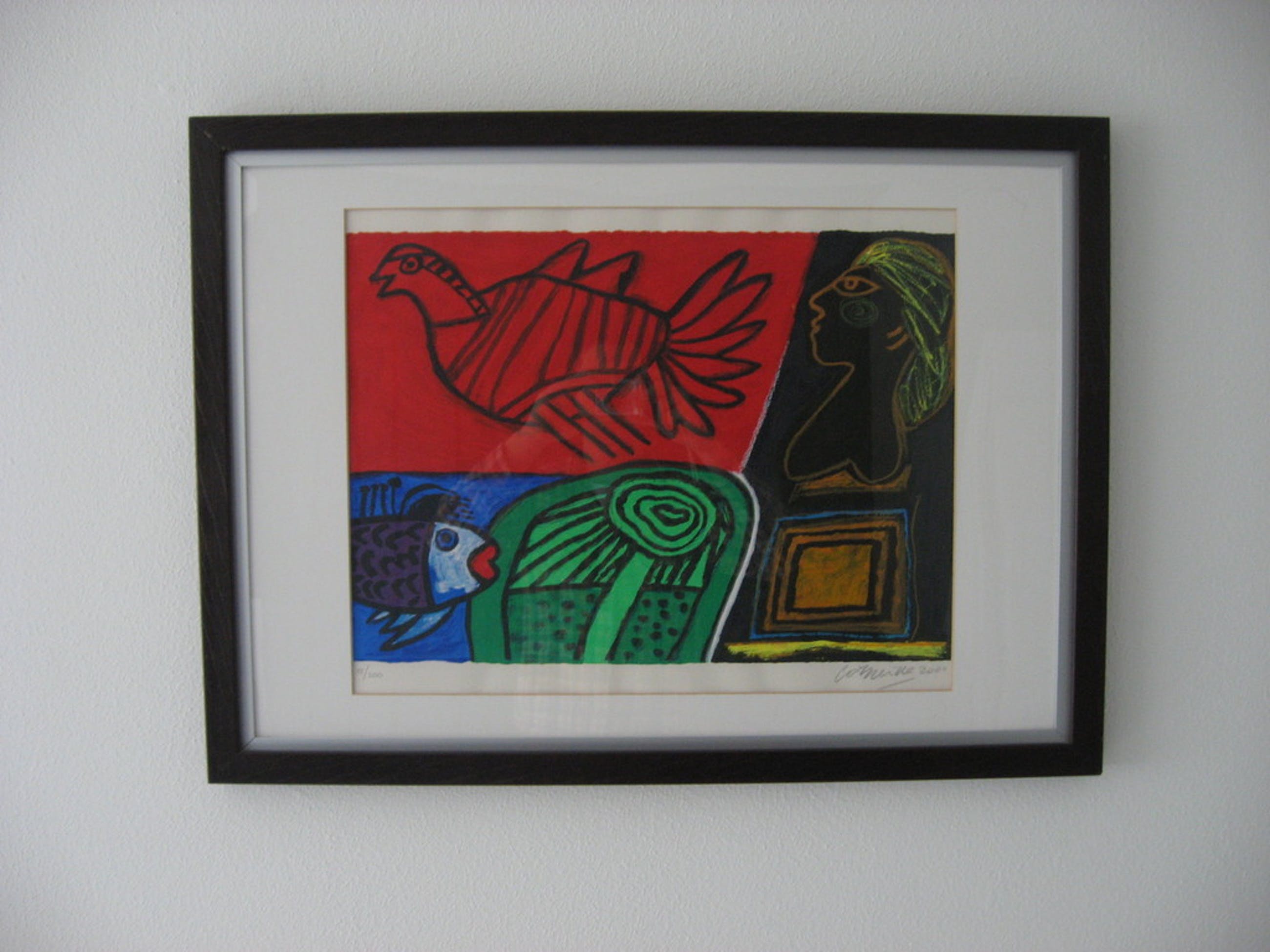 Kleurenzeefdruk van Corneille uit 2000. Mooi ingelijst in een donkerbruine houten lijst met passe-partout.