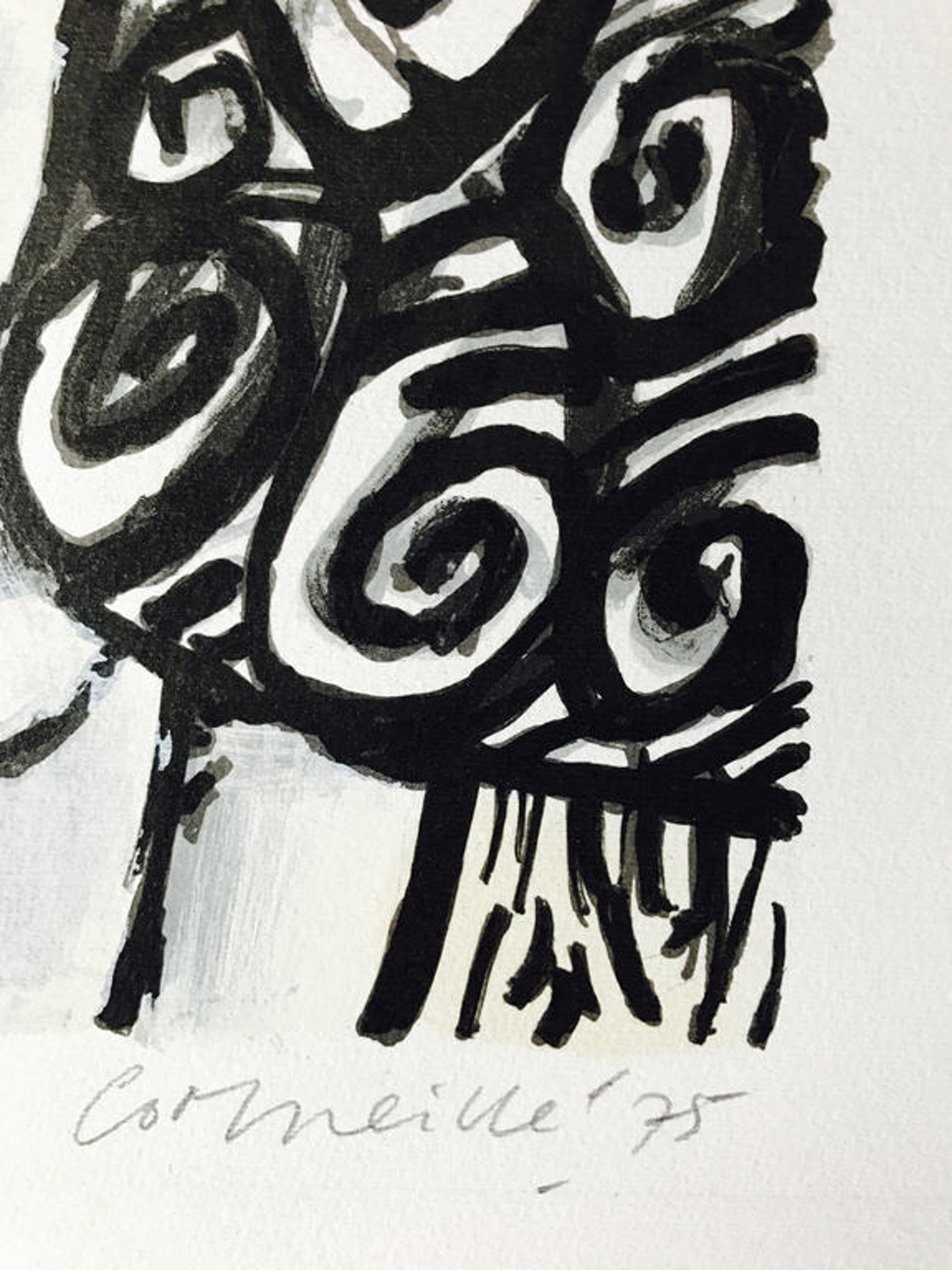 Deze schitterende zeefdruk van Corneille dateert al uit 1975. Hij is getiteld Le chien bleu/ il canzo azzuro en staat vermeld zoals weergegeven in Donkersloot ( de bijbel van al het werk van Corneille van 45-75).