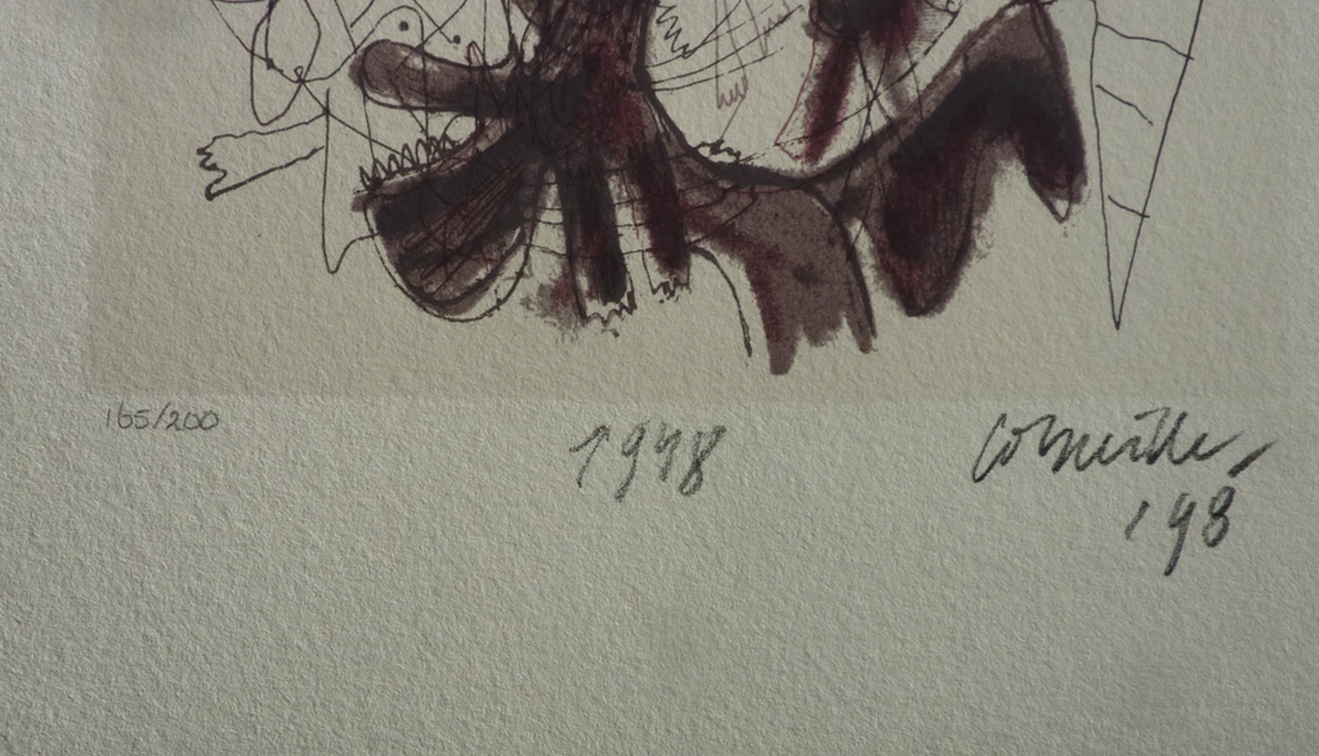 Dit is exemplaar nr. 165 van dit werk: de zeefdruk, door de kunstenaar met de hand betiteld “1948” en gesigneerd “CORNEILLE ‘98”.