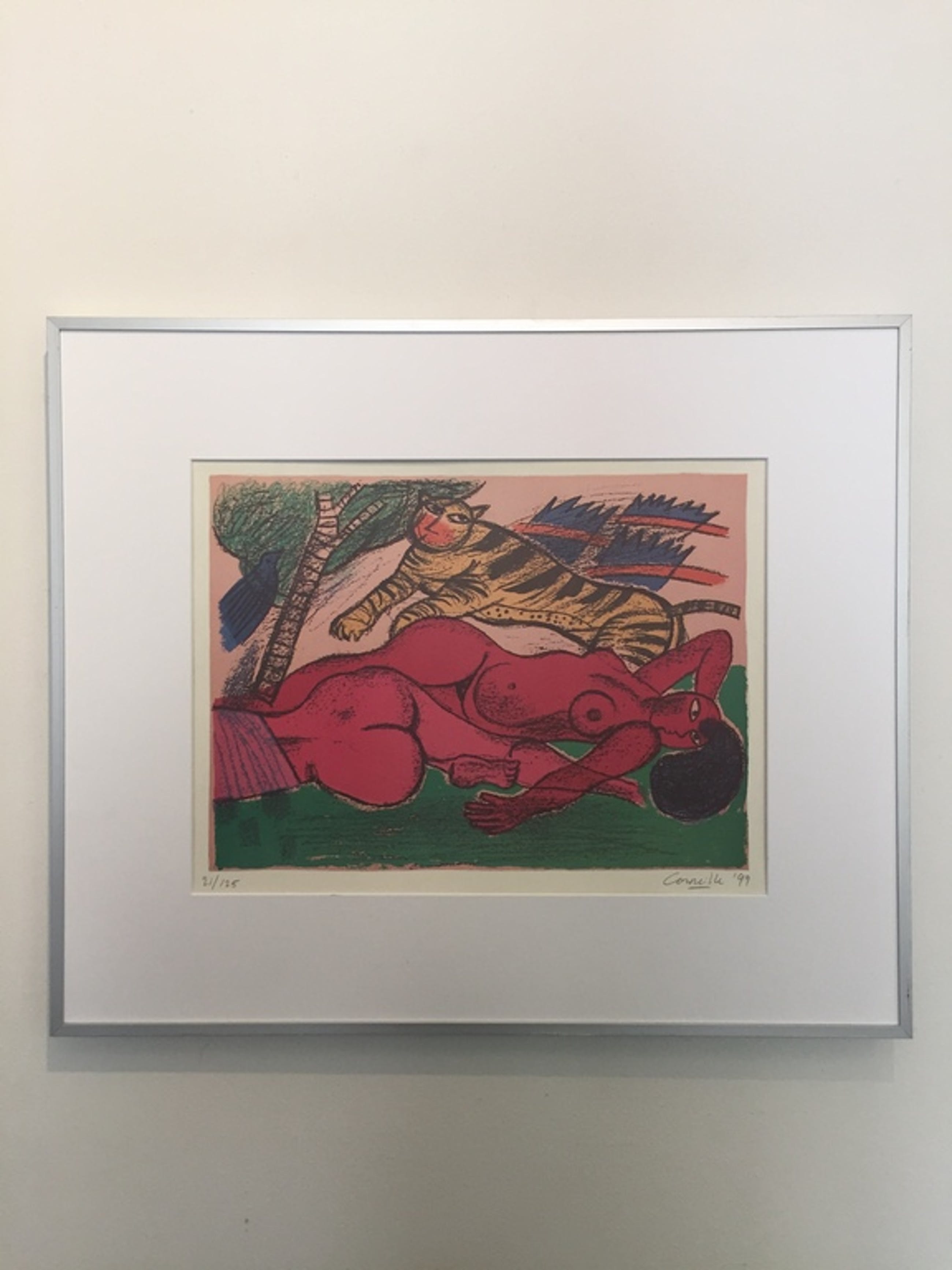 Ingelijst achter glas in een mooie metalen lijst.