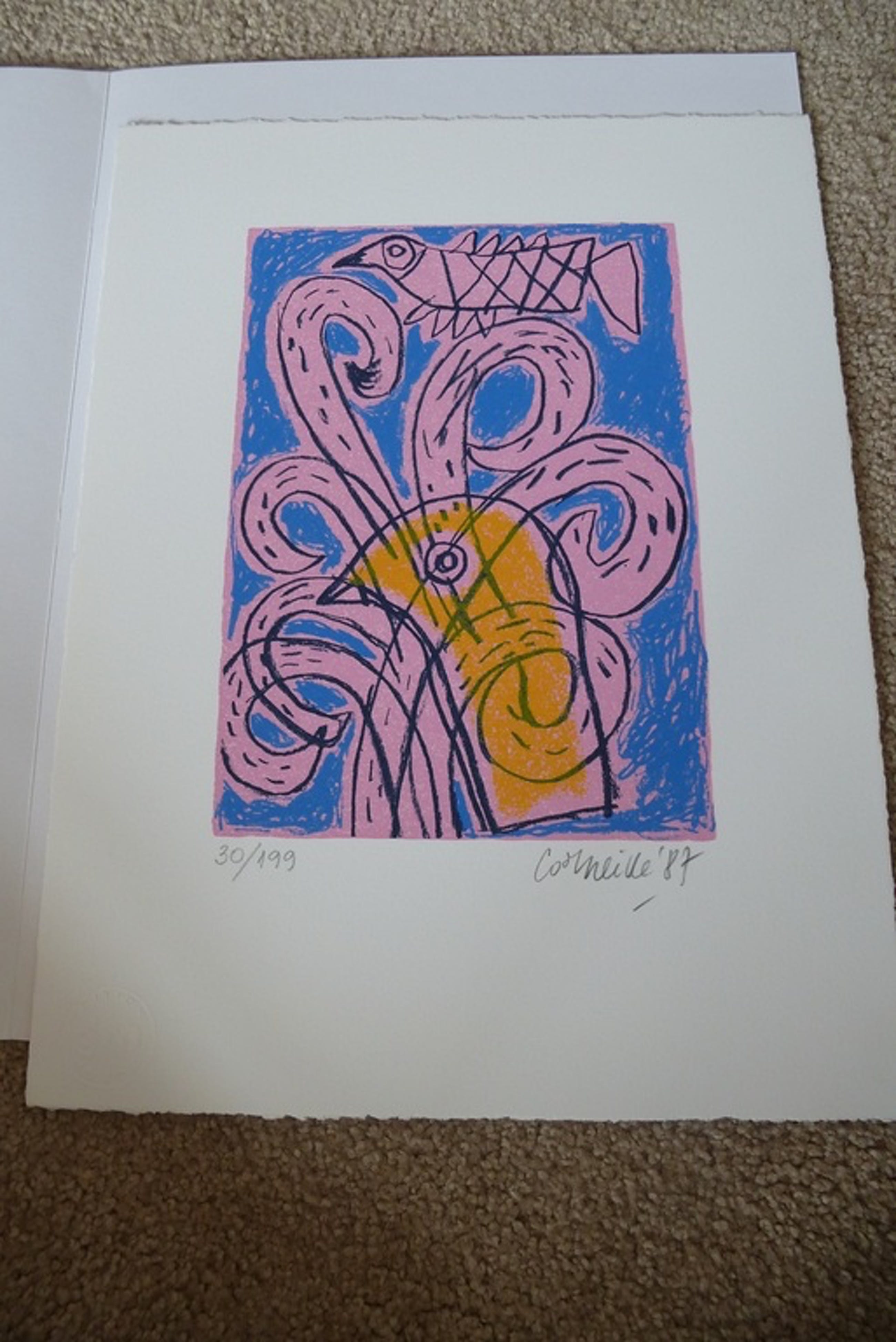 Opmerking1: dit is een uitgave door GKM Siwert Bergström uit Zweden met 4 zeefdrukken van Corneille en 4 gedichten van Lasse Söderberg in het Zweeds en Frans. Zeldzaam en moeilijk compleet te krijgen!