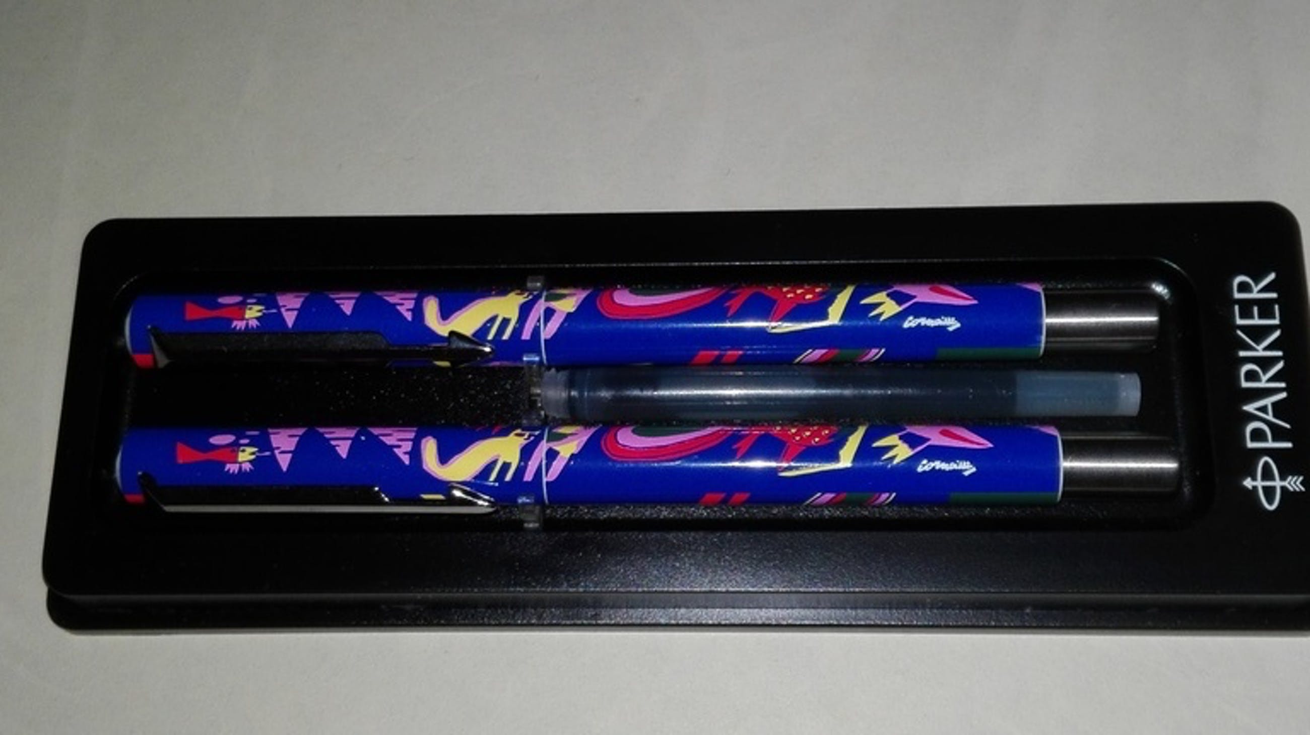 In de 70-er jaren was de rollerball een cadeautje bij het openen van een spaarrekening van de ABN-AMRO. Deze set is, in beperkte oplage, additioneel gemaakt voor goede klanten. De afbeelding in door middel van zeefdruk aangebracht op de pennen en de afbeelding sluit naadloos aan van barrel naar de cap. Beide zijn in nieuwstaat; nooit gebruikt. Verzending middels Track & Trace.