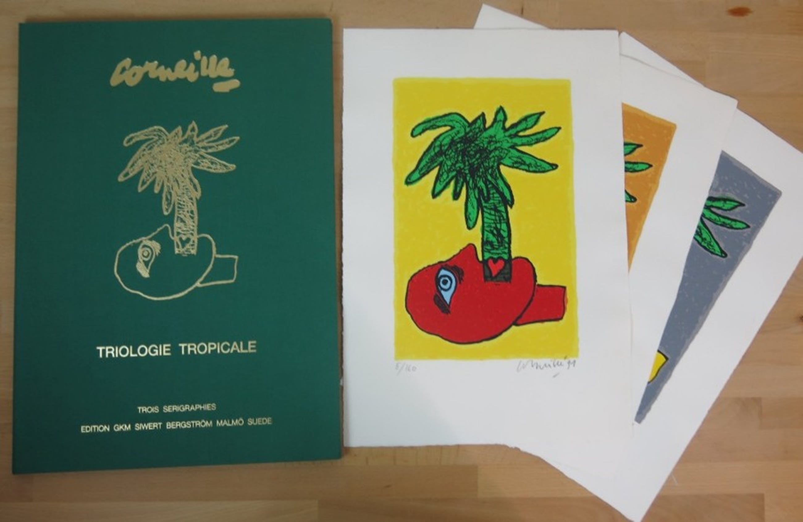 Portfolio Triologie Tropicale: 3 met potlood gesigneerde zeefdrukken van Corneille in een map uit 1991.