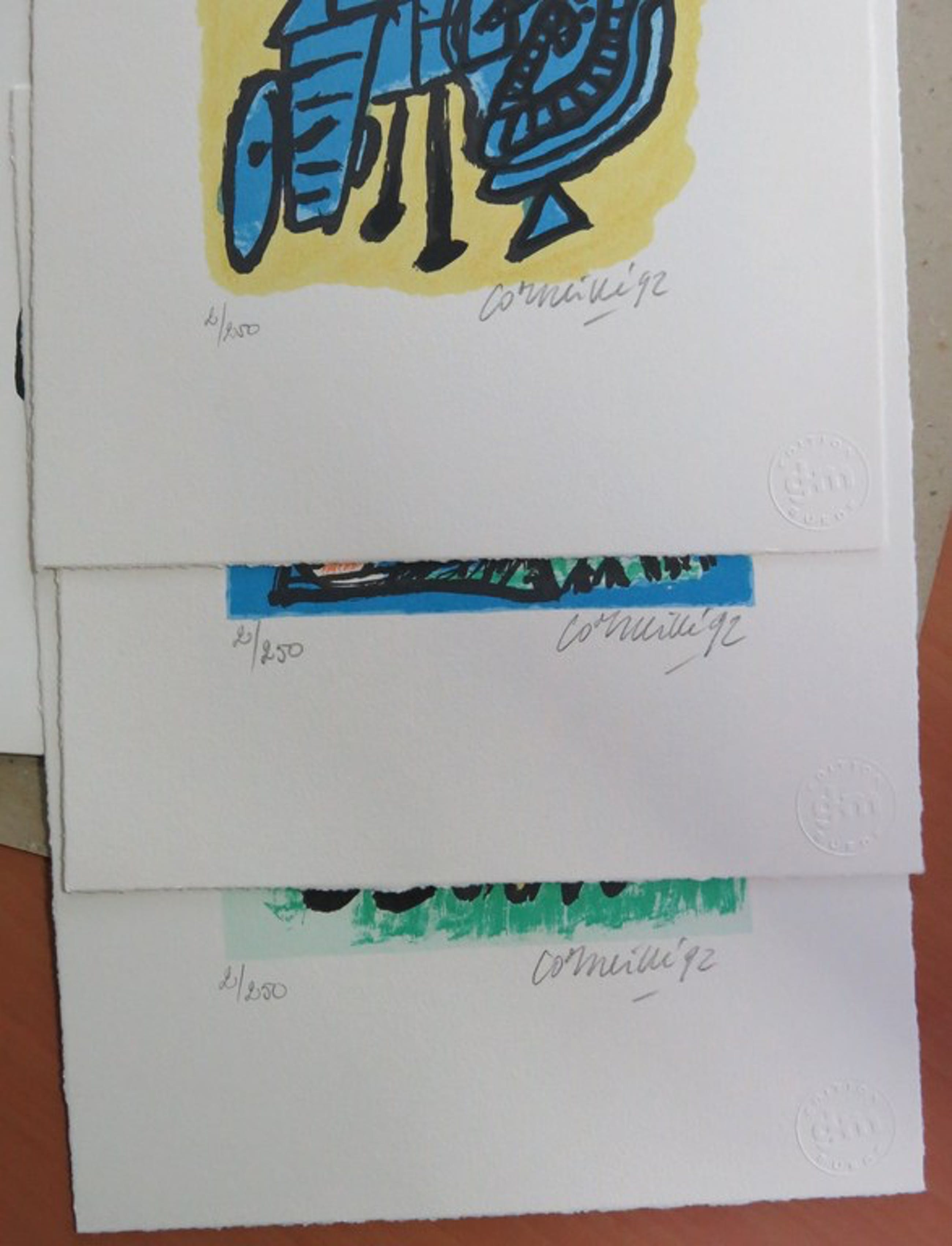 Portfolio Trois images d´un été: drie met potlood gesigneerde zeefdrukken van Corneille uit 1992 in map.