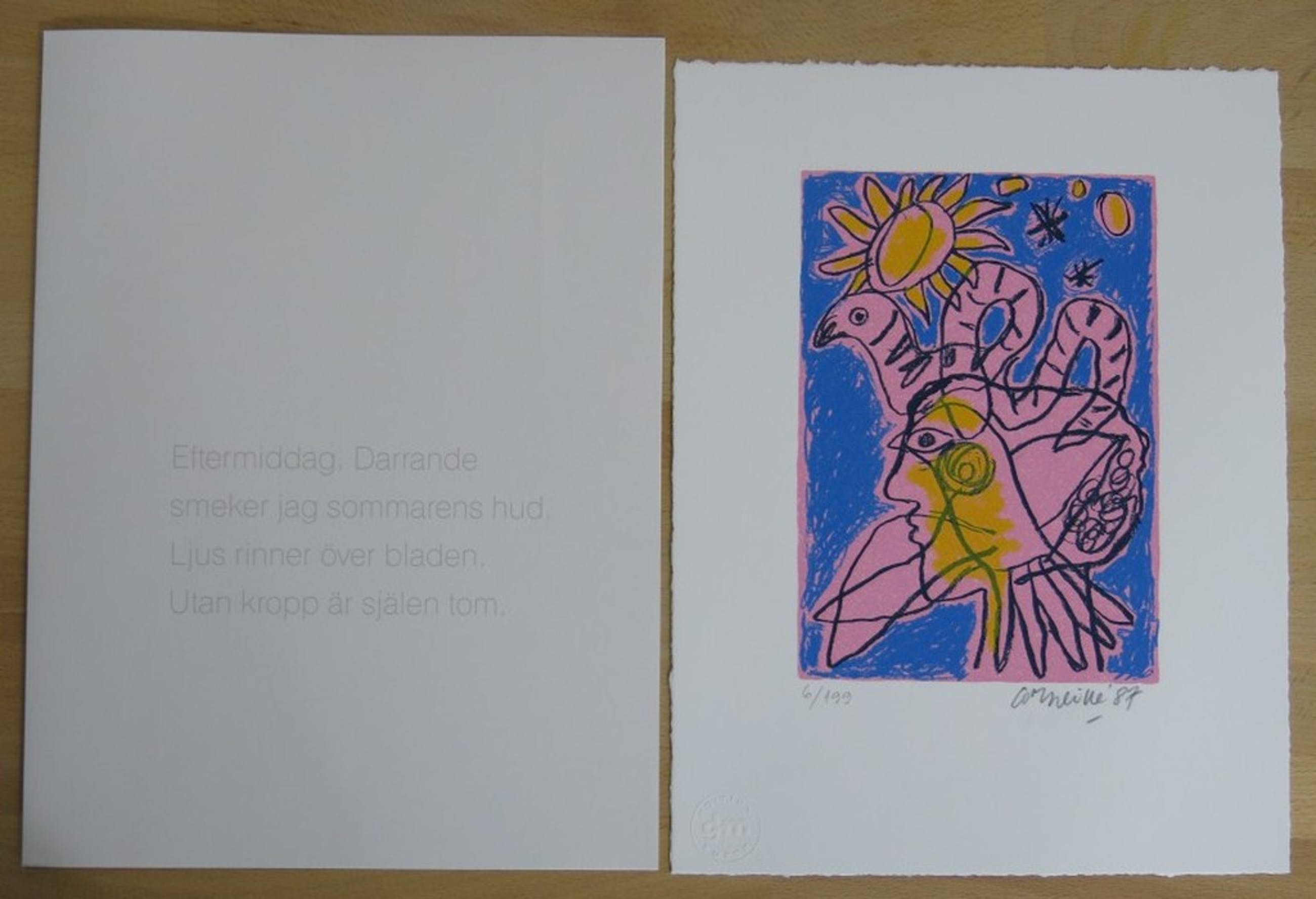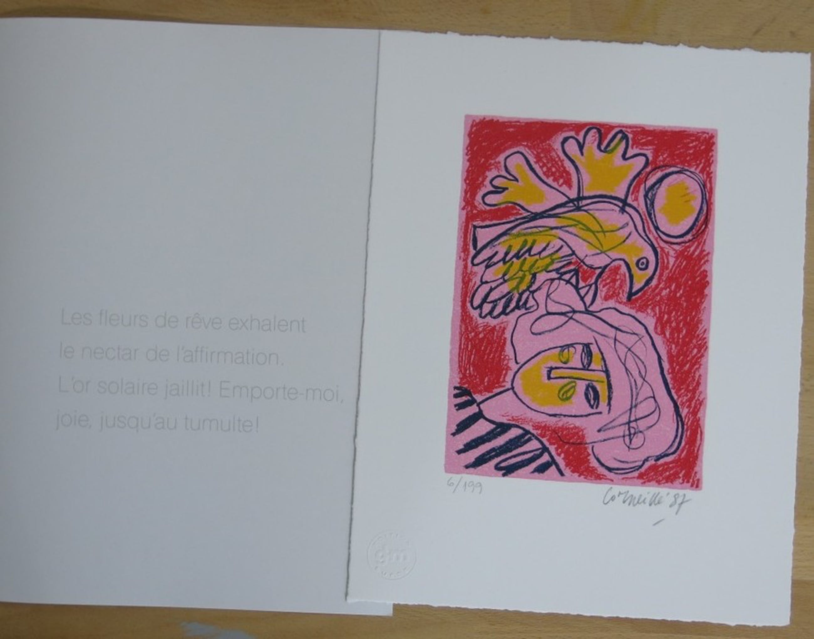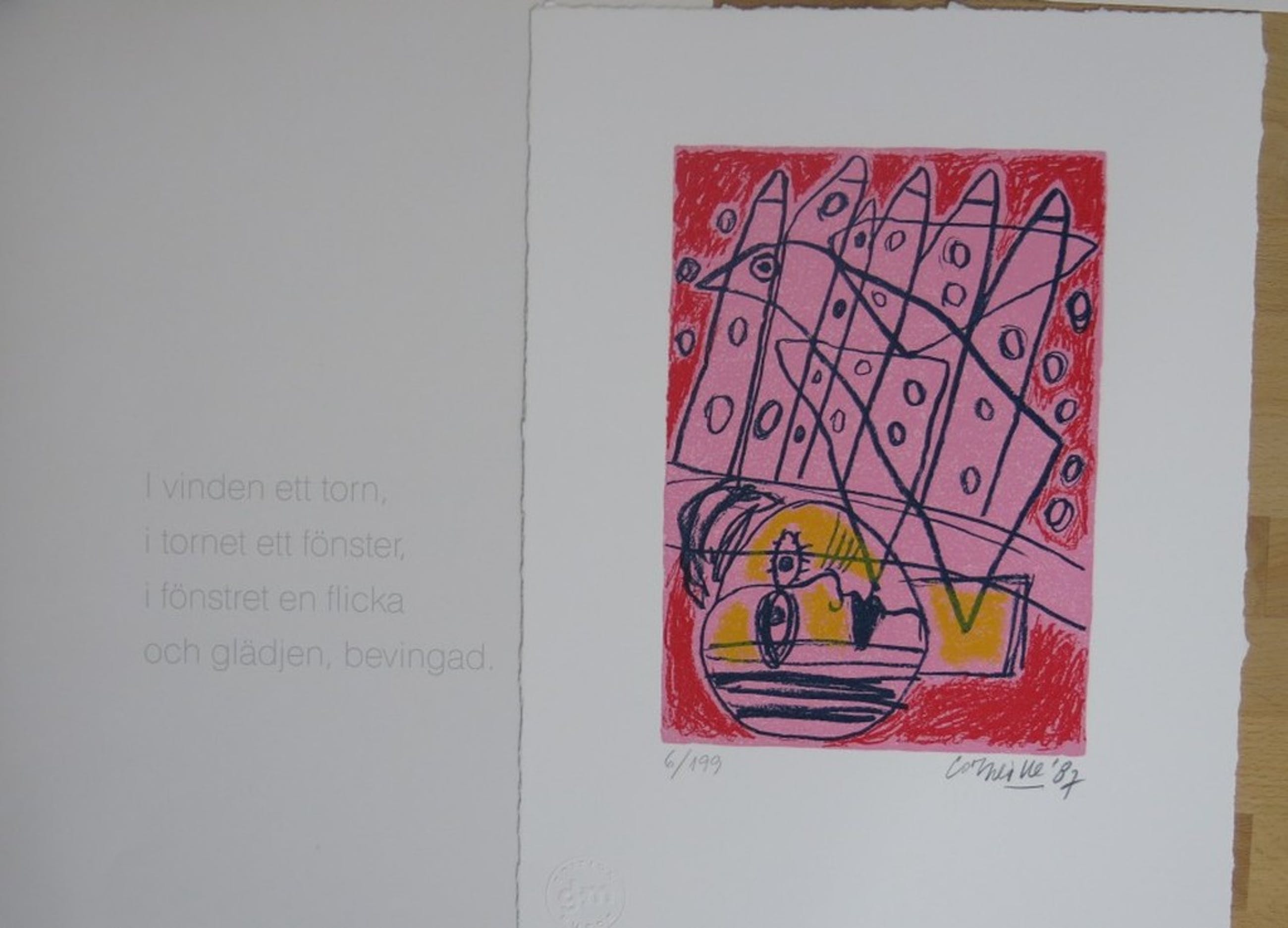 Allegro 4 zeefdrukken van Corneille met een gedicht van Lasse Söderberg in een paarskleurig portfolio.