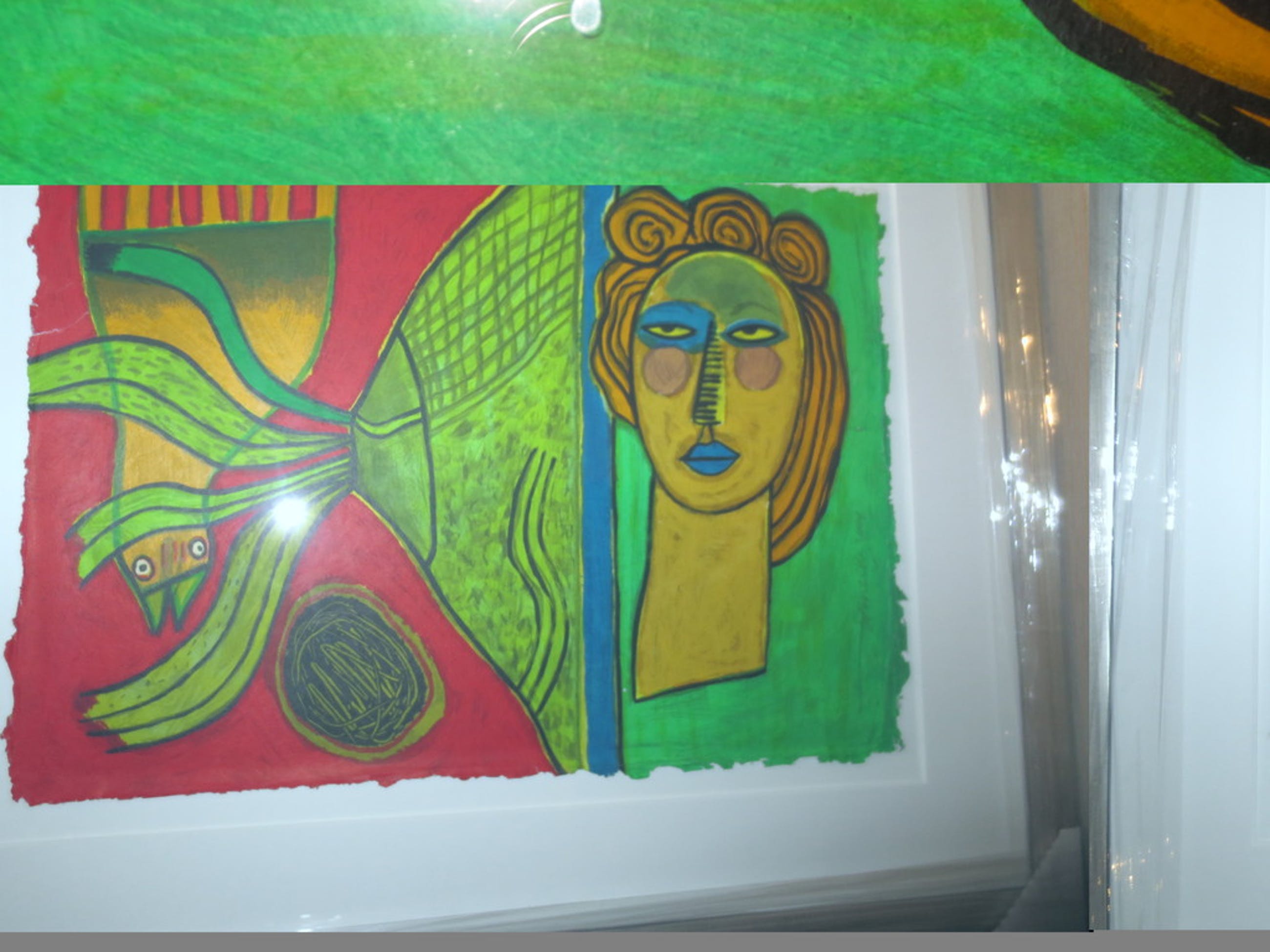 Zeer fraaie zeefdruk van Corneille. Geproduceerd op erg fijn en fraai handgeschept papier. De drukgangen lopen tot aan de scheprand! Ingelijst in een fraaie zilverkleurige handgemaakte lijst met een katoenen bievel-accent. Prachtig om te zien en een uniek werk van Corneille.