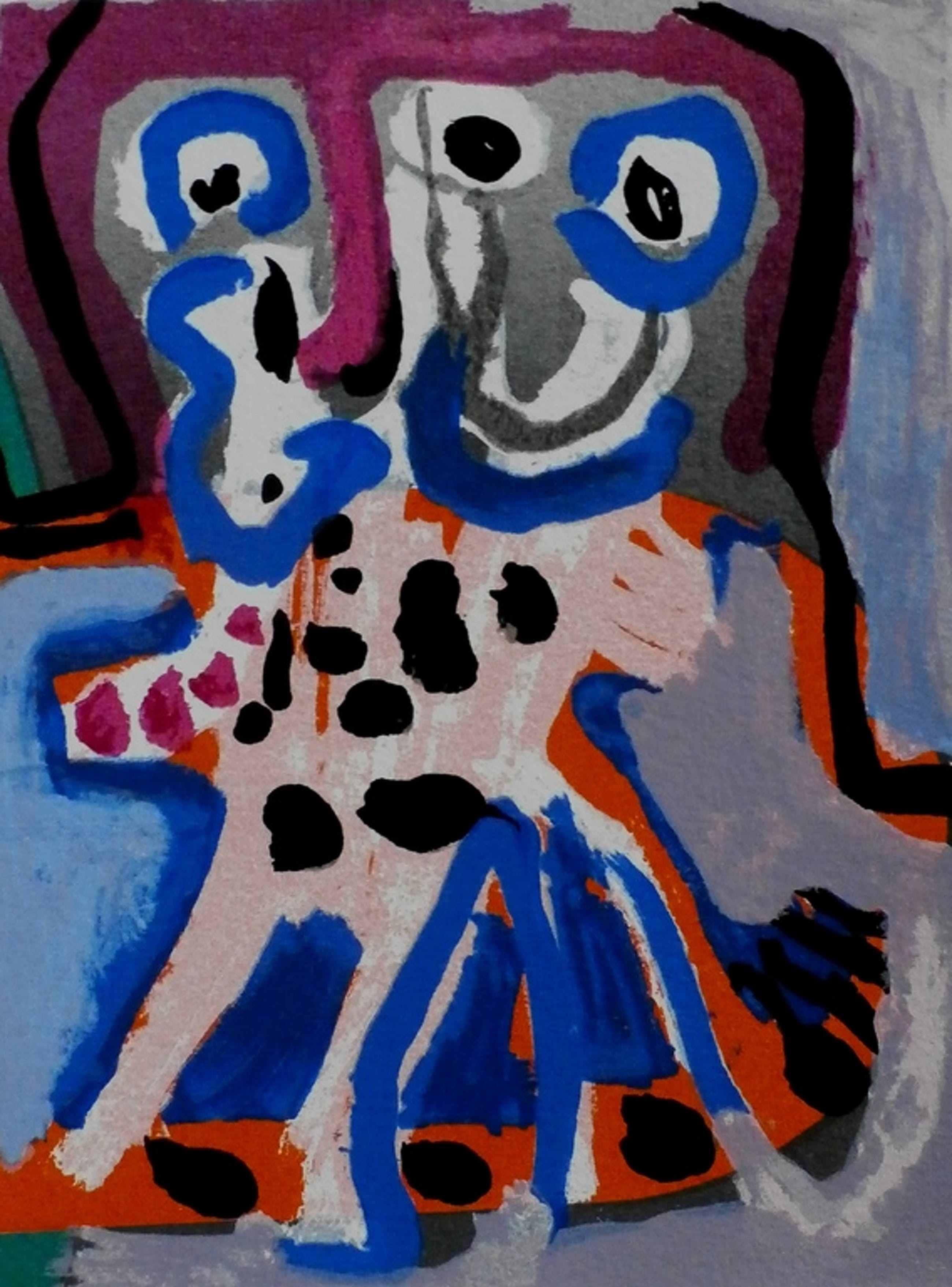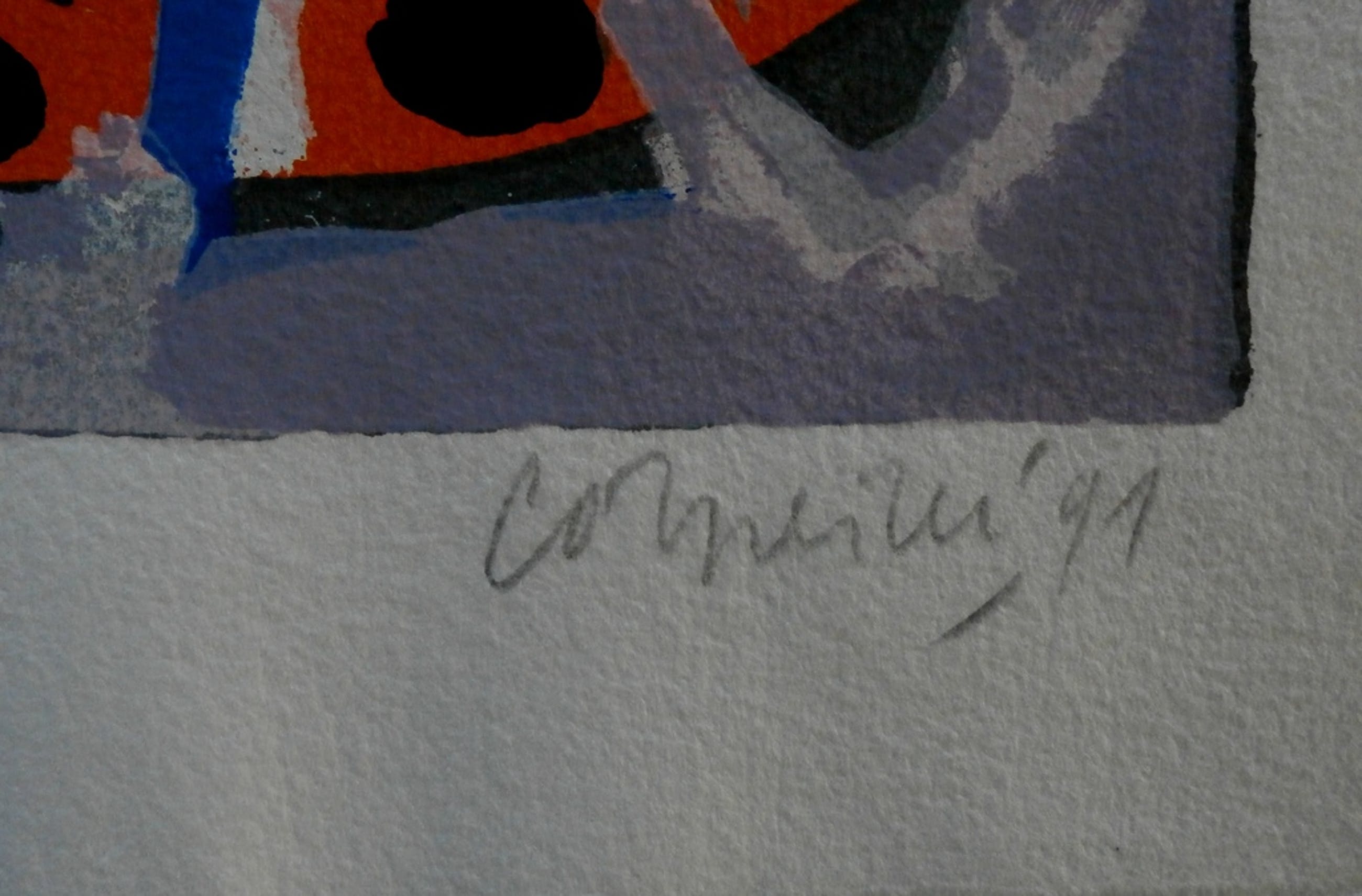 Zeefdruk van Corneille uit 1991. Titel: Schedel vol stem C. Afmetingen: h31 x b21 cm. Nummer: 65/250. Rechtsonder, met potlood, gesigneerd door de kunstenaar.