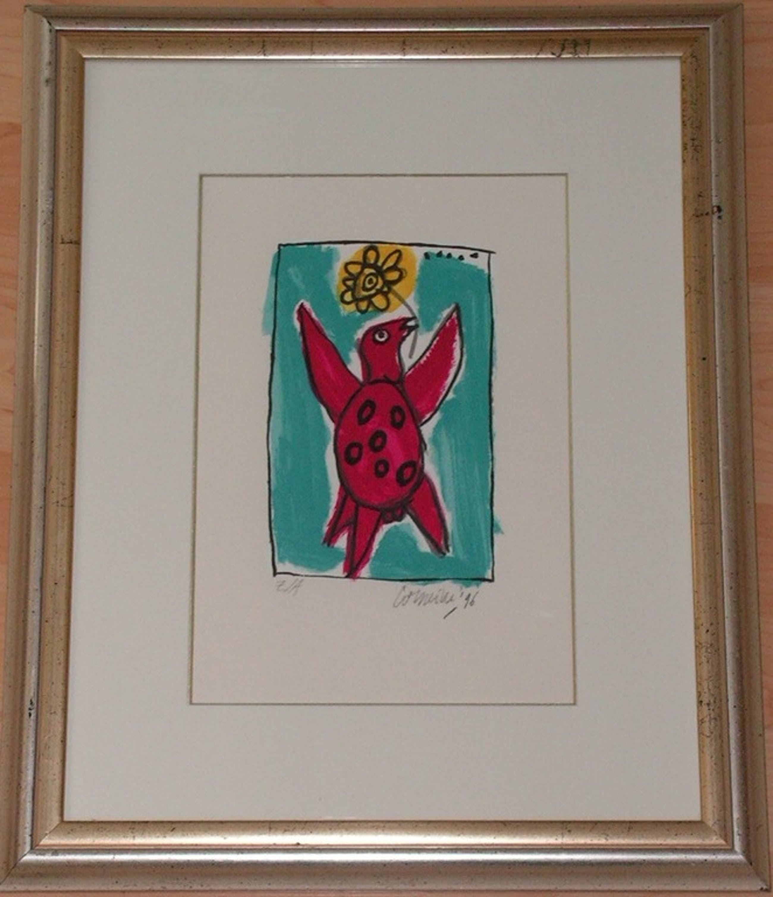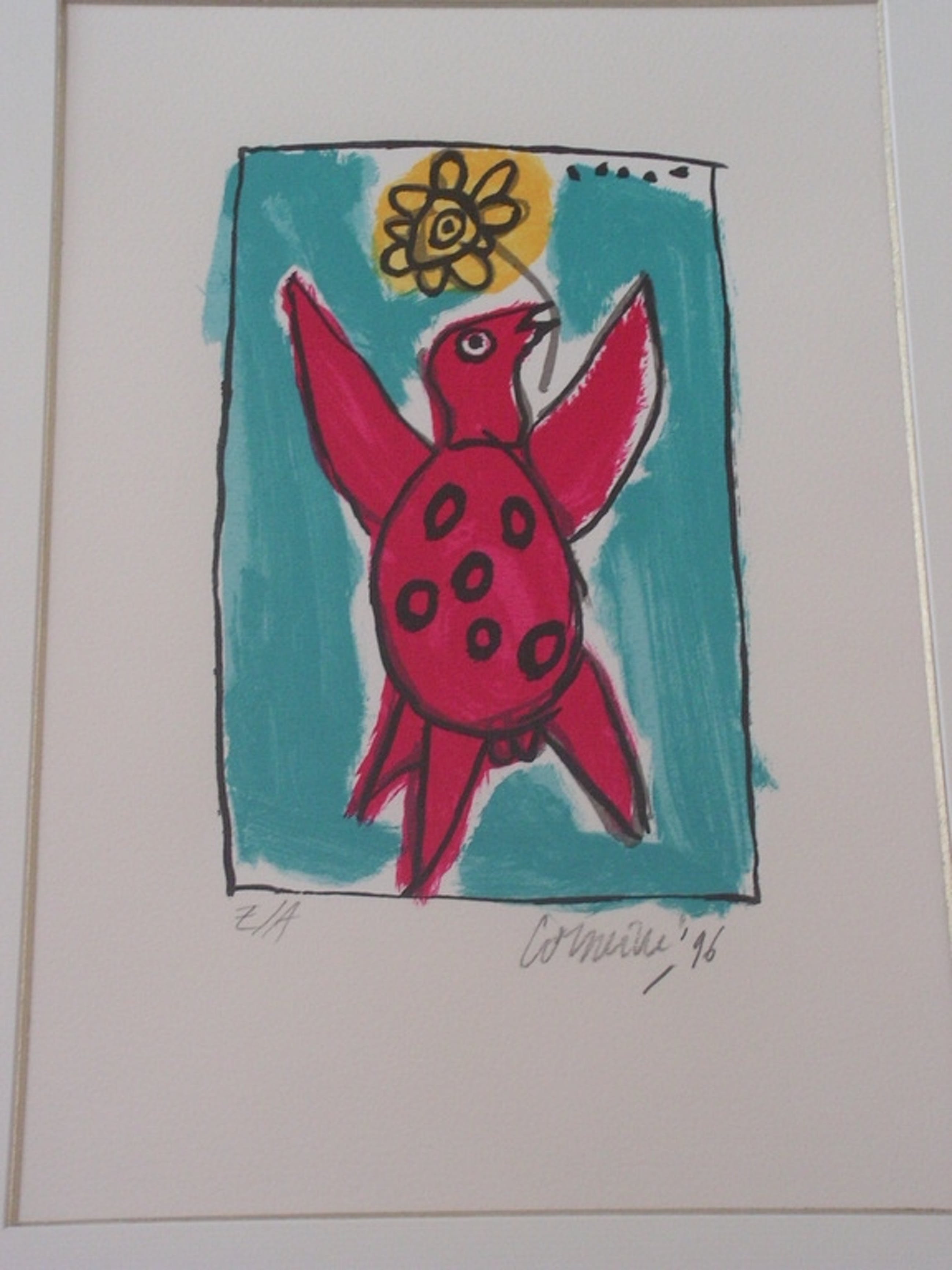 Vogel met bloem in de snavel. Zeefdrukje in EA oplage door Corneille.