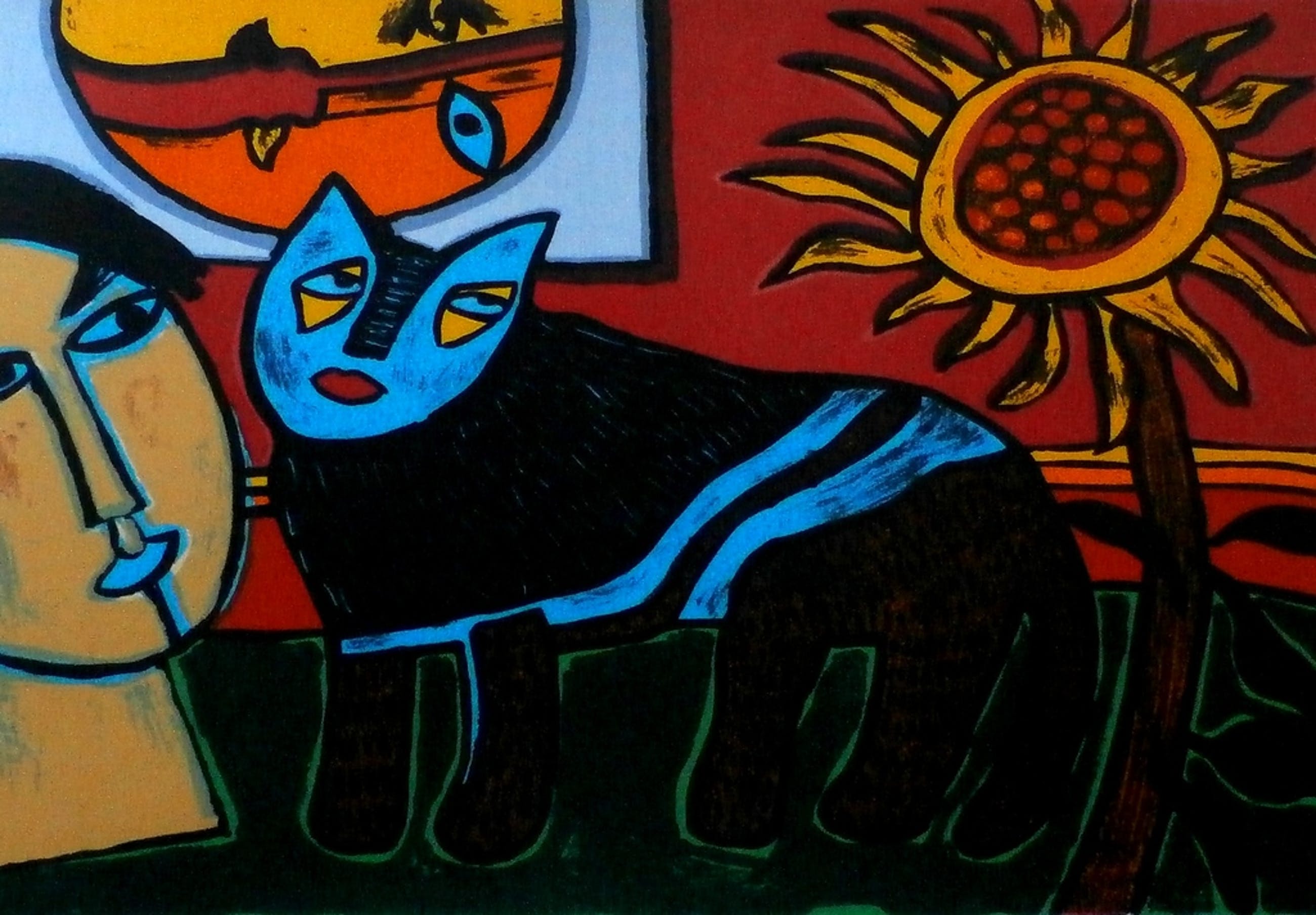 Ingelijste grote zeefdruk van Corneille op linnen; Mooie zerer heldere kleuren; jaar: 1998; nummer: 173/175; afm. incl. lijst: h118 x b150 cm; afm. voorstelling: h83 x b109 cm; het werk is rechtsonder, met fijnschrijver, gesigneerd door de kunstenaar. Een certificaat van echtheid wordt meegeleverd.