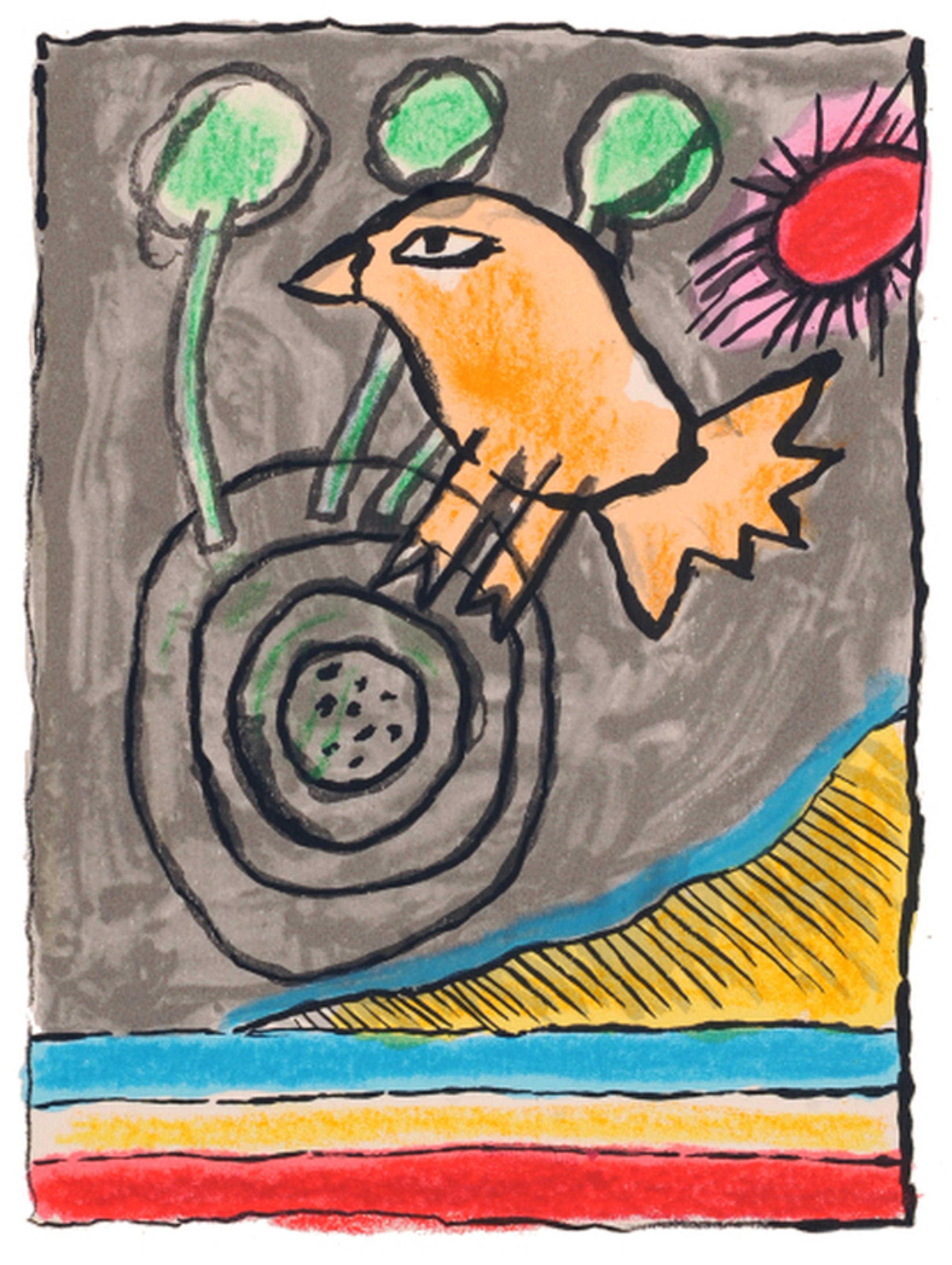 MOOIE ZEEFDRUK MET DE TITEL: LÓISEAU HEUREUX. FORMAAT VAN 38 X 30 CM. AAN DE BOVENZIJDE, IN HET WITTE KADER IS HET WERK ENIGSINDS GERIBBELD. DIT ZAL NA HET INLIJSTEN NIET MEER TE ZIEN ZIJN.