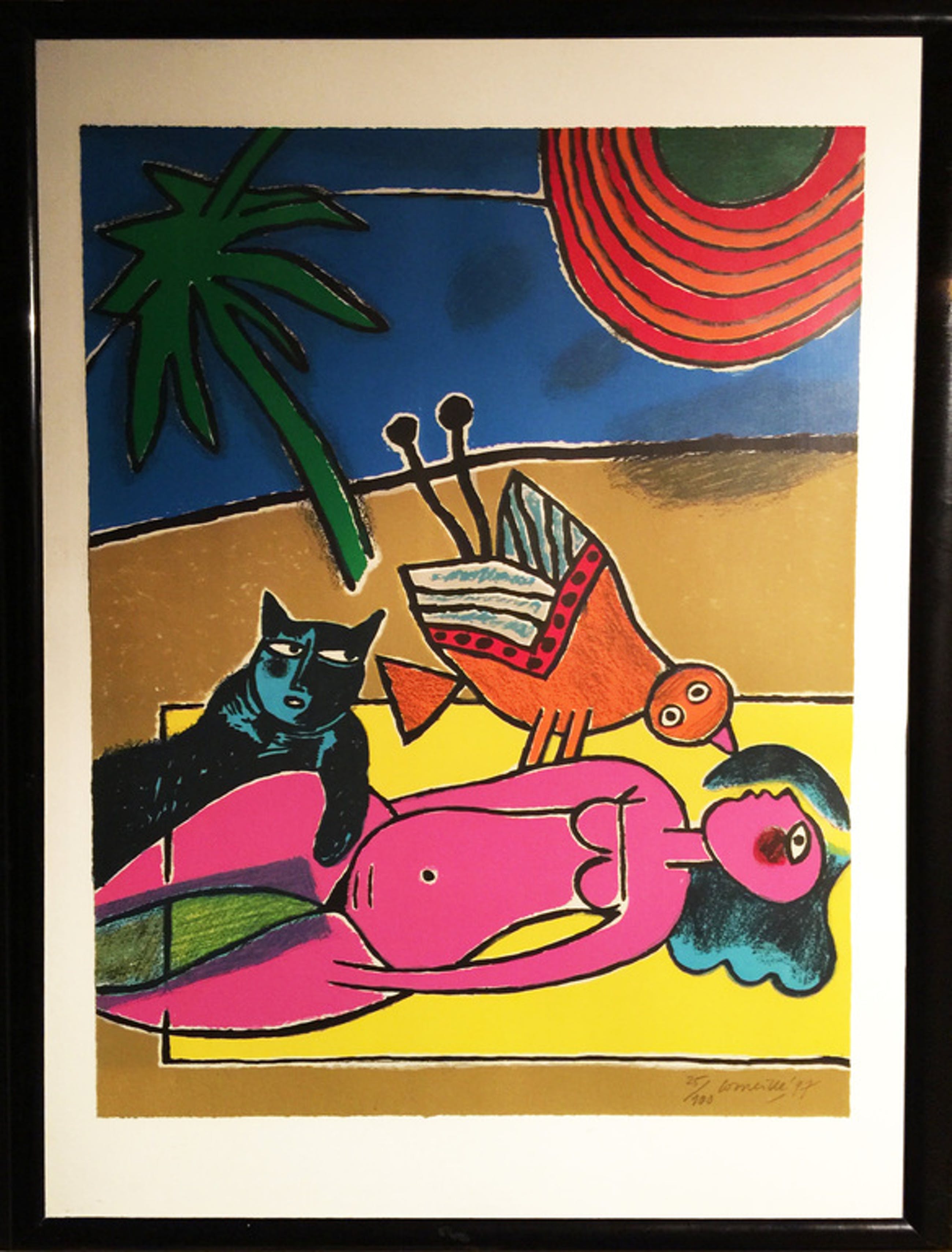 Lithografie van Corneille uit een oplage van 100. Het werk is met de hand gesigneerd (in 1997) met nr. 25/100 en eventueel te koop in combinatie met de lithografie " Couple sous un Ciel' die dezelfde maten en kleurstelling heeft en met hetzelfde nummer 25/100 is gesigneerd en genummerd. De grafiek is ingelijst met passe partout en zwarte kunststof lijst met een uiteindelijke afmeting van 63,5 x 83 cm ( afmeting van de grafiek is 51,5 x 65 cm.