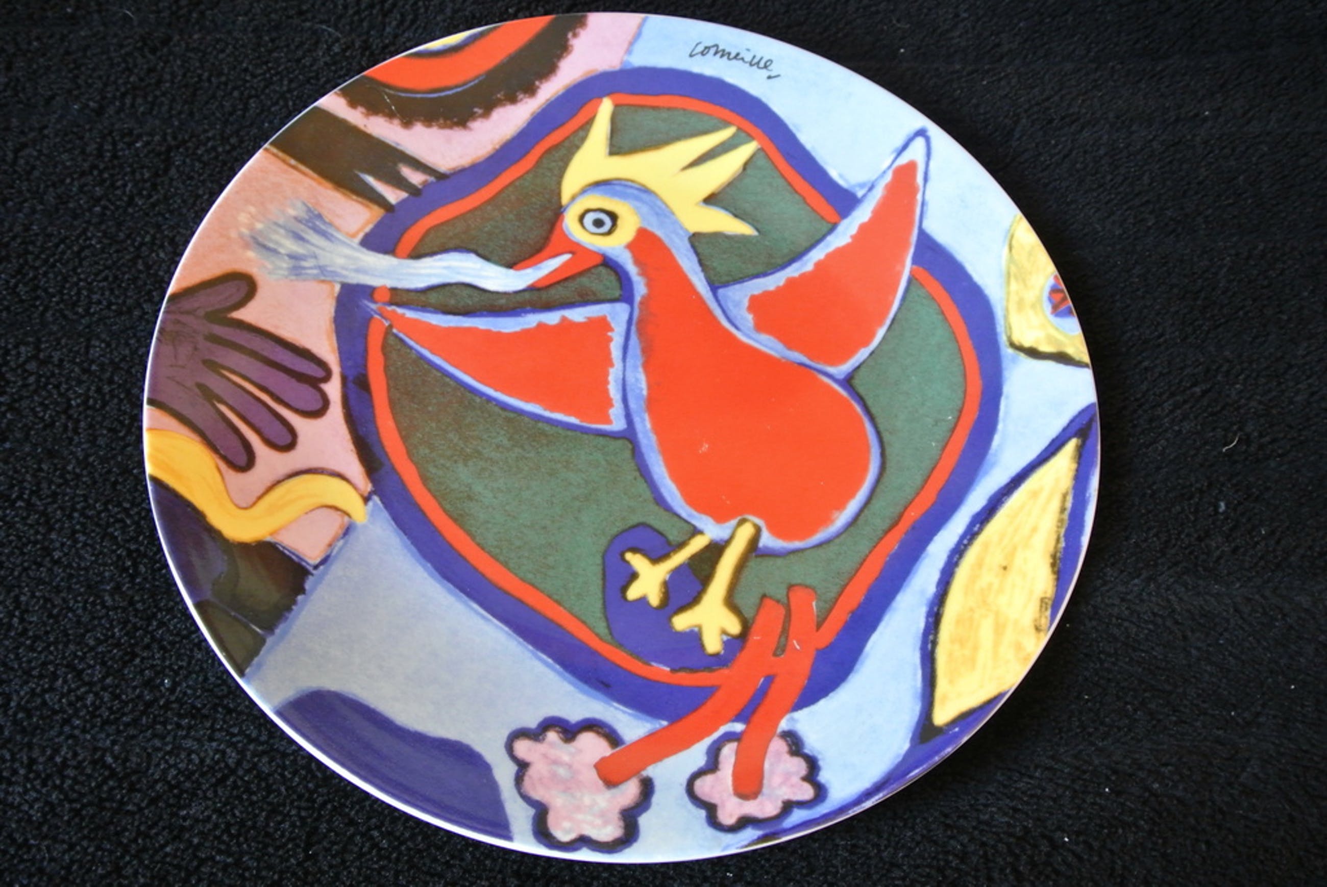 Dit is een kleurig groot sierbord of schaal met daarop afgebeeld oa een rode vogel (vuurvogel) van de bekende Nederlandse kunstschilder Corneille (1922-2010), geboren als Corneille Guillaume Beverloo. Met onder andere Karel Appel was hij eind jaren 40 de mede-oprichter van de Cobra Beweging.
