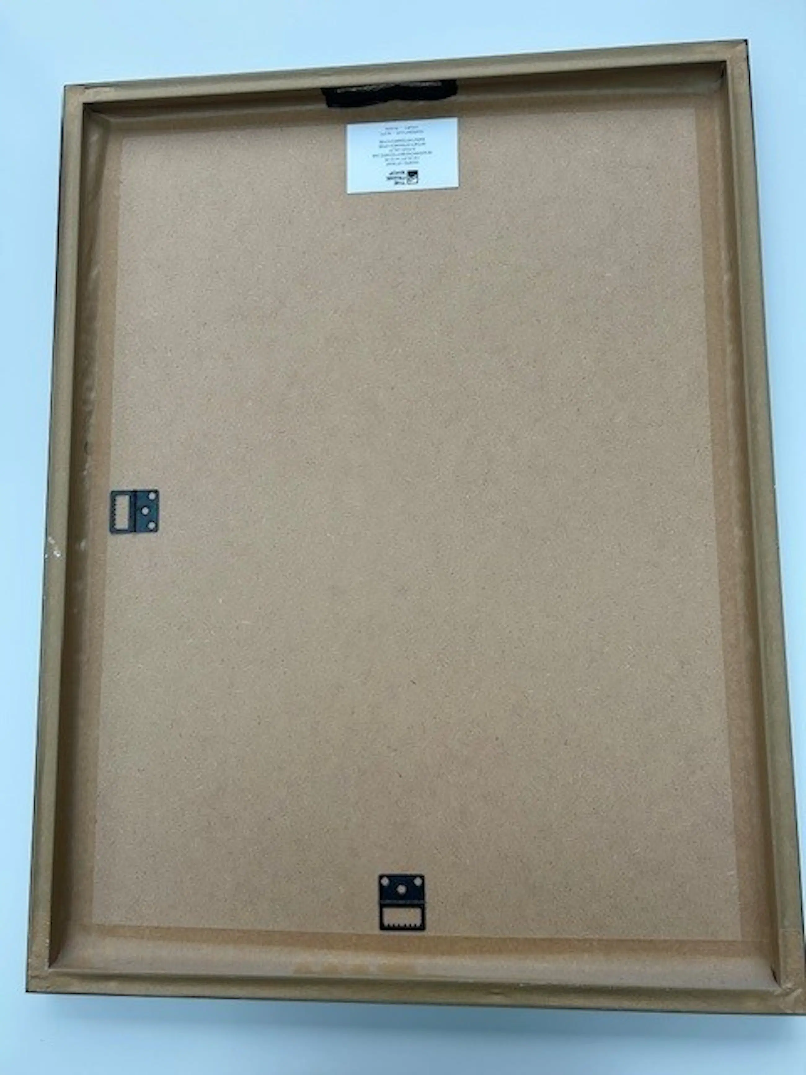 Professioneel ingelijst met een op maat gemaakt minimalistisch zwart metalen frame en art-glas.