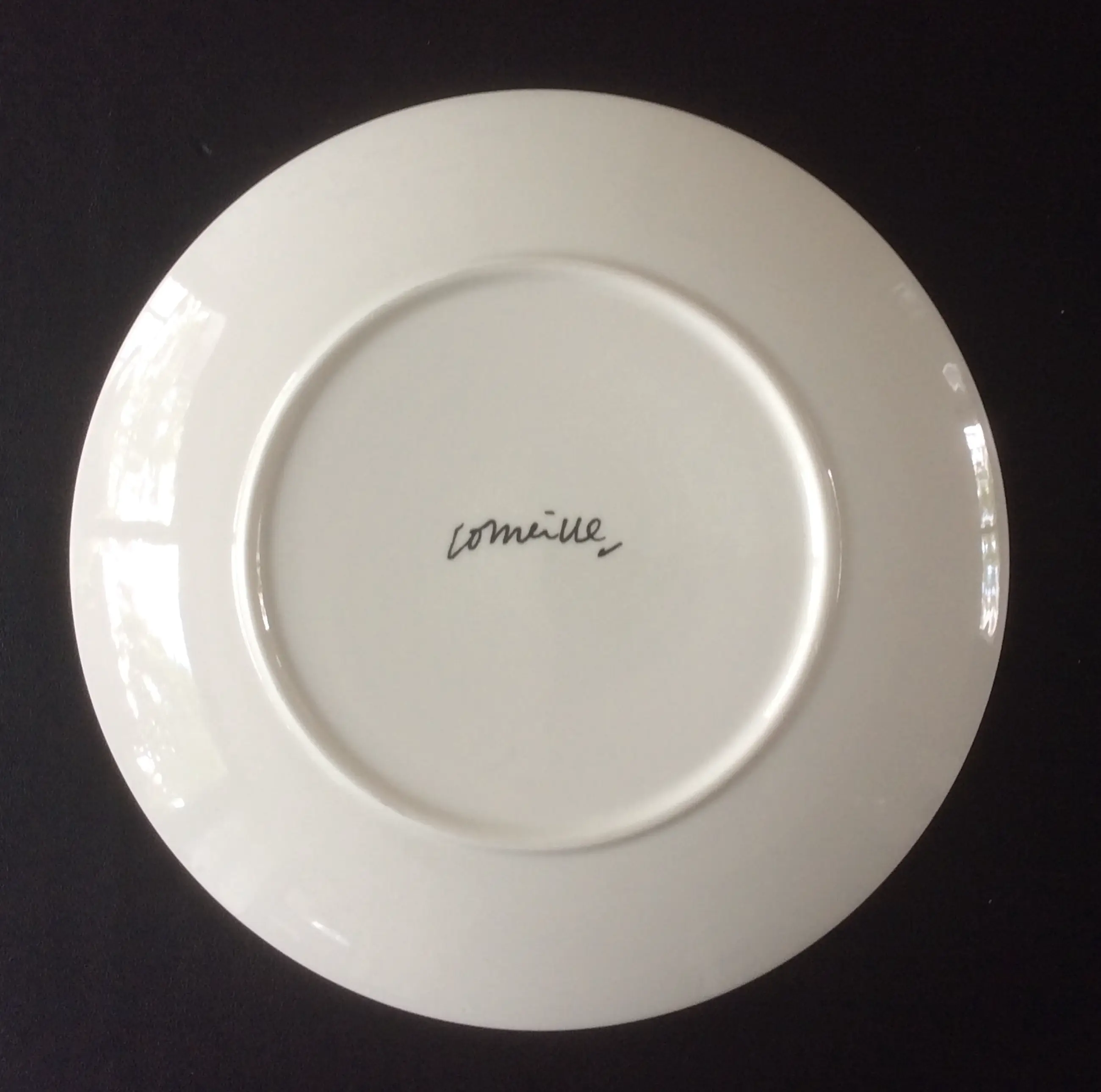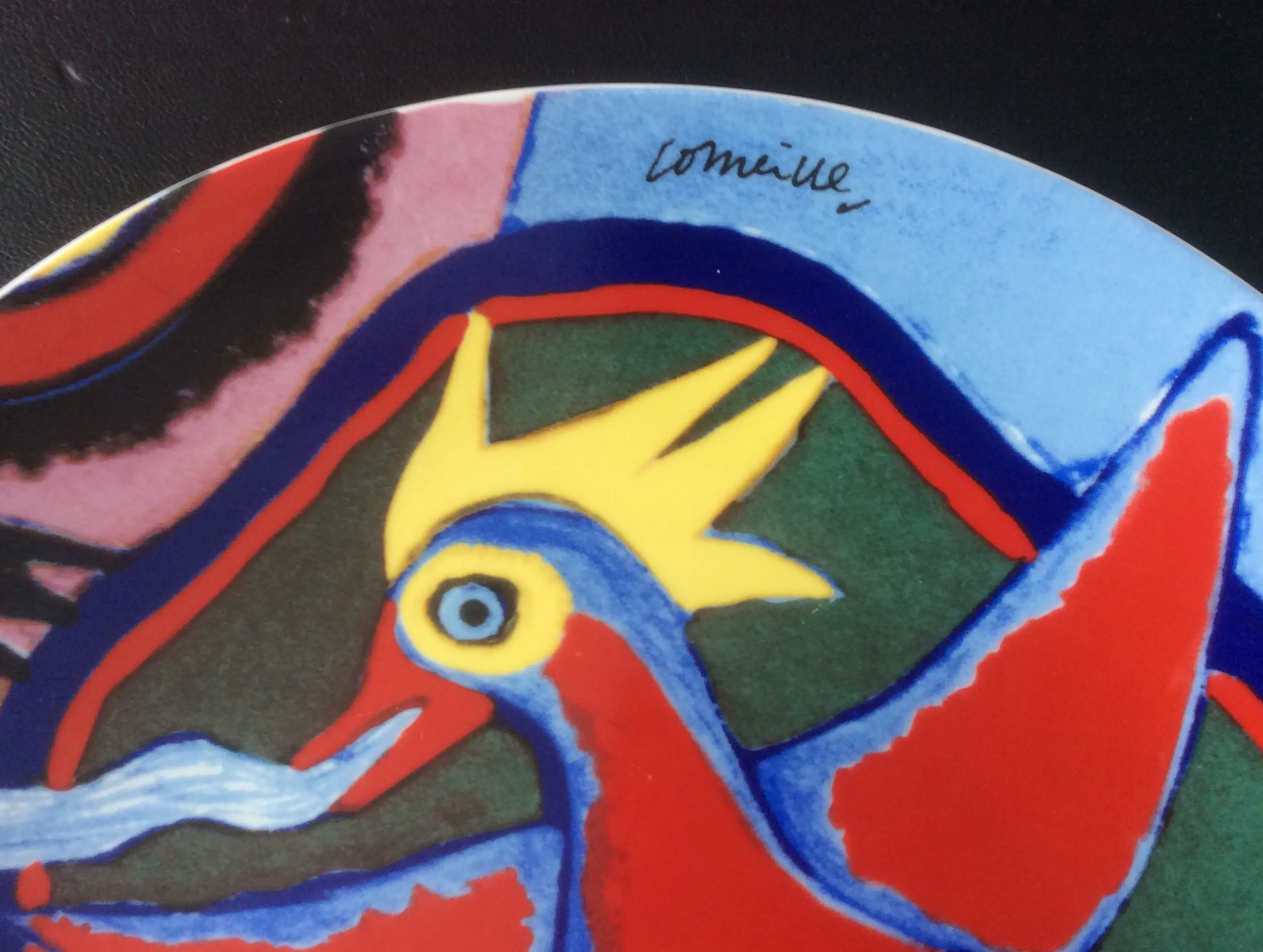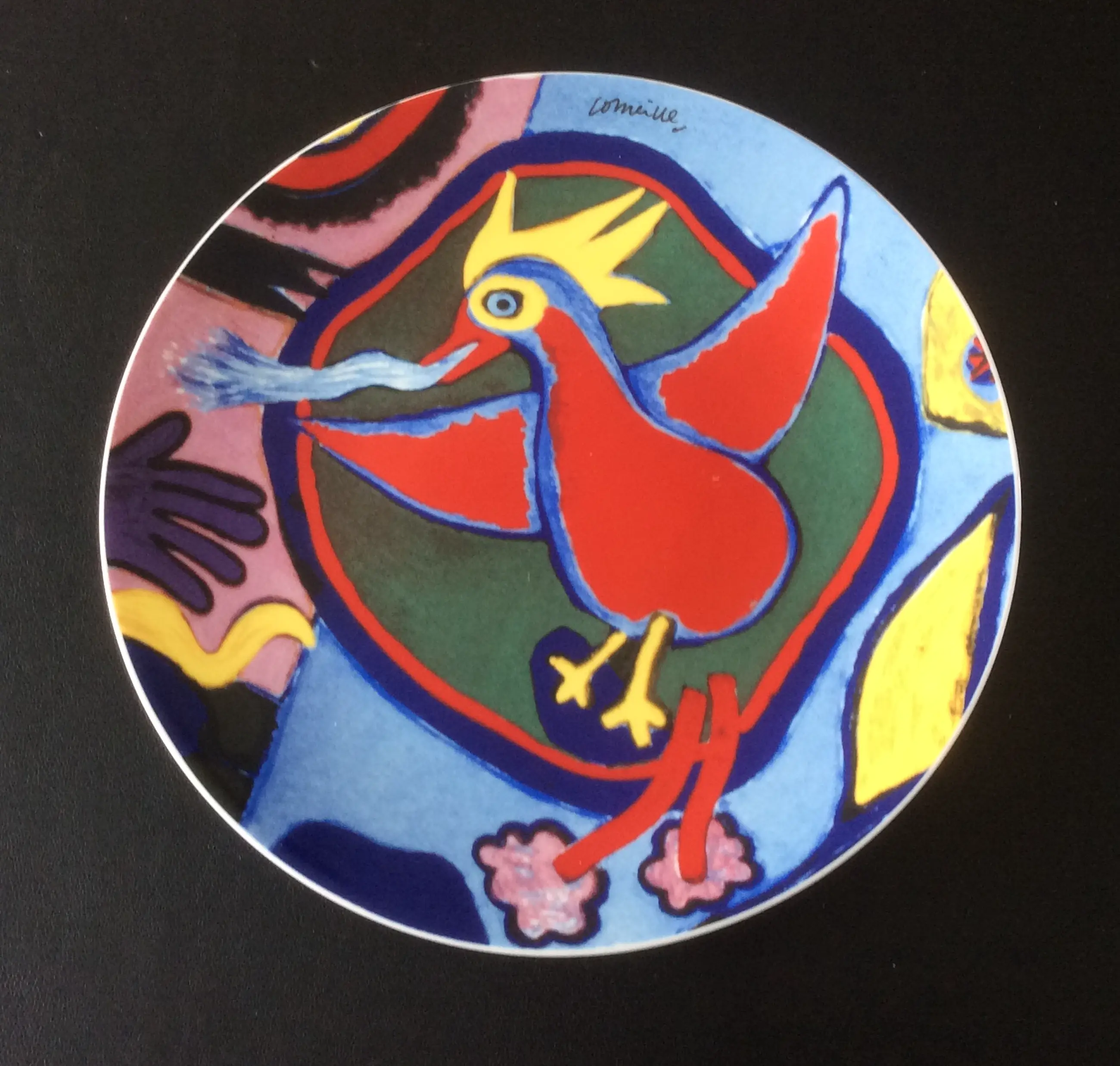 Een fraaie schotel met de afbeelding van een werk van Corneille, genaamd “De Vuurvogel”. Gesigneerd aan voor- en achterzijde.