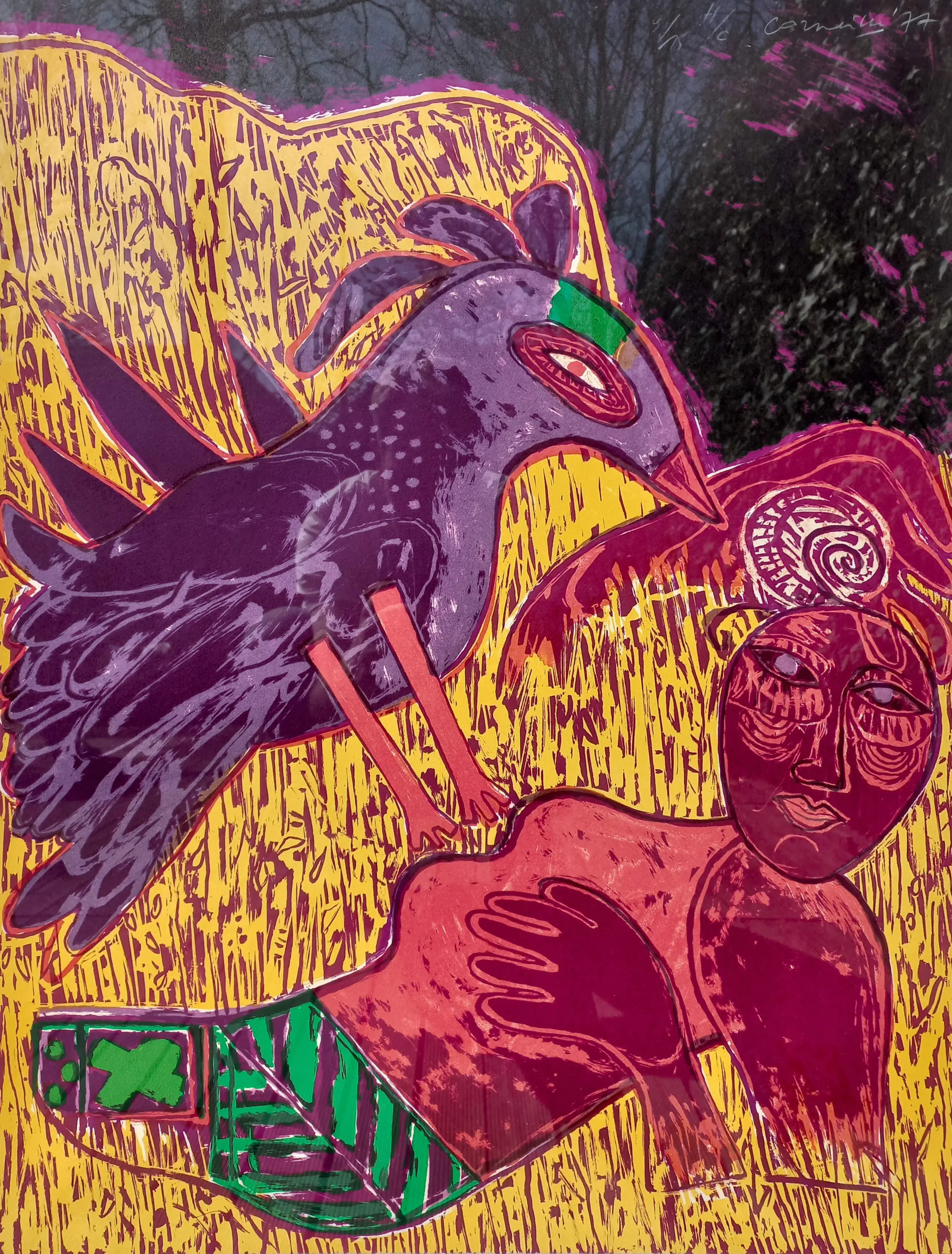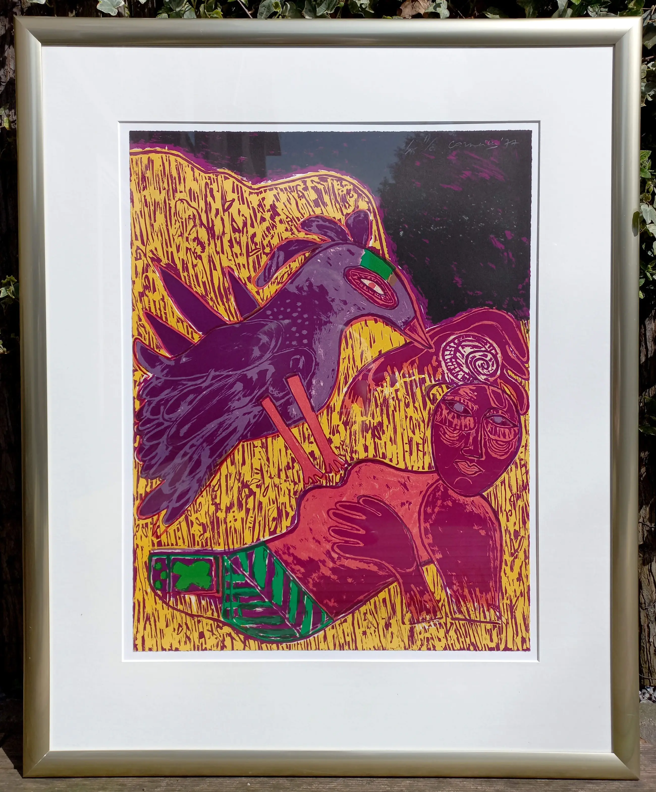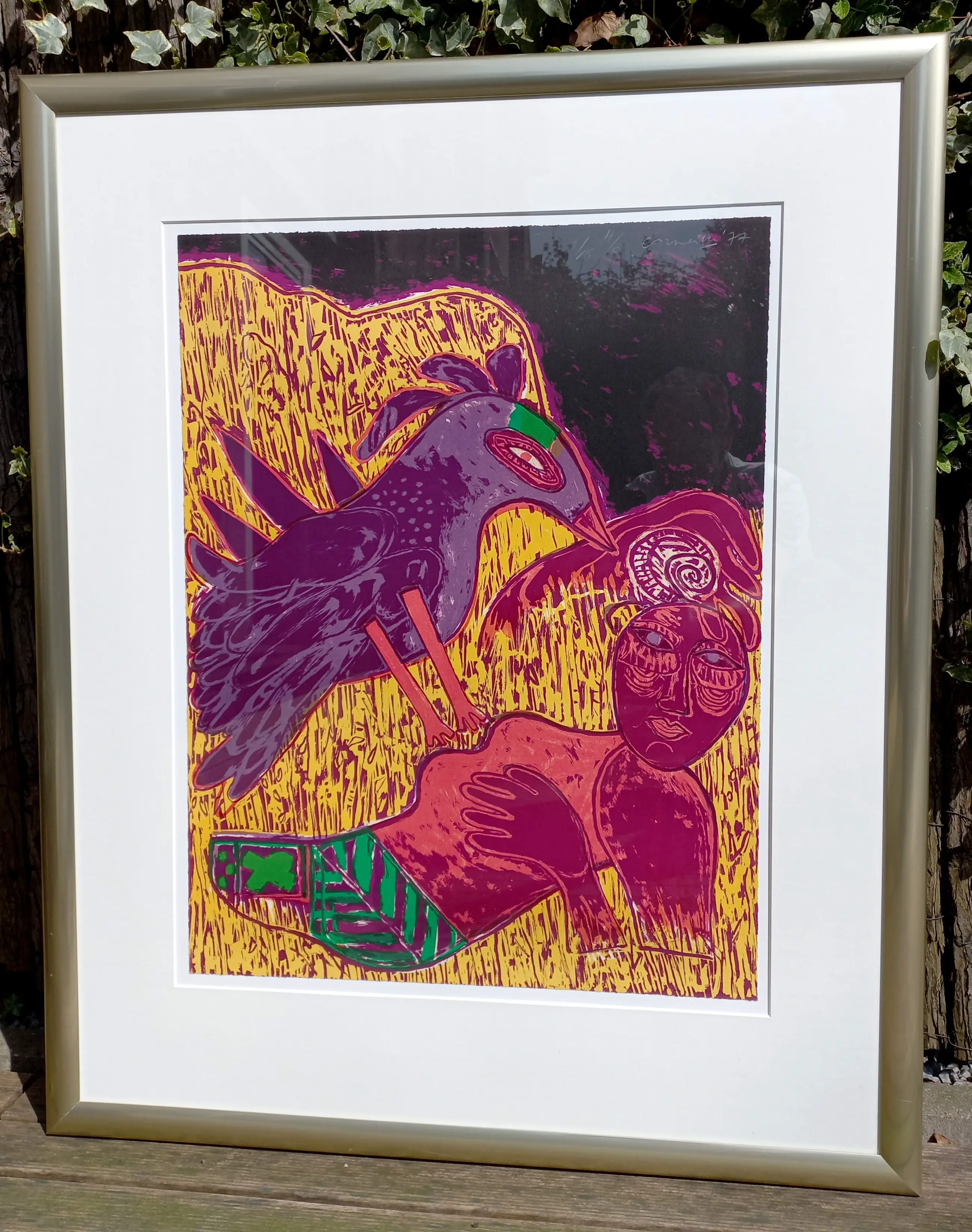 Litho op geschept papier, met potlood gesigneerd, gedateerd (‘77) en genummerd (H/C 9/15). Het volledige blad in strakke lijst, achter glas en met smetteloos, zuurvrij passe-partout. Alles in zeer goede conditie. Galerieprijs: 1100-1300 euro (zonder lijst).
