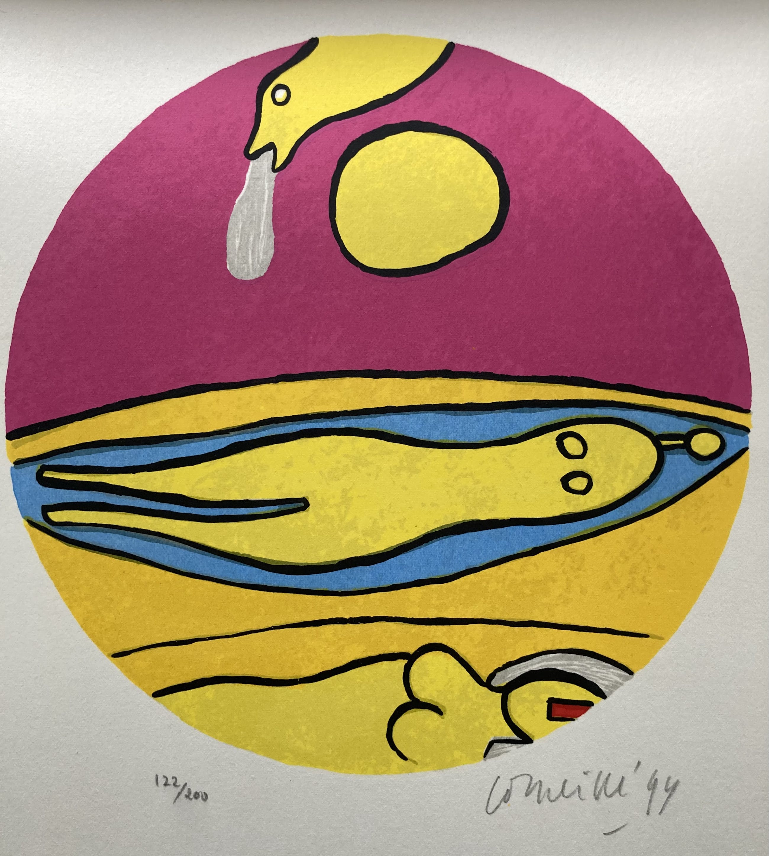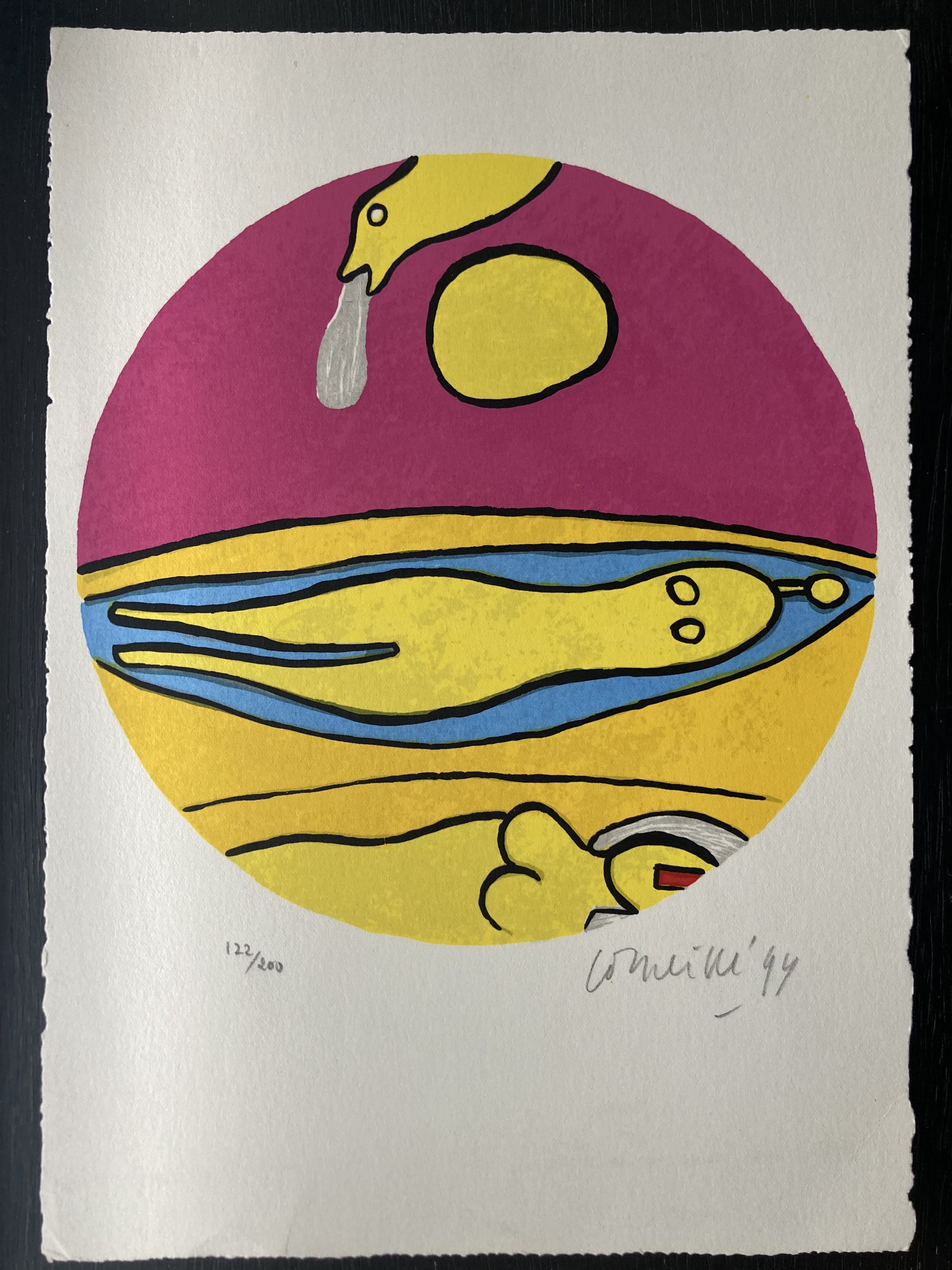 Corneille zeefdruk op dik papierTitel : droombeeld ( uit een serie van 14 stuks)In potlood gesigneerd , genummerd en gedateerd.Maat 30.5 x 21.5 cmMaat beeld rond 20 cm Nooit ingelijst , mint condition
