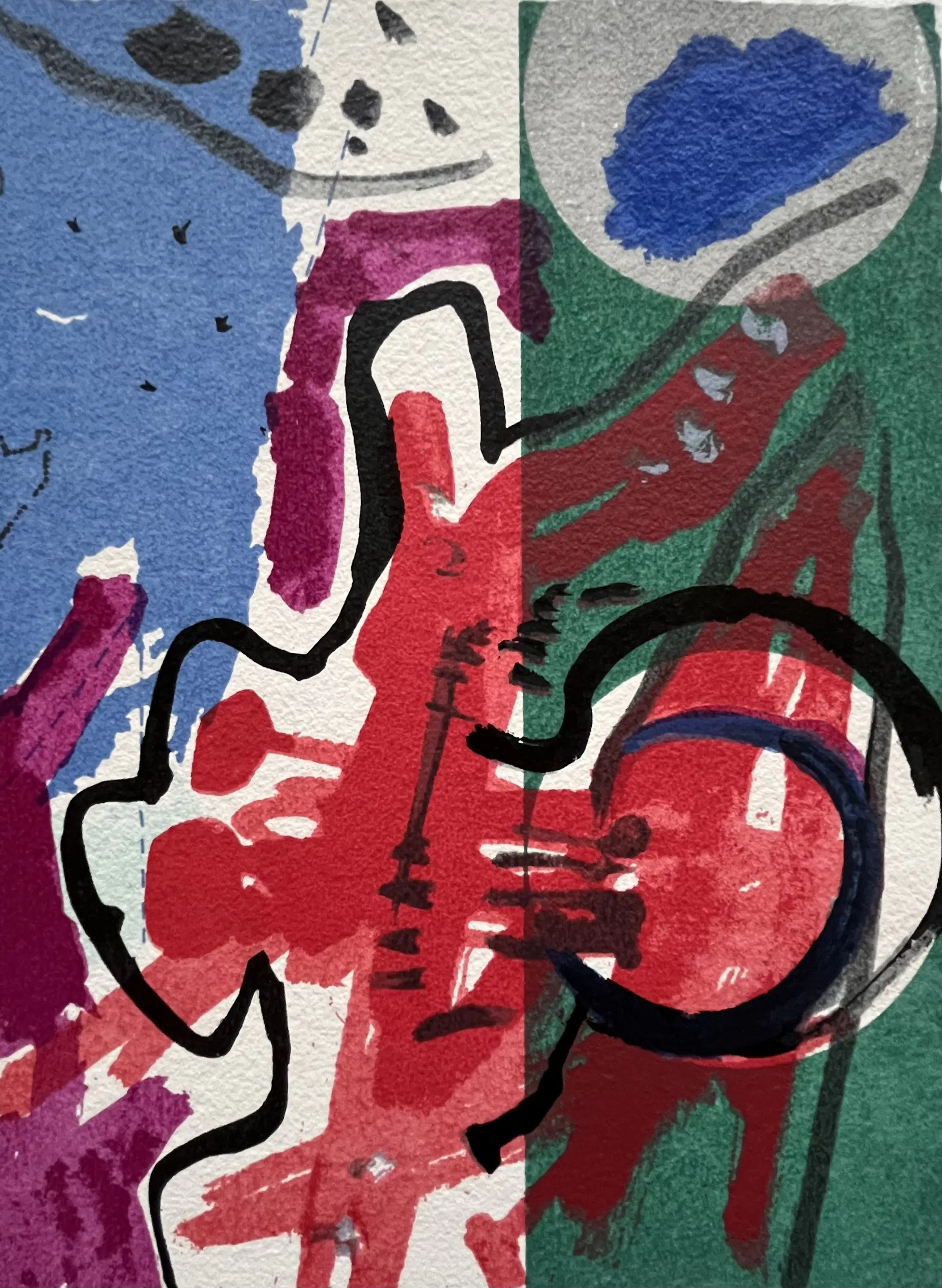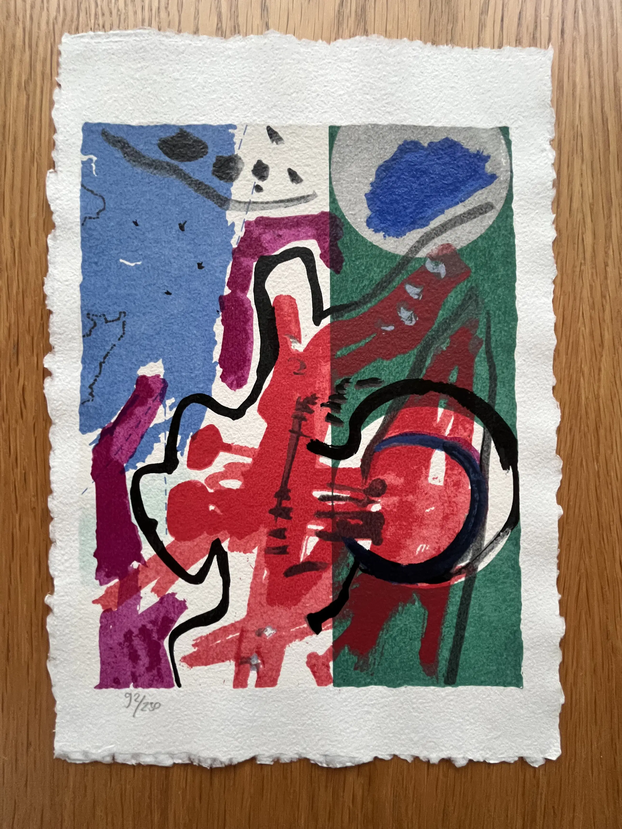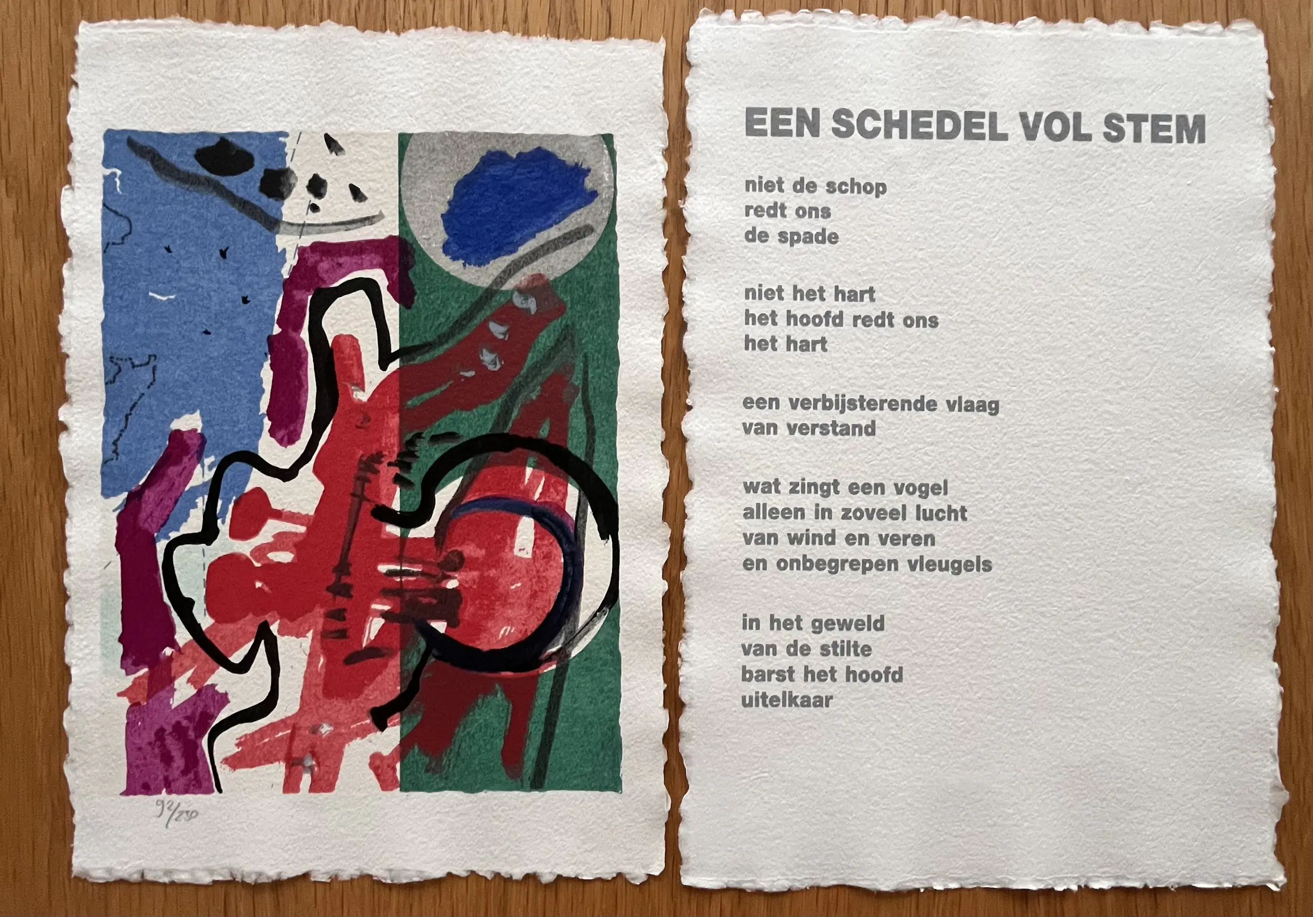 'Een schedel vol stem' Corneille. Zeefdruk uit de gelijknamige kunstbundel uit 1991. Uitgegeven door Jaski ART productions. Dit werk komt uit oplage 92/250 samen met 4 andere werken van deze kunstenaar. De andere werken zijn gesigneerd door Corneille, behalve deze. Waarschijnlijk een vergetelheid ;-) Het is hem vergeven. Wel gedateerd. Komt met een gedicht van Bert Schierbeek. Zeer goede staat. Zal veilig en vlak verzonden worden.