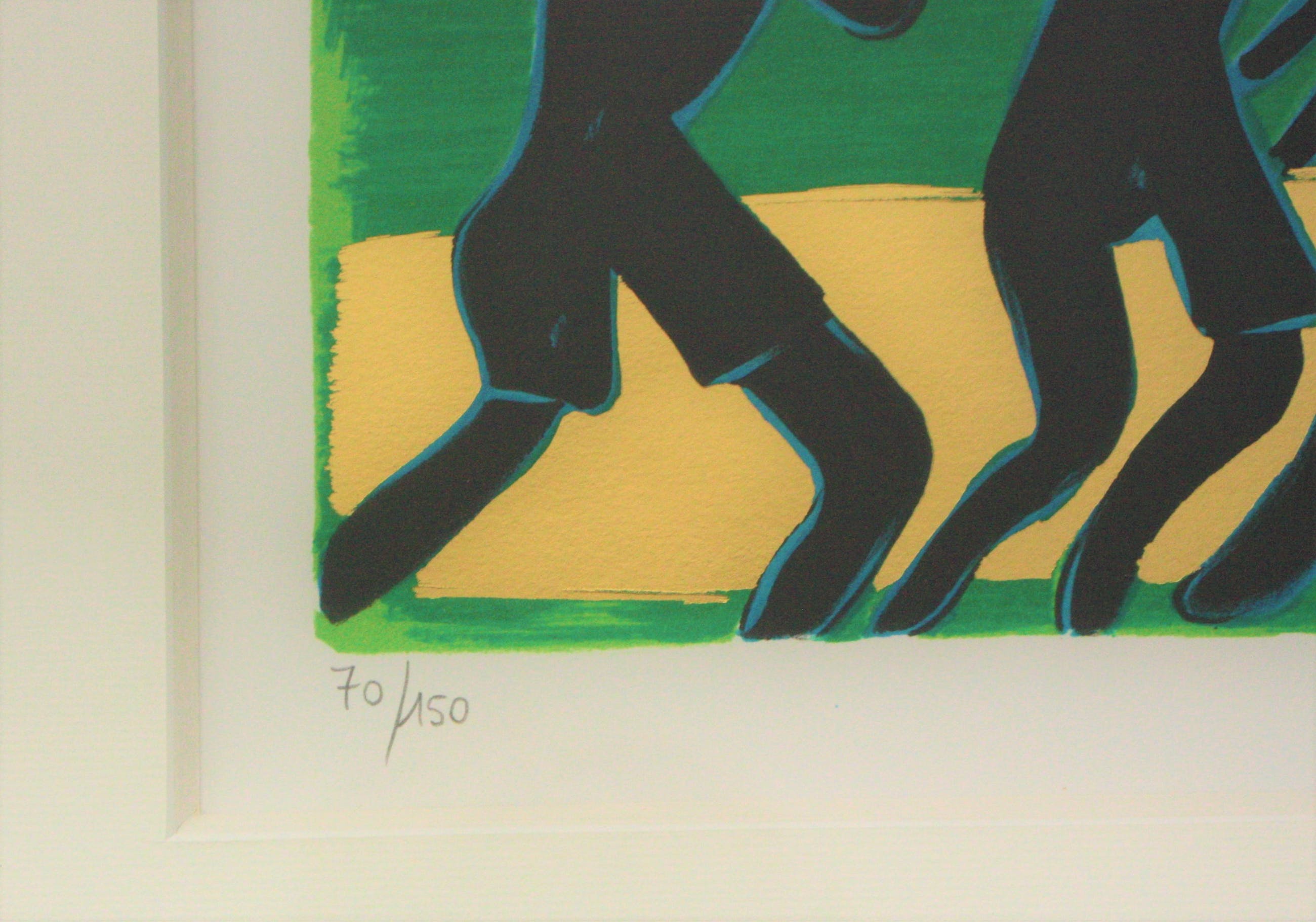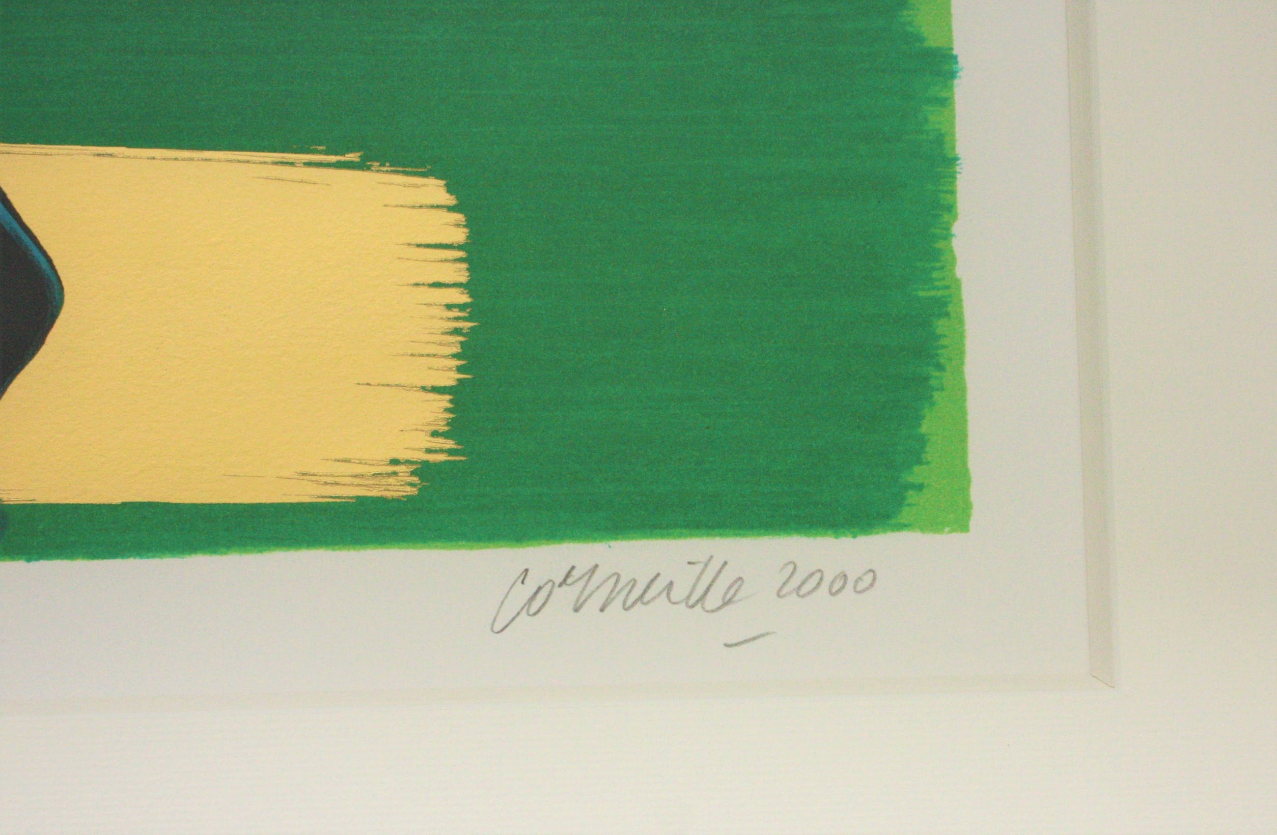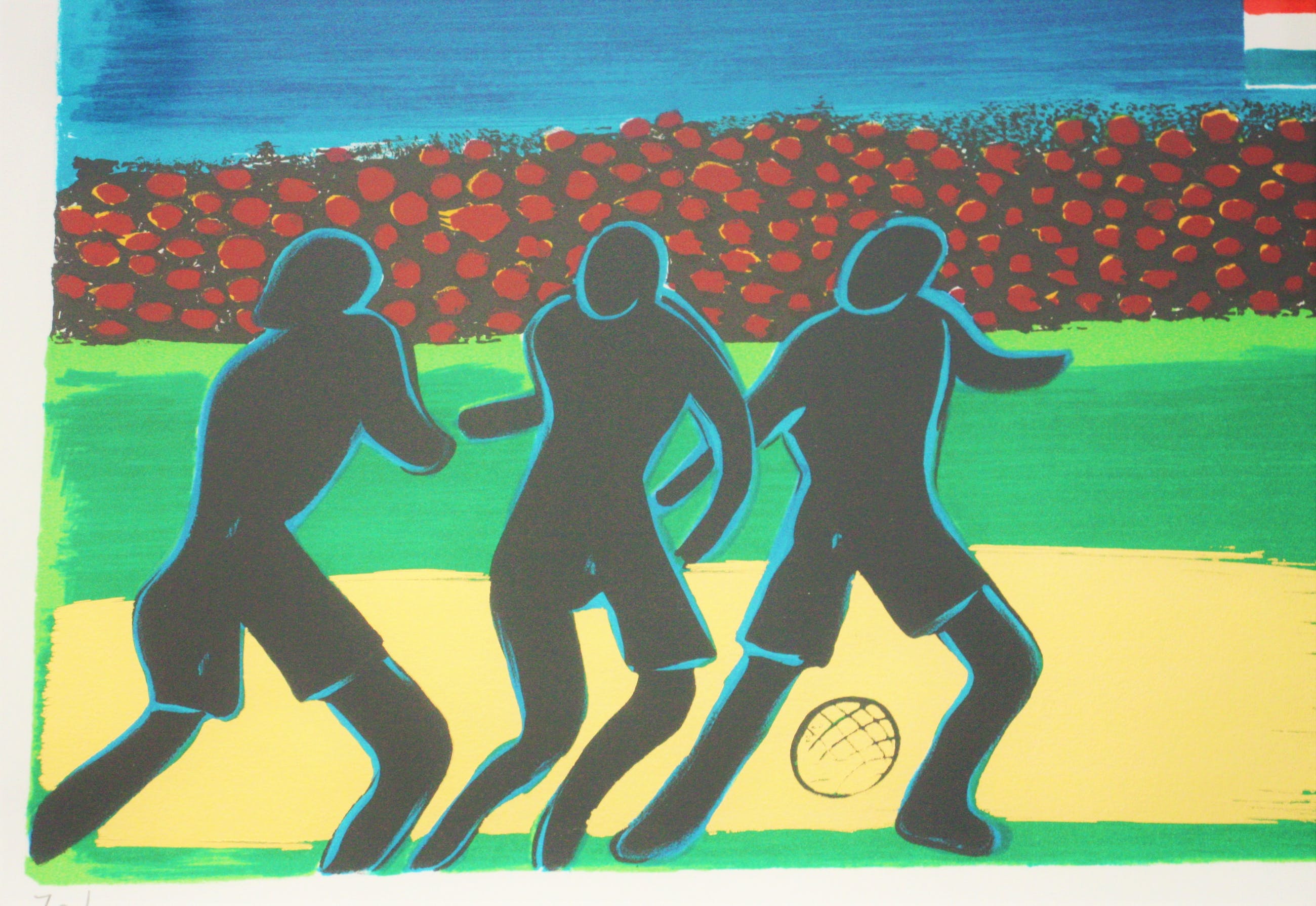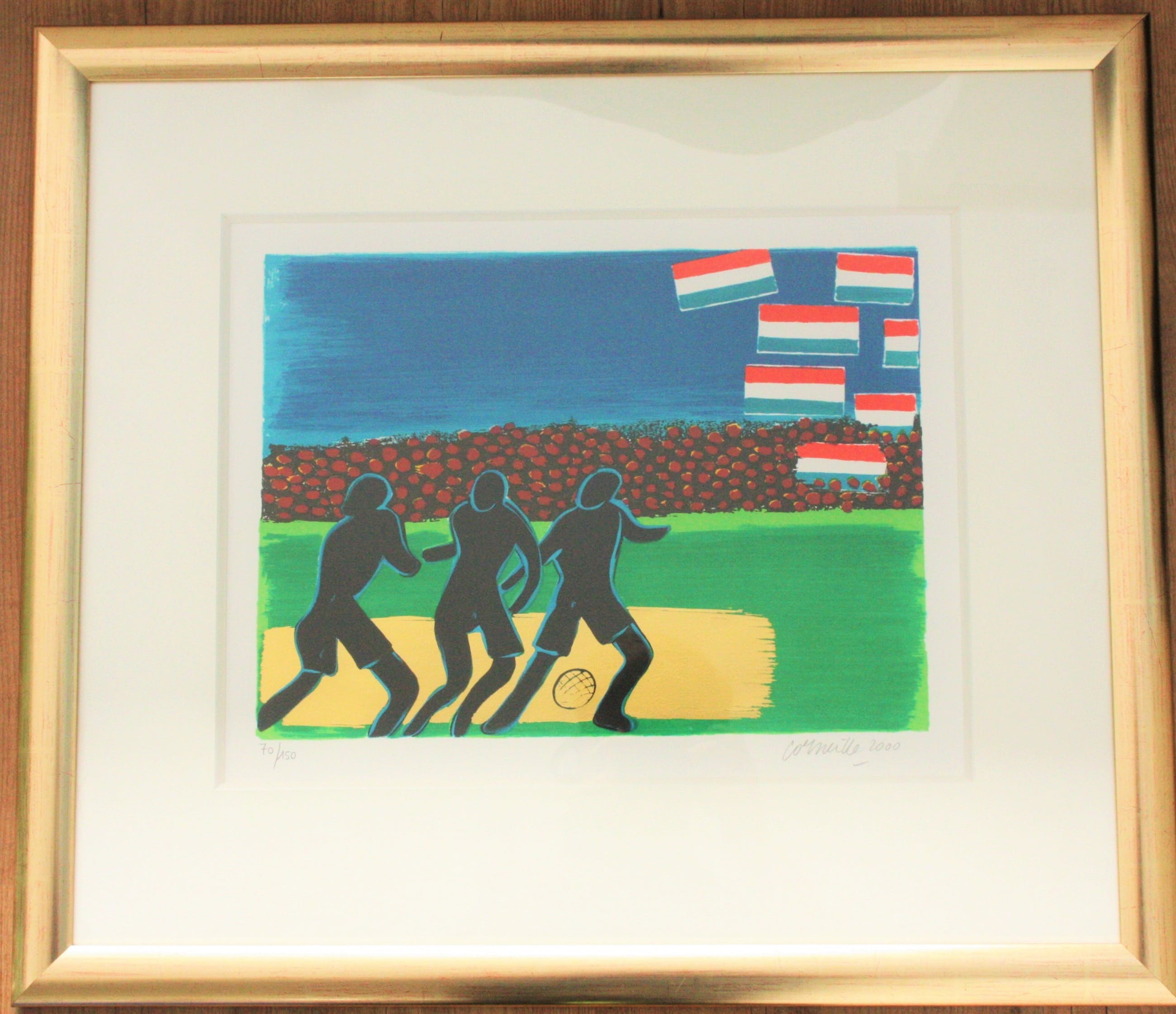 Deze zeefdruk is van de Nederlandse kunstenaar Corneille. Het werk is ten gelegenheid van het EK in 2000, gehouden in Nederland & België. Het werk is in zeer goede staat, linksonder genummerd 70/150 en rechtsonder gesigneerd en gedateerd. De zeefdruk is ingelijst in passe-partout, achter glas en in een verguld houten lijst.