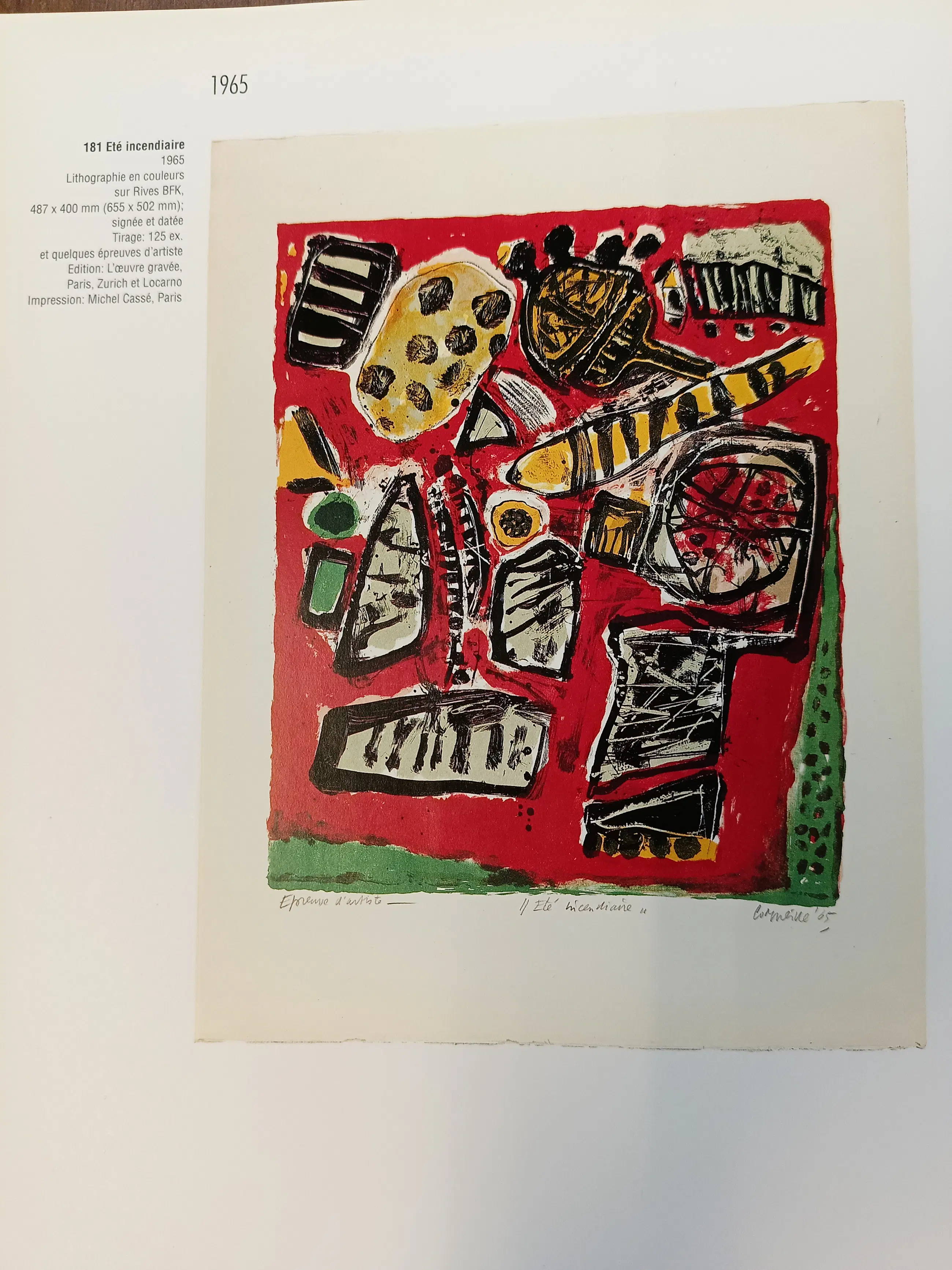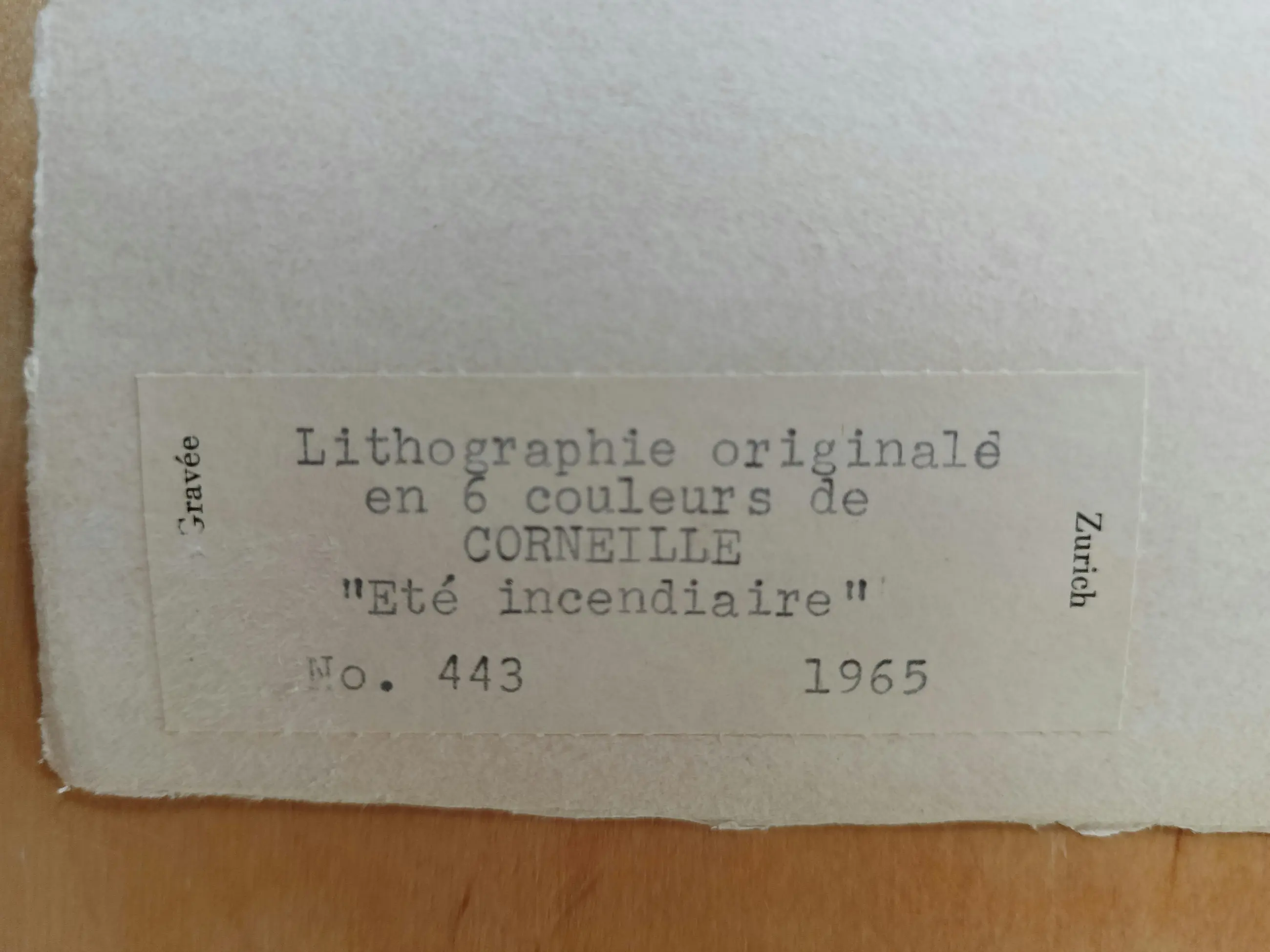 Uit de legendarische collectie van Bertil SvenssonBeleef de intense hitte en passie van de zomer in deze magistrale lithografie uit Corneille's topjaar 1965. "Été Incendiaire" - letterlijk "Zomer in Vuur en Vlam" - vangt de essentie van het seizoen in een explosie van rood, geel en turquoise.