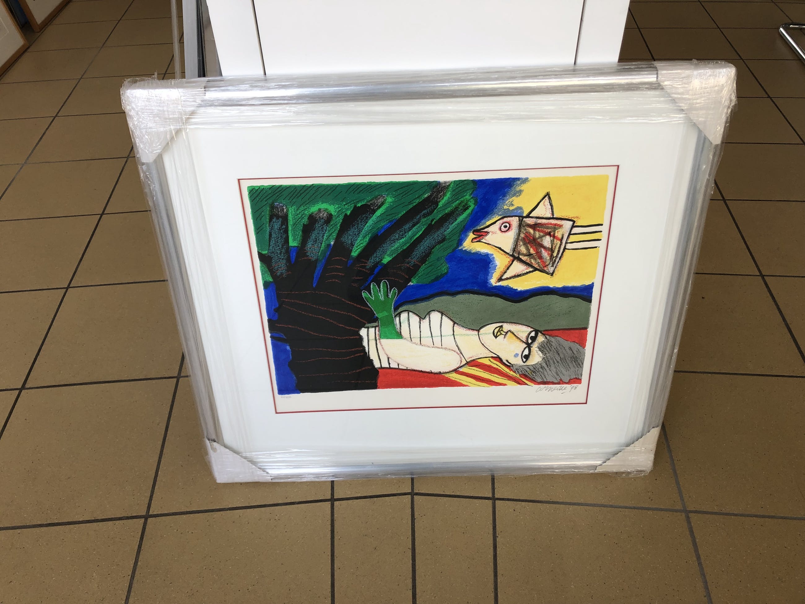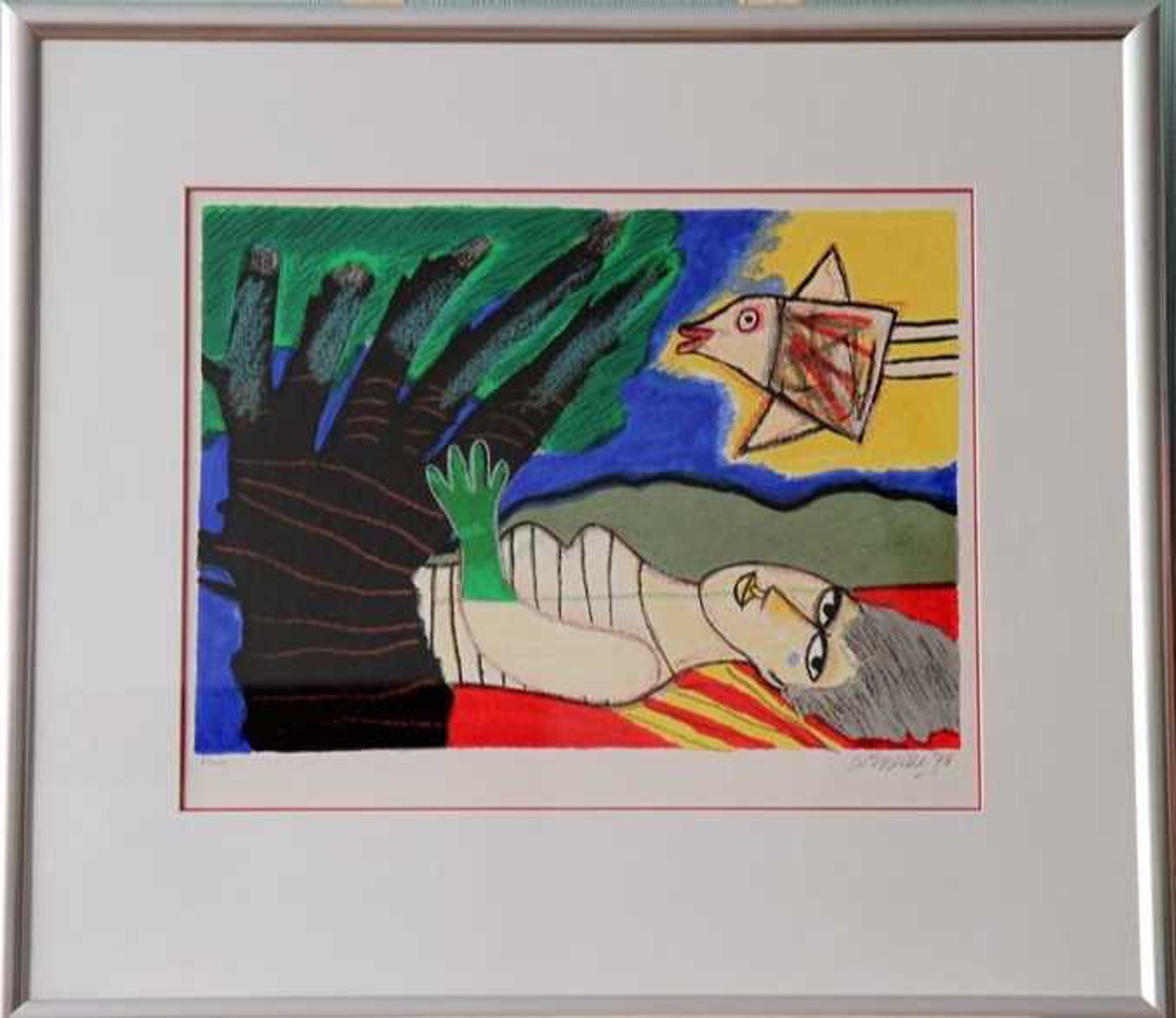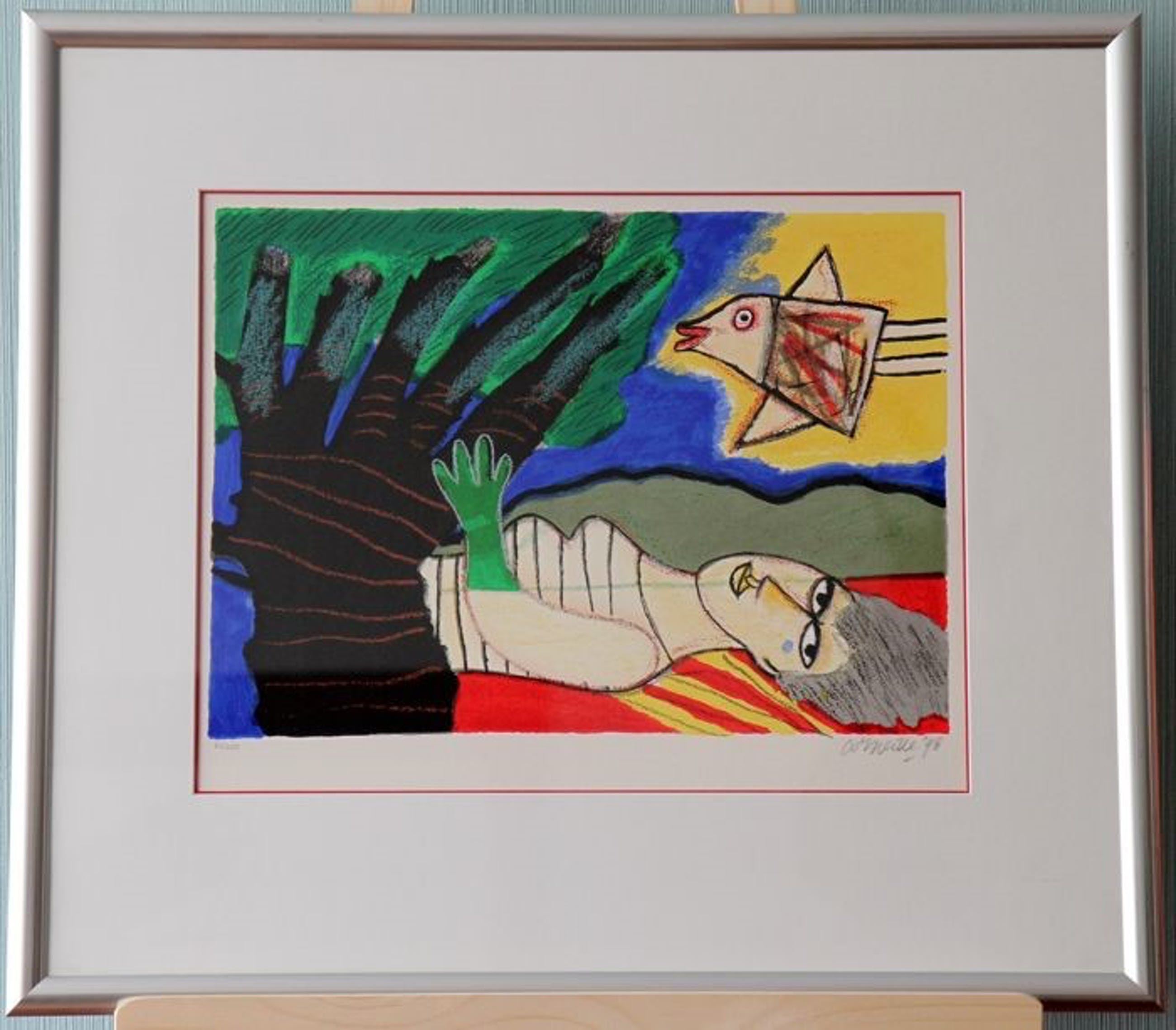 Sterk werk van Corneille uit 1998 met lijst. Het werk komt met een zuurvrij passe partout en een zilveren aluminium lijst. U kunt het werk zo ophangen.Het werk kan worden bekeken en na aankoop worden afgehaald bij galerie Rotor in Gorinchem.Werk met lijst kan ook verzonden worden per koerier of zonder lijst verzonden worden per aangetekende post.
