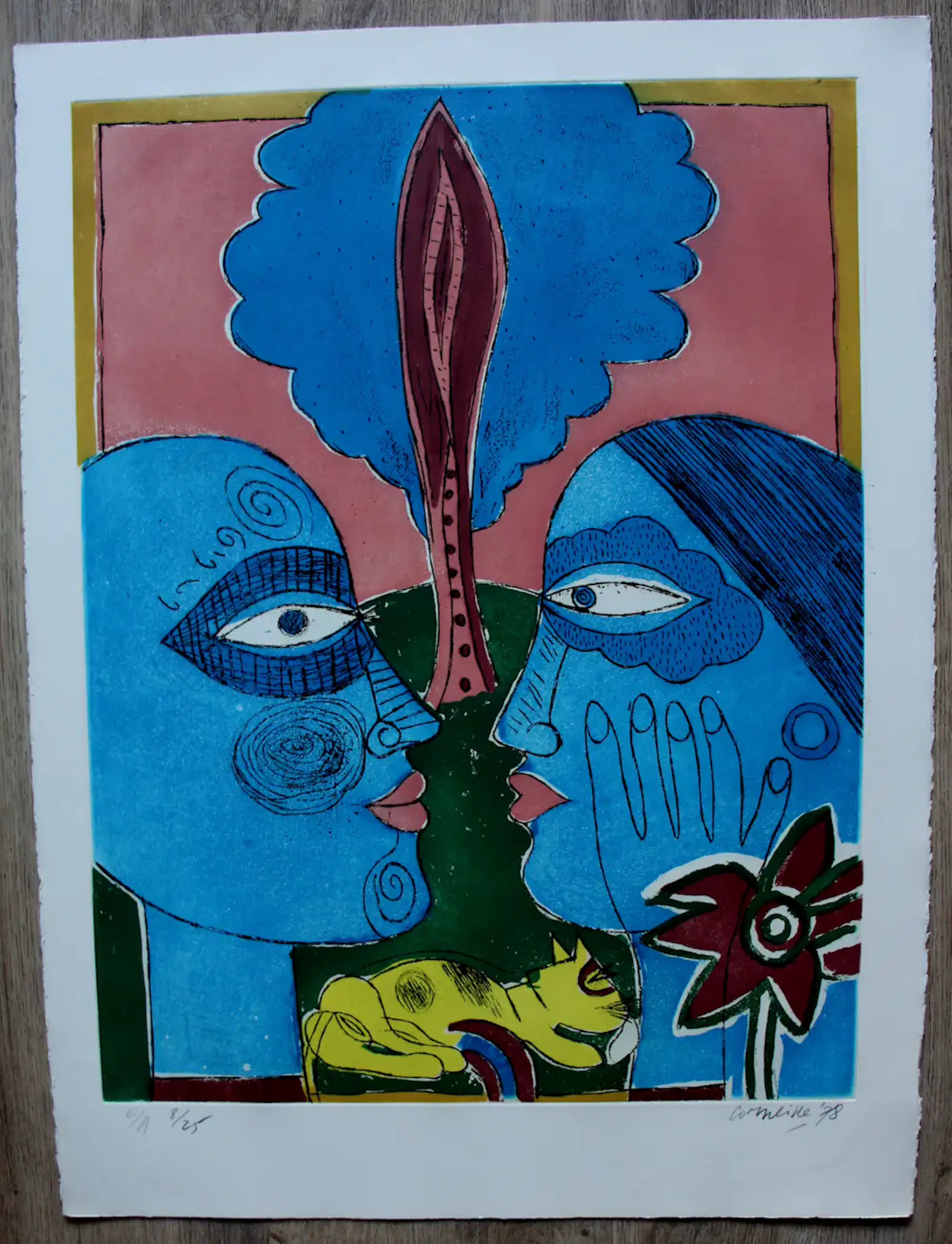 Ets van Corneille. Titel: Femme et Faune Familière. Jaar: 1978. Oplage: 8/25, E.A. Afmetingen blad: H76.5 x b56.5cm. Afmetingen voorstelling: H64 x b49cm. Het werk is, rechts onderaan, gesigneerd door de kunstenaar. De authenticiteit van het aangeboden werk wordt volledig gegarandeerd. Een certificaat van echtheid kan, op aanvraag, worden gemaild.