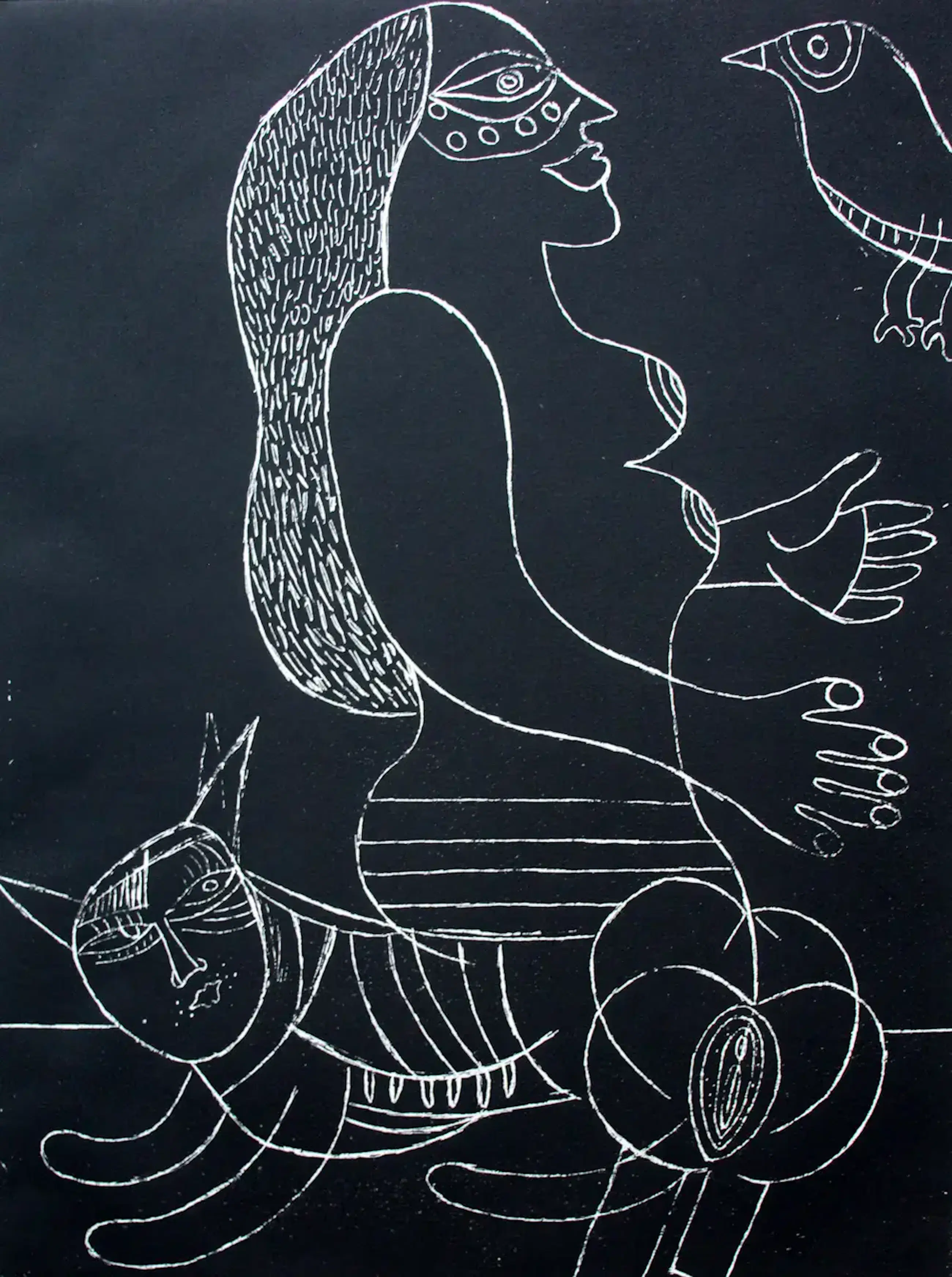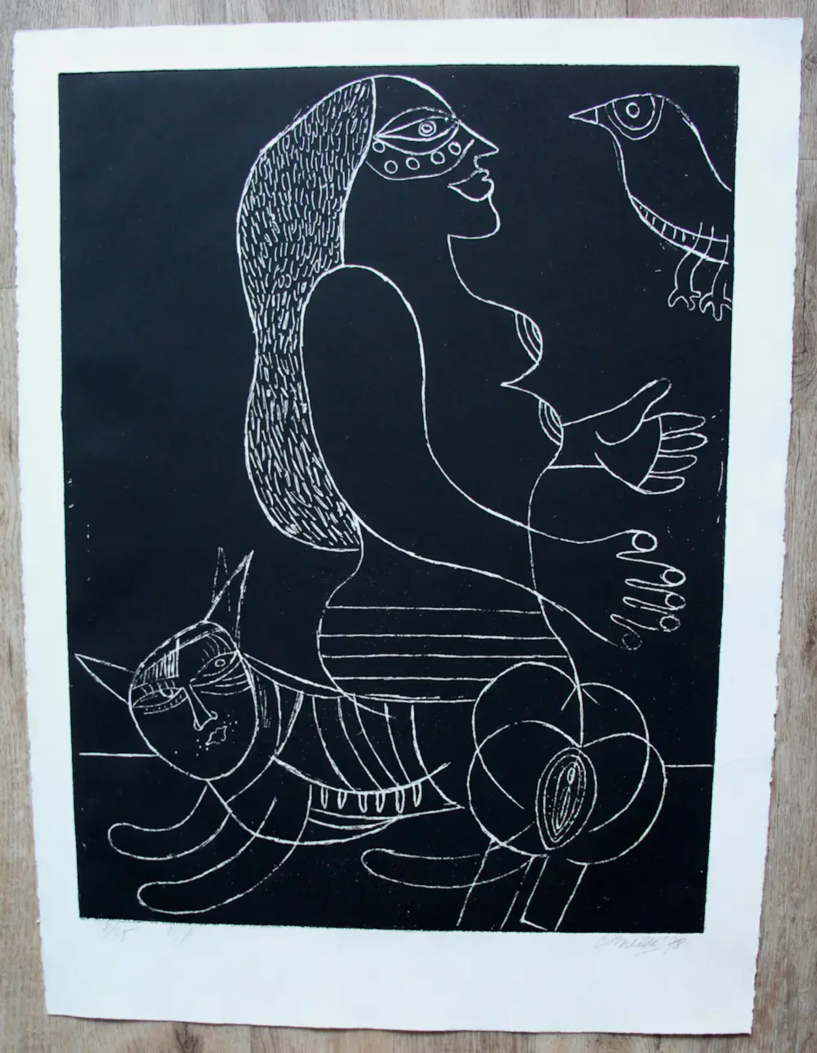Ets van Corneille. Titel: Femme et Faune Familière. Jaar: 1978. Oplage: 8/25, E.A. Afmetingen blad: H76.5 x b56.5cm. Afmetingen voorstelling: H64 x b49cm. Het werk is, rechts onderaan, gesigneerd door de kunstenaar. De authenticiteit van het aangeboden werk wordt volledig gegarandeerd. Een certificaat van echtheid kan, op aanvraag, worden gemaild.