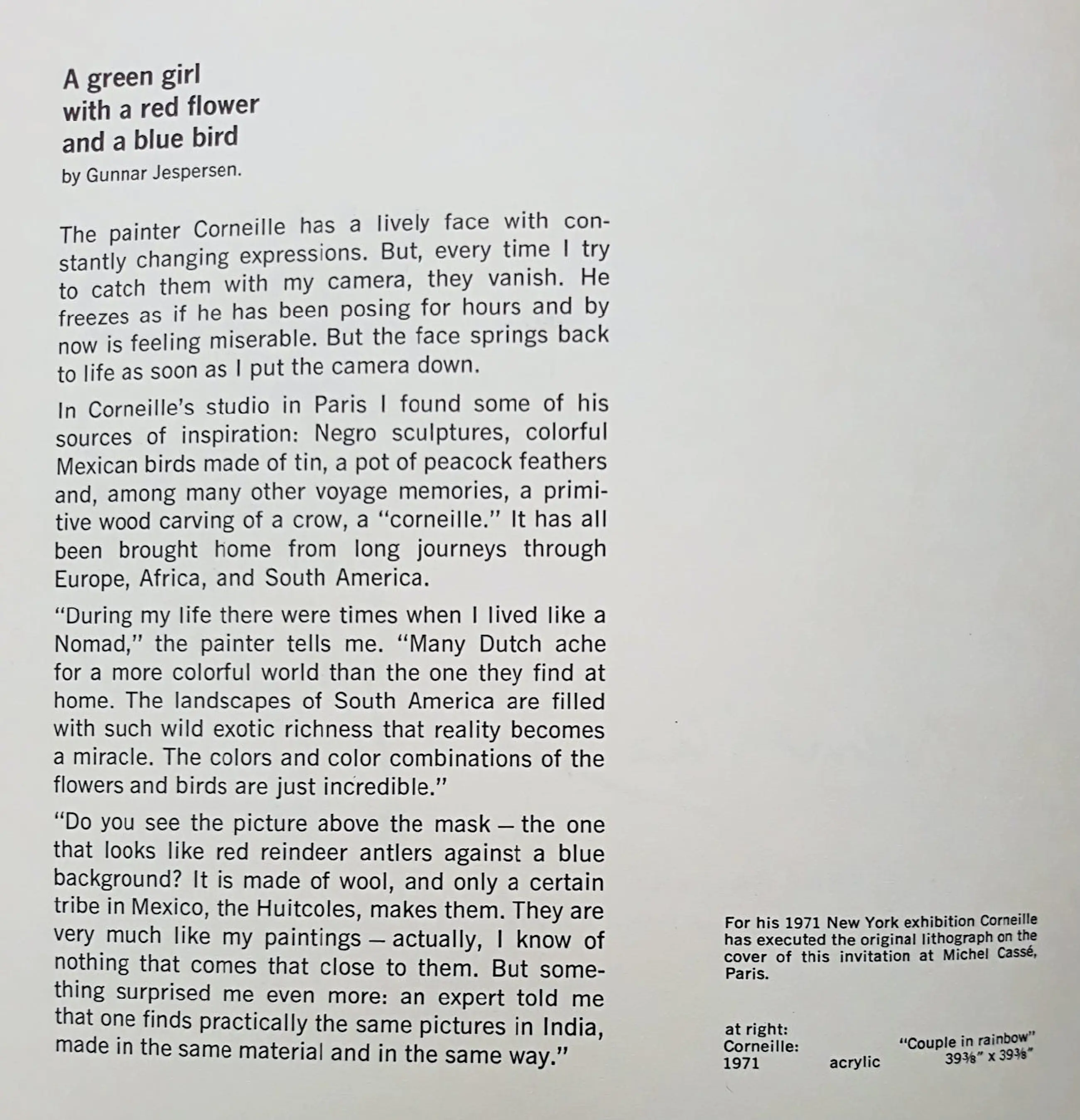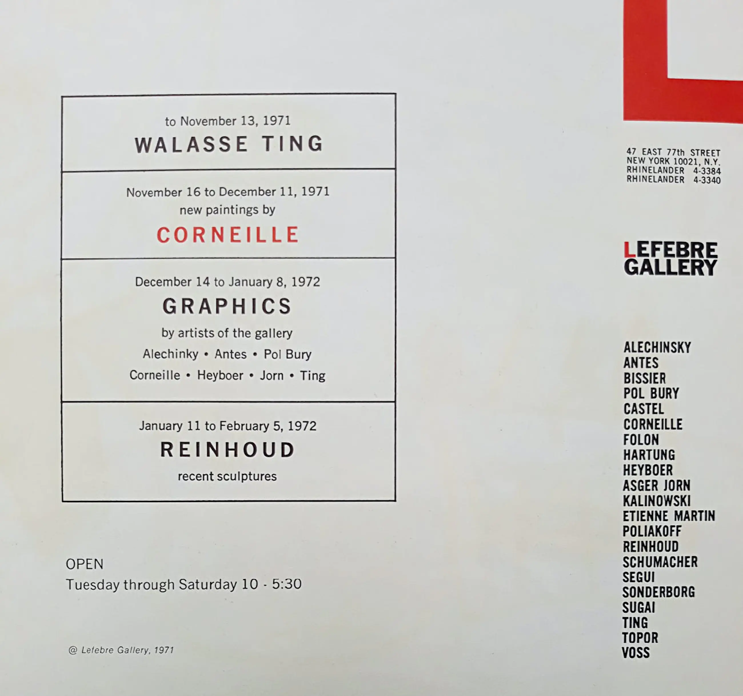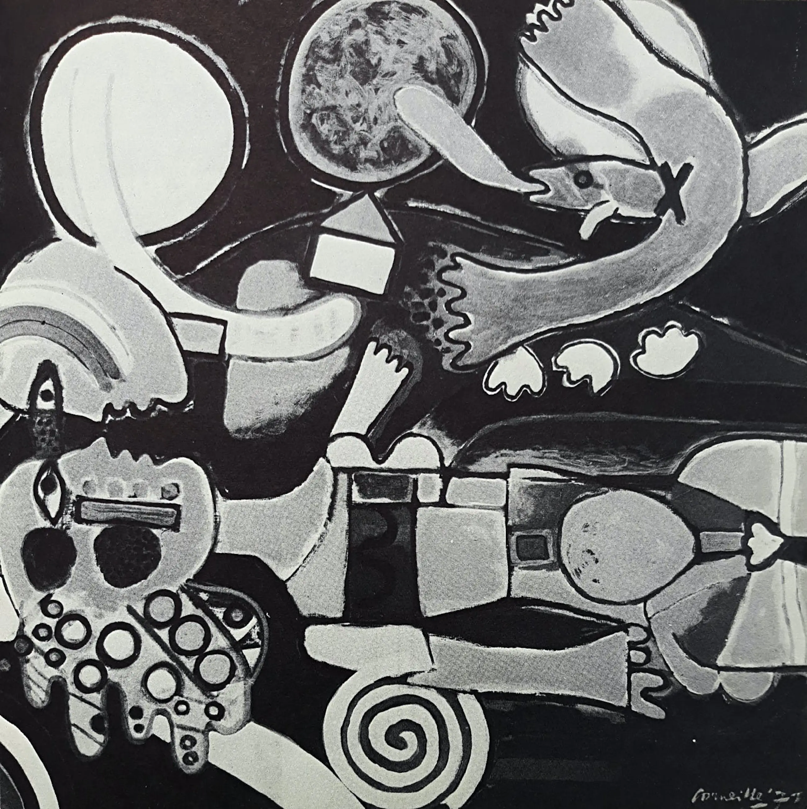 Complete publicatie met een uitklapbare litho ter gelegenheid van een expositie met nieuw werk in Galerie Lefebre (New York). Met een korte interview tekst van Corneille in gesprek met Gunnar Jespersen. In uitstekende conditie. Literatuur: Donkersloot 254 (voetnoot).