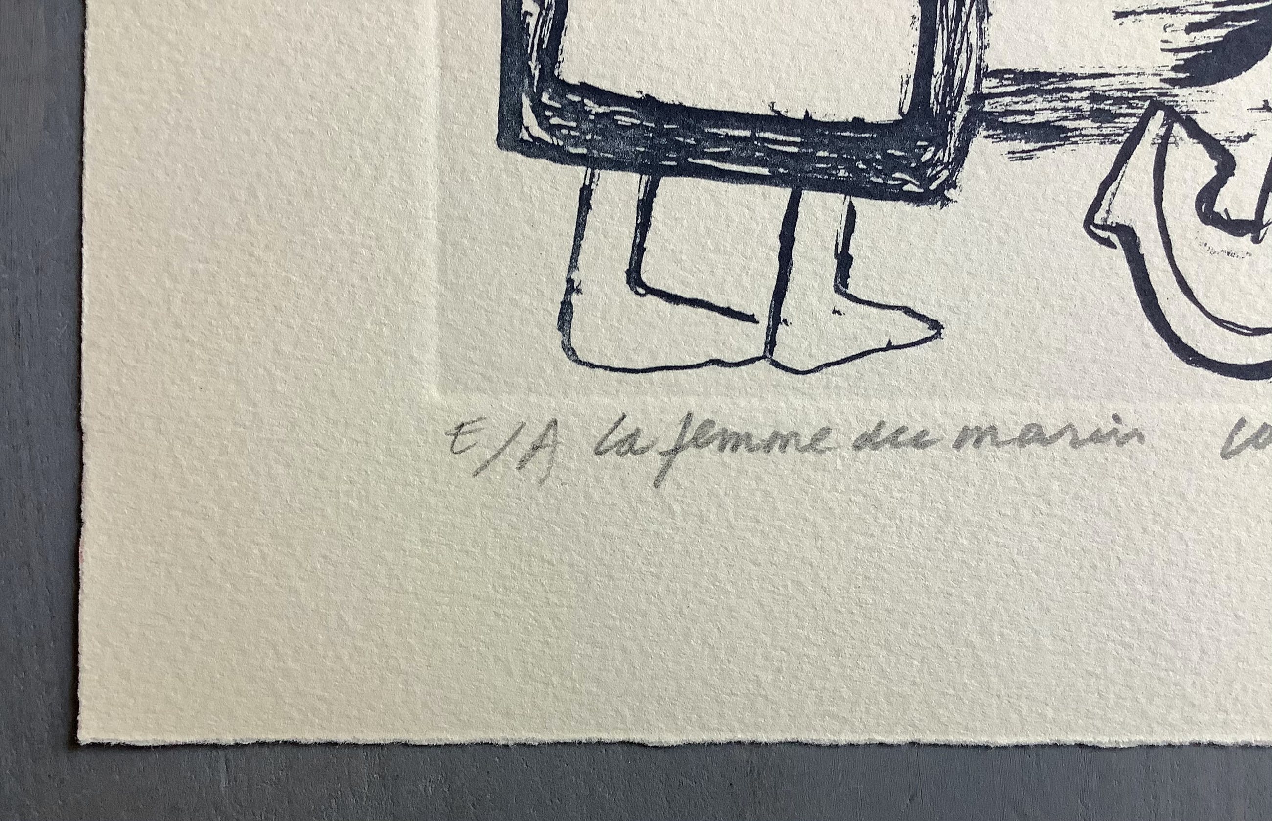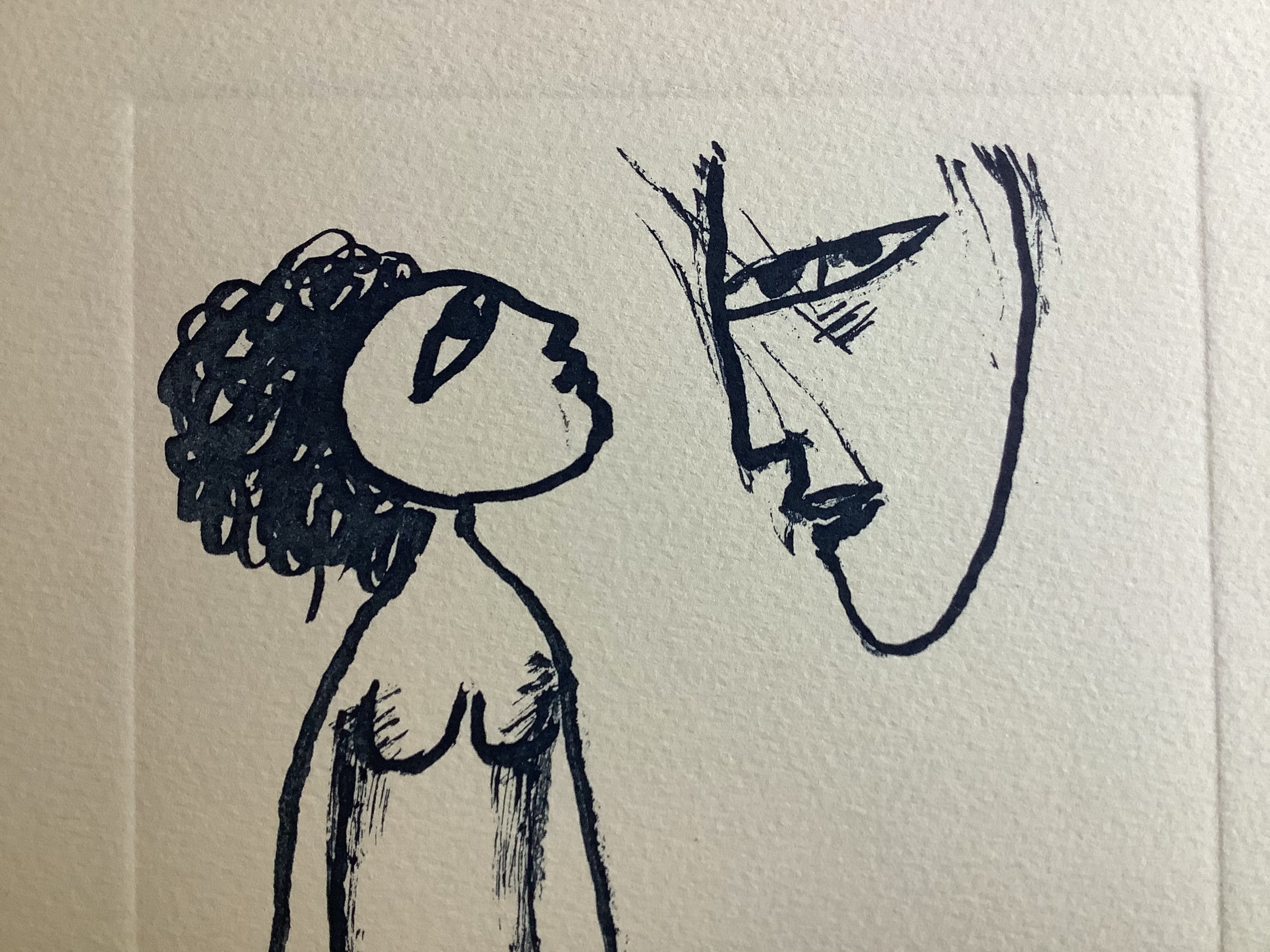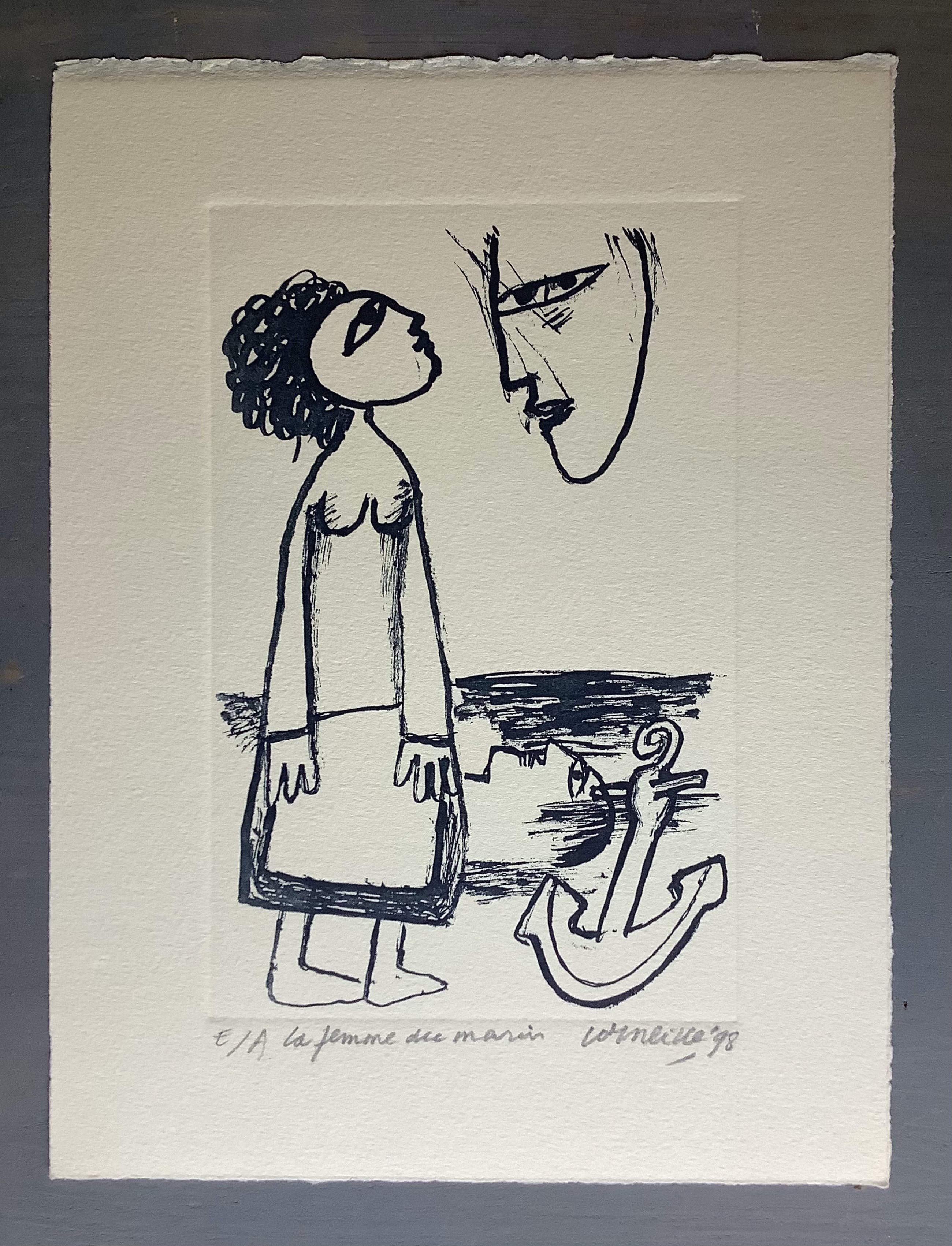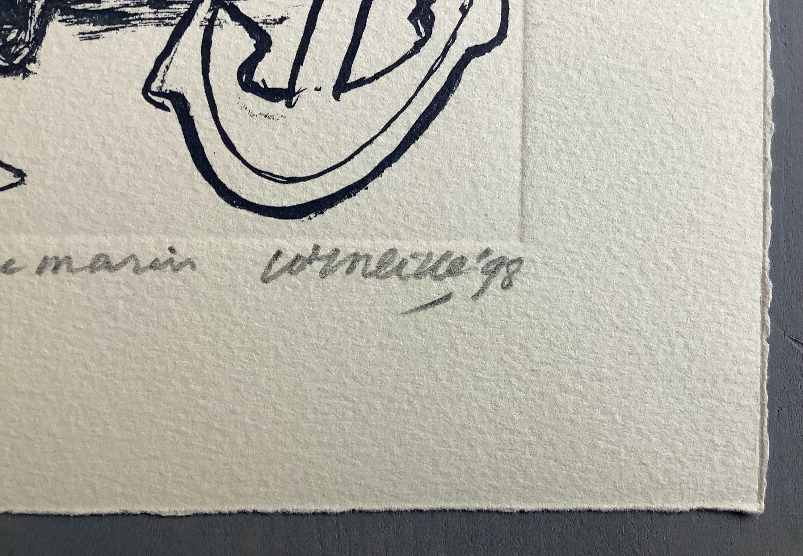 Signatuur: Handgesigneerd en door kunstenaar ondertiteld met de naam van de litho. Wordt niet vaak aangeboden. Meeste aanbiedingen zonder naam van het kunstwerk. Betreft een van de 6 litho’s die Corneille heeft gemaakt uit een boek van Gérard Voisin, "Uit je handen verliet de leegte"Editie: EA