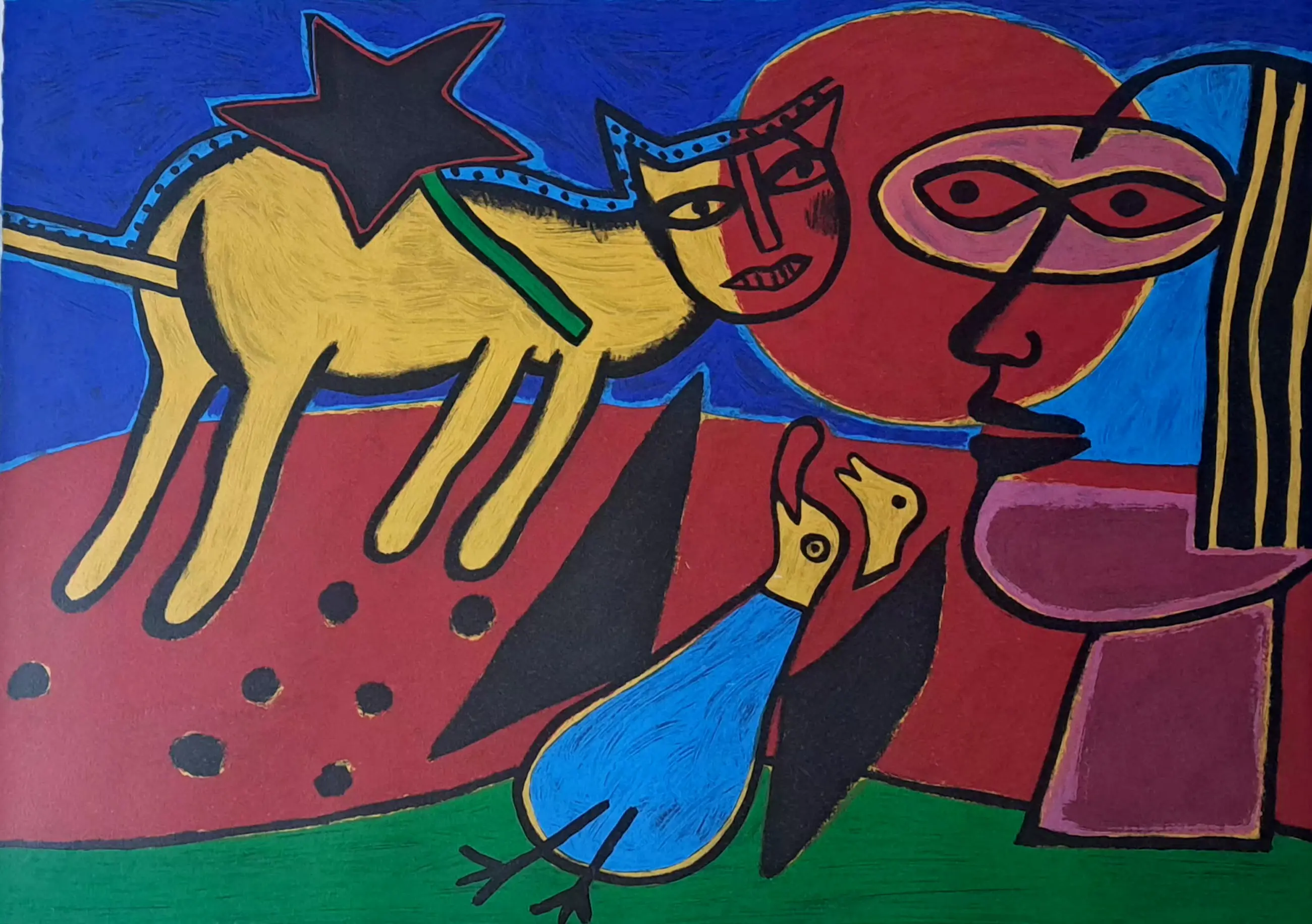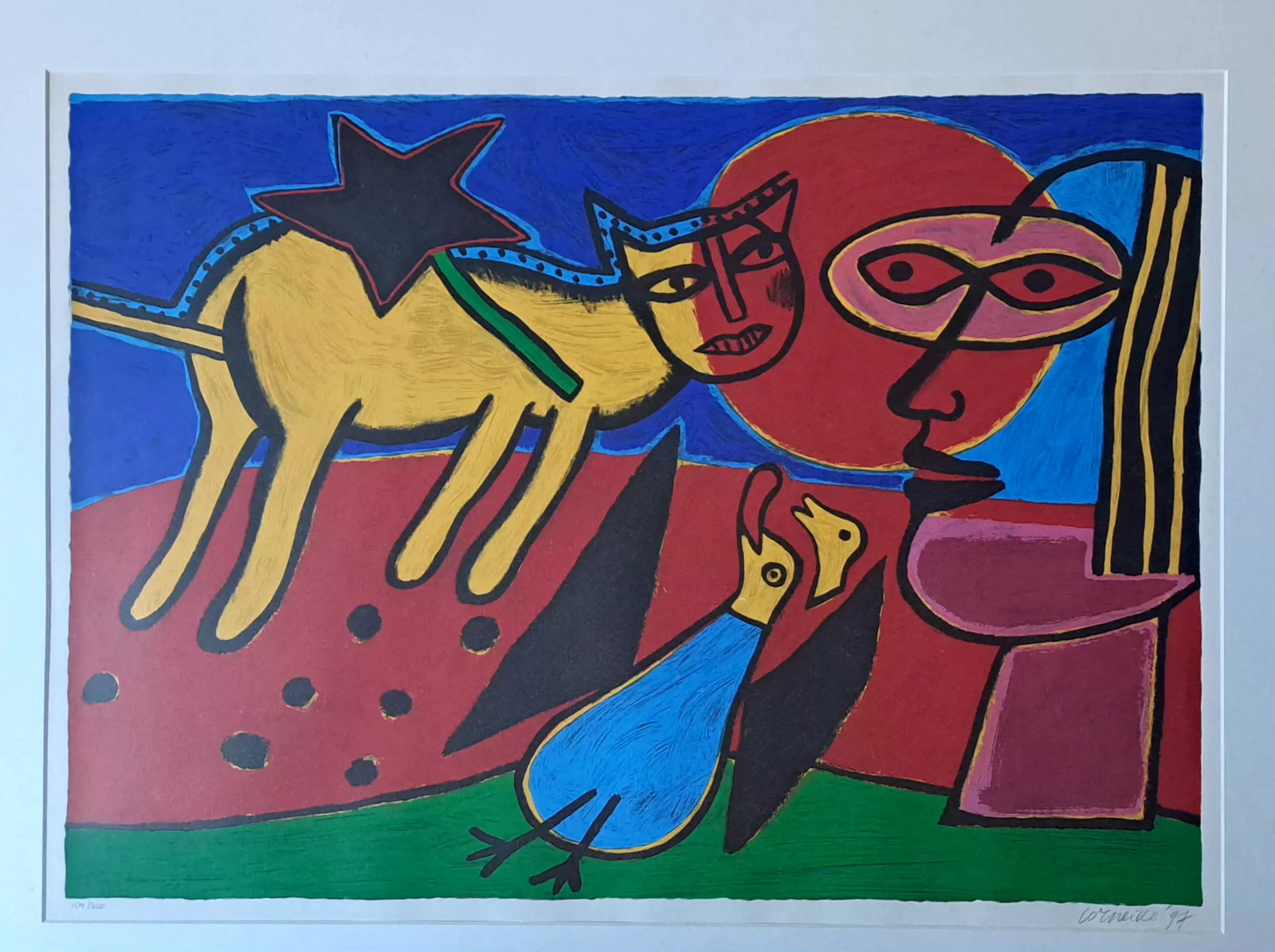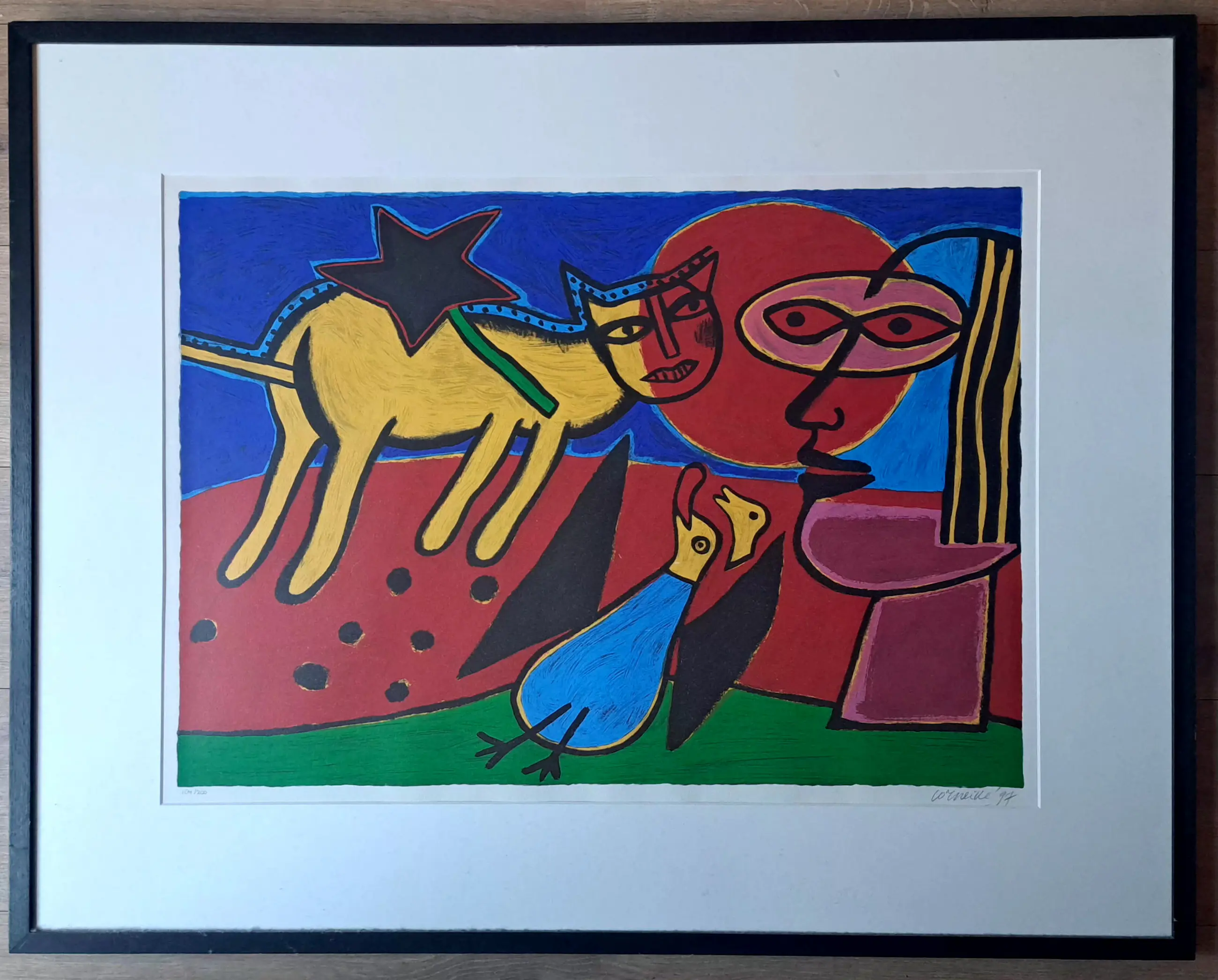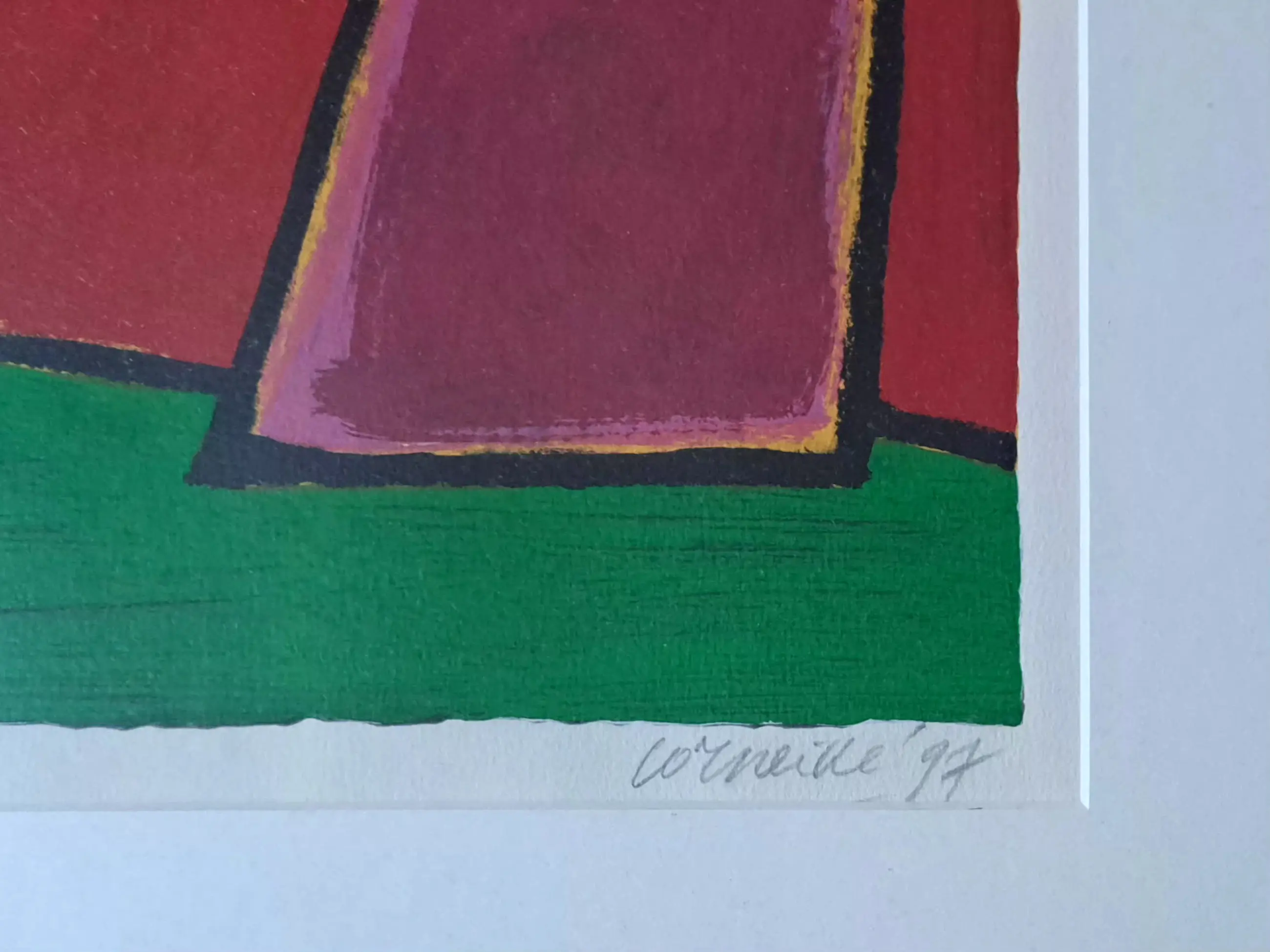 Kleurrijk werk van CoBrA-kunstenaar Corneille. Ingelijst in een zwarte houten lijst en voorzien van een Passe-partout. Afmetingen inclusief lijst 98 × 77 cm.
