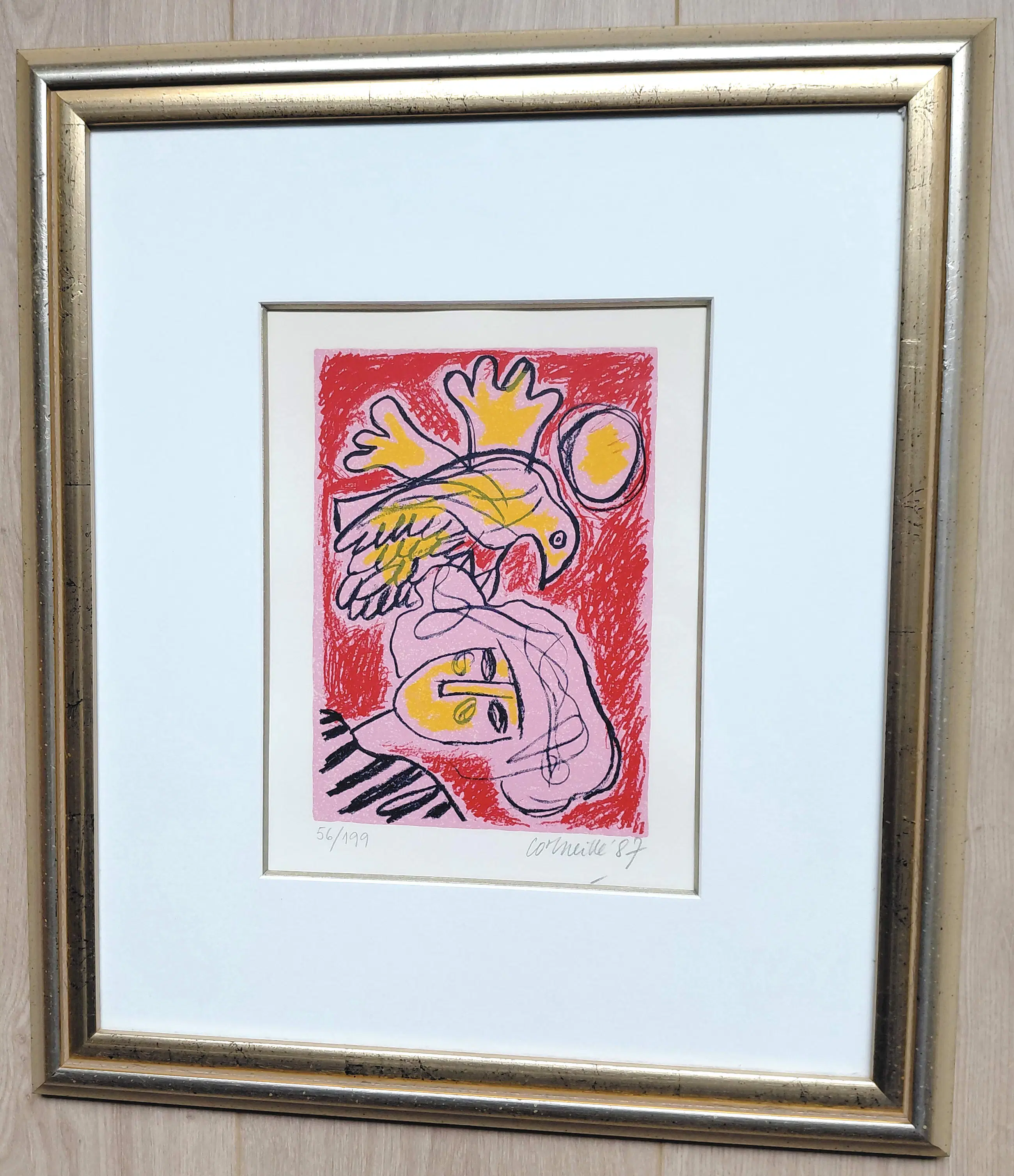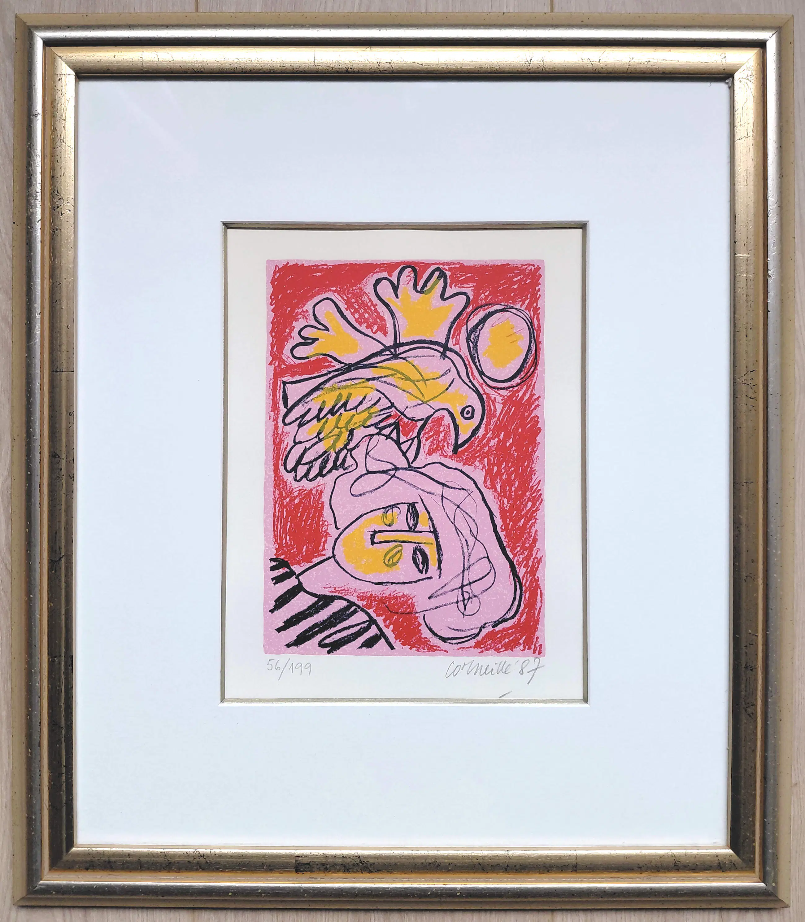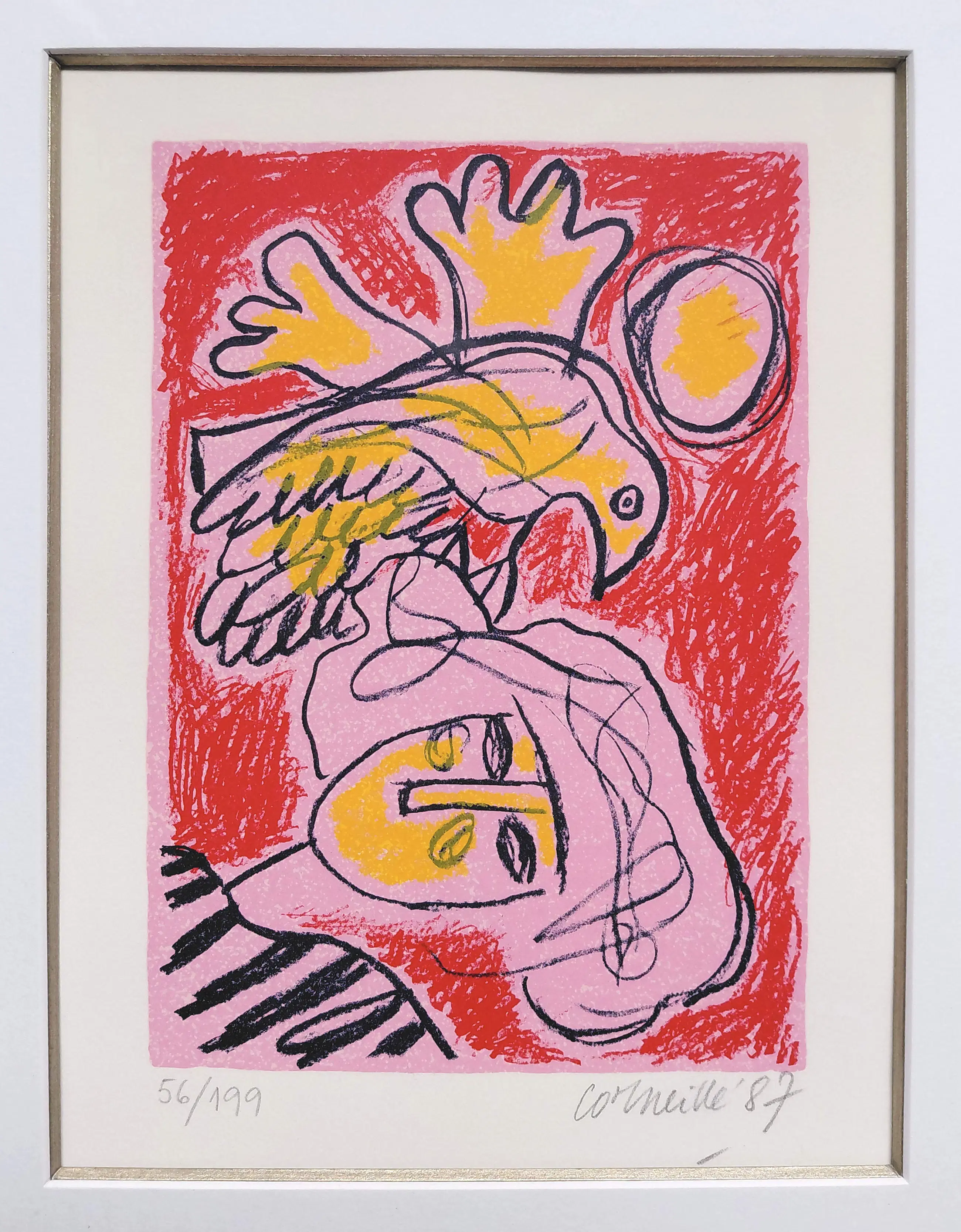 Zeer mooi werk van Corneille uit 1987. Zeefdruk op geschept papier, met potlood gesigneerd, gedateerd en genummerd (56/199). Prachtig ingelijst door Encadreur Eduard van Hulsen (Amsterdam), achter glas en luxueus, zuurvrij passe-partout. Alles in uitstekende conditie.